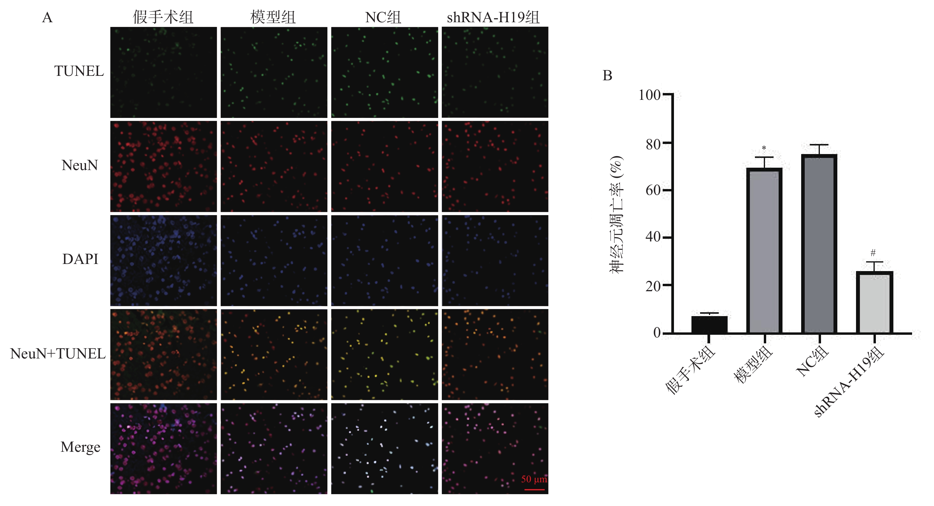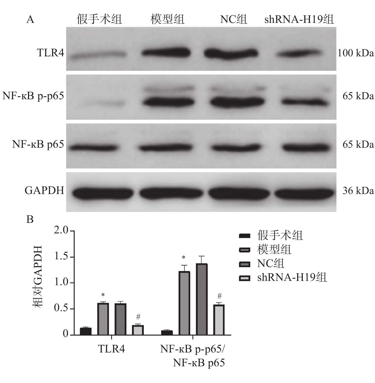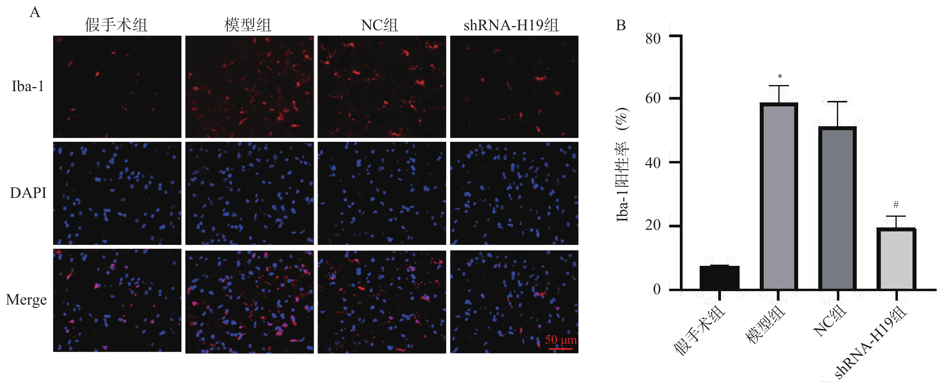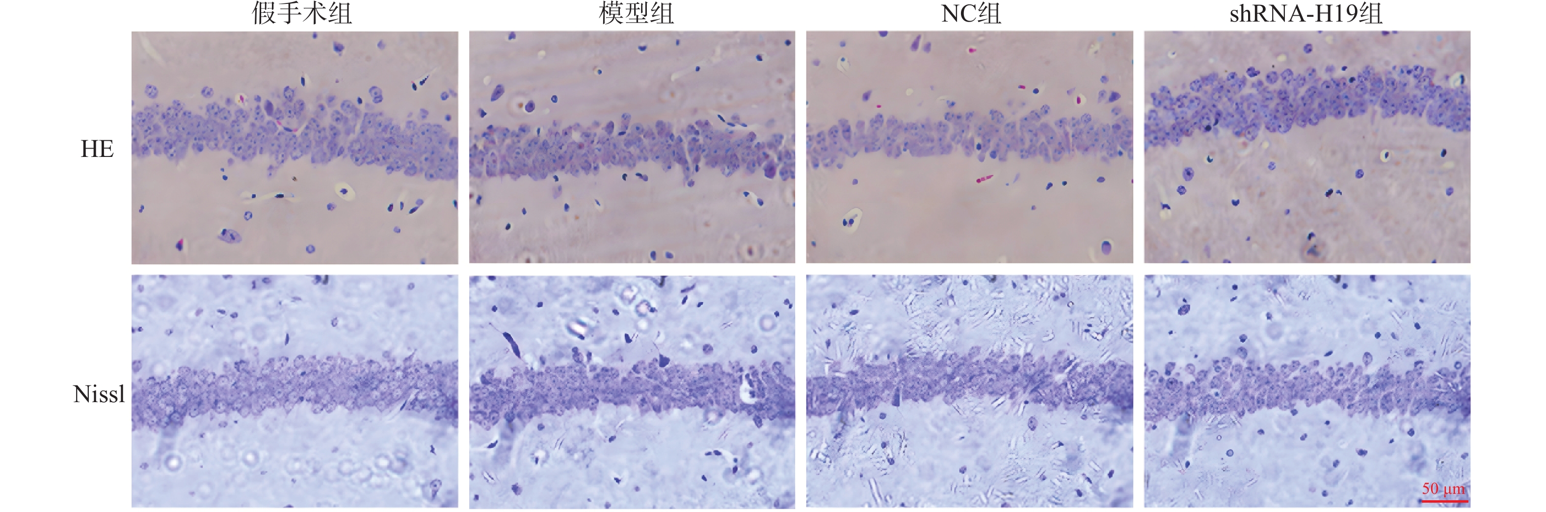 目的 探讨长非编码RNA(long non-coding RNA,lncRNA)H19(简称H19)对血管性痴呆(vascular dementia,VD)模型神经炎症及认知功能的作用。 方法 采用双侧颈总动脉闭塞构建VD小鼠模型,48只小鼠随机均分为假手术组、模型组、NC组和shRNA-H19组,其中假手术组不结扎。造模成功后,NC组和shRNA-H19组小鼠脑内分别注射AAV2/1-shRNA-空载、AAV2/1-shRNA-H19。水迷宫法观察小鼠认知水平;HE和Nissl染色观察海马CA1区病理及神经元损伤情况;TUNEL染色检测神经元凋亡;酶联免疫吸附测定(enzyme-linked immunosorbent assay,ELISA)法检测海马组织肿瘤坏死因子-α(tumor necrosis factor-α,TNF-α)、白细胞介素(interleukin,IL)-1β、IL-6水平;免疫荧光染色检测海马CA1区离子钙结合衔接分子1(ionized cacium-binding adapter molecule-1,Iba-1)蛋白表达;实时荧光定量聚合酶链式反应(quantitative real-time polymerase chain reaction,qRT-PCR)和(或)Western blot法检测海马组织H19、B细胞淋巴瘤-2(Bcl-2)、活化的胱天蛋白酶-3(cleaved Caspase-3)、Toll样受体4(toll-like receptor 4,TLR4)、核因子-κB(nuclear factor-kappa B,NF-κB)蛋白和(或)mRNA表达。 结果 与模型组比较,shRNA-H19组小鼠认知能力升高(P < 0.05),海马CA1区病理及神经元损伤减轻,海马组织Bcl-2水平升高,神经元凋亡率、H19、TNF-α、IL-1β、IL-6、Iba-1、cleaved Caspase-3、TLR4、NF-κB p-p65/NF-κB p65水平均降低(P < 0.05);而NC组上述指标均无显著性差异(P > 0.05)。 结论 抑制海马组织H19表达可改善VD小鼠神经炎症和认知功能,抑制海马CA1区神经元凋亡及小胶质细胞浸润,其机制可能与下调TLR4/NF-κB p65通路相关。