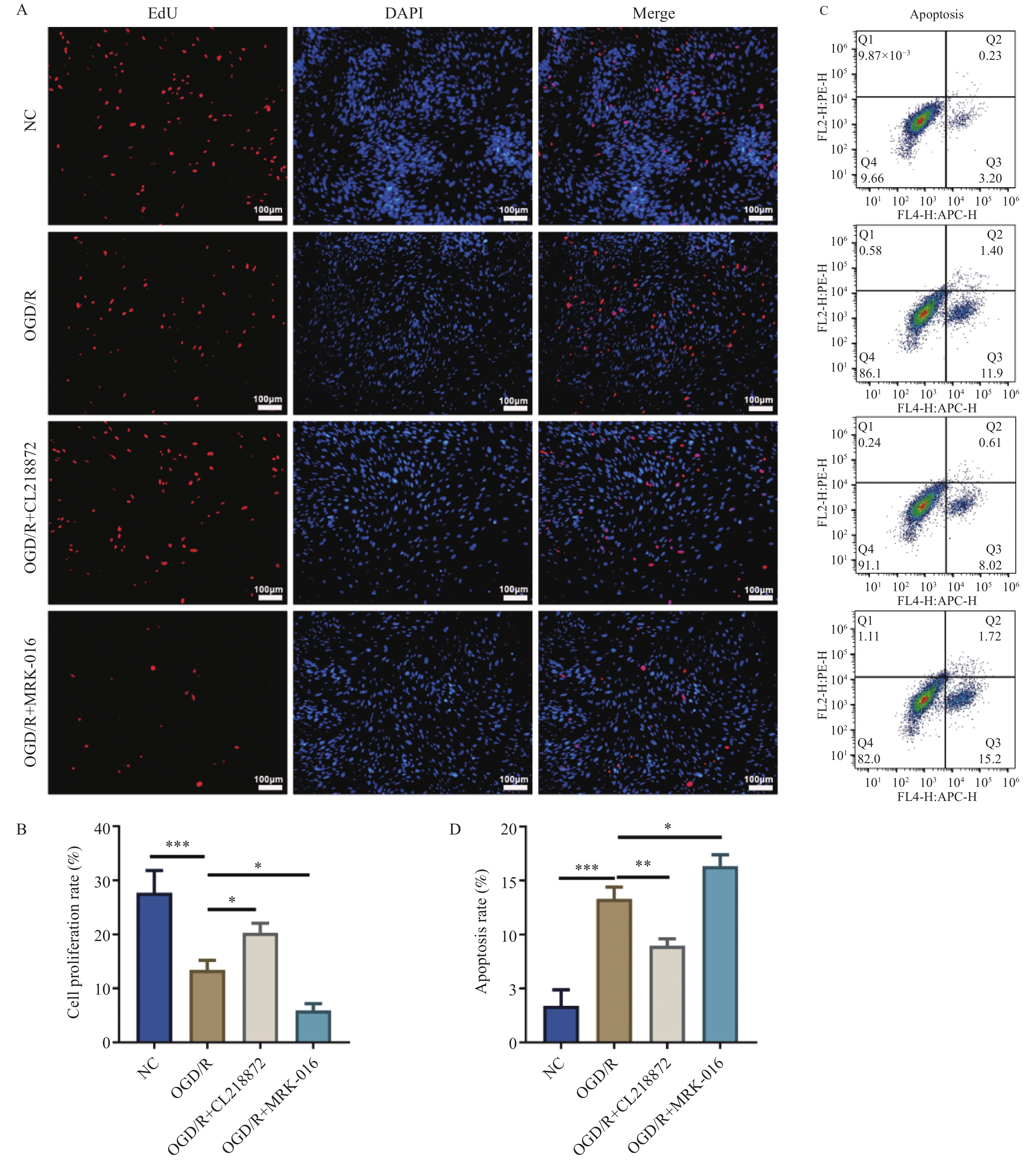 目的 探讨γ-氨基丁酸A型受体(γ-aminobutyric acid type A receptor,GABA_AR)对氧糖剥夺/复氧(oxygen-glucose deprivation/reoxygenation,OGD/R)诱导的星形胶质细胞损伤的保护作用及潜在机制。 方法 采用C8-D1A星形胶质细胞建立OGD/R损伤模型,随机分为正常对照组(NC)、OGD/R模型组、GABA_AR激动剂CL218872干预组(OGD/R+CL218872)及抑制剂MRK-016干预组(OGD/R+MRK-016)。通过EdU染色法检测细胞增殖;流式细胞术分析细胞凋亡;免疫荧光染色检测GABA_AR及胶质纤维酸性蛋白(glial fibrillary acidic protein,GFAP)的表达;Western blot法检测脑源性神经营养因子(brain-derived neurotrophic factor,BDNF)的表达。 结果 与OGD/R组比较,OGD/R+CL218872组细胞增殖率显著增强(P < 0.05),凋亡率明显降低(P < 0.01),GABA_AR与GFAP表达均上调(P < 0.05),BDNF蛋白表达水平显著升高(P < 0.05),炎症因子IL-6(P < 0.01)与TNF-α(P < 0.05)水平显著减少。而OGD/R+MRK-016组各指标均呈相反变化。 结论 GABA_AR激活可通过促进星形胶质细胞增殖、抑制其凋亡与炎症反应,并上调BDNF与GFAP的表达,从而减轻OGD/R诱导的细胞损伤。