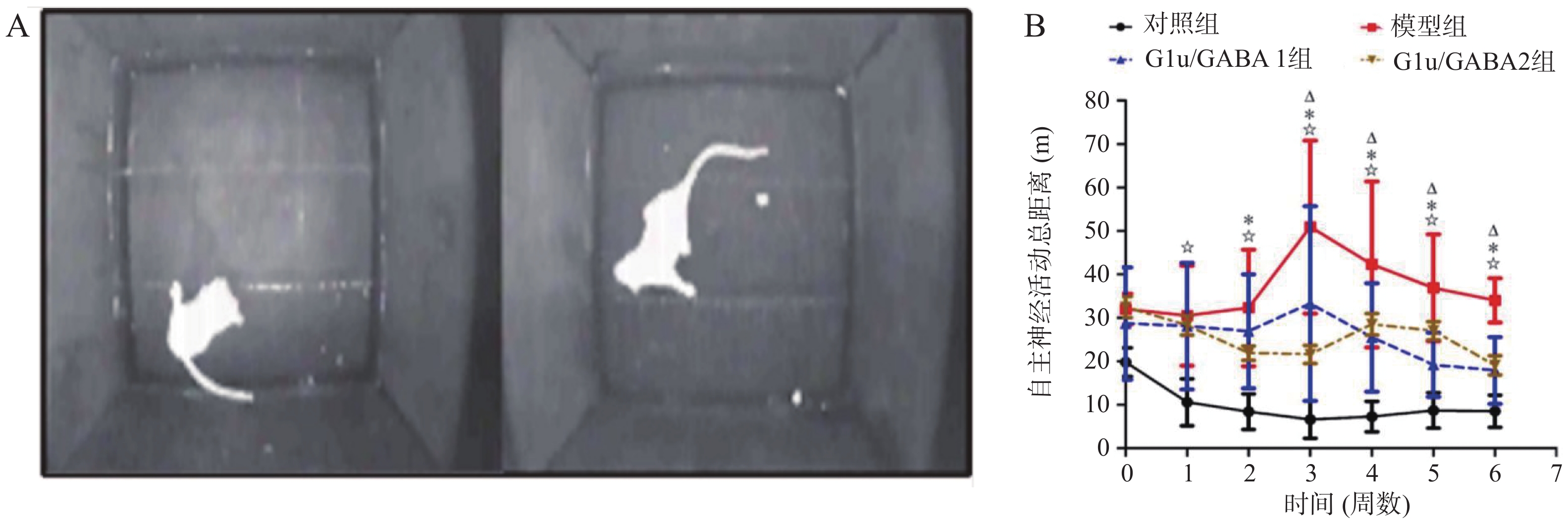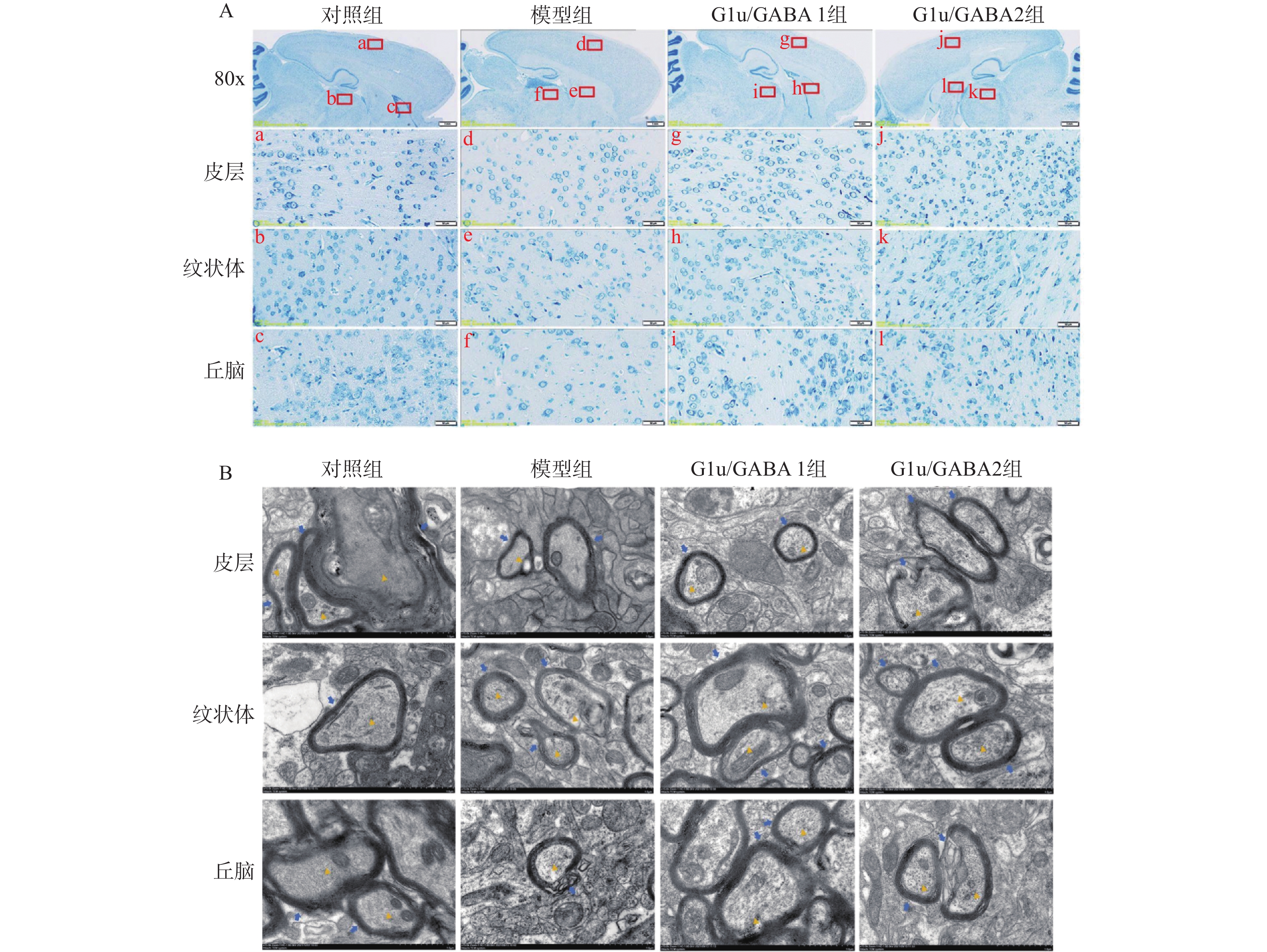 目的 基于Glu/GABA调节神经递质平衡改善抽动秽语综合征(Tourette syndrome,TS)大鼠模型行为异常的机制研究。 方法 选用 48 只 SPF 级 SD 大鼠,随机分为正常对照组、模型组、Glu/GABA 1 组(10 mg/kg)和 Glu/GABA 2 组(20 mg/kg),每组 12 只。除正常对照组外,其余大鼠腹腔注射 250 mg/(kg·d)IDPN 连续 7 d建立 TS 模型,造模成功后各组灌胃干预 6 周。分别于干预前、第 3 周、第 6 周采用盲法进行刻板行为评分,通过自发活动视频系统检测自主活动总距离。干预结束后取材,HE 染色计数皮层、纹状体、丘脑神经元数量,透射电镜观察髓鞘形态;高效液相色谱法检测脑组织 Glu 和 GABA 水平,免疫荧光法测定其荧光强度,以探究 Glu/GABA 对 TS 模型大鼠的影响。 结果 模型组及 Glu/GABA 干预组大鼠刻板行为评分、自主活动总距离均显著高于正常对照组(P < 0.05)。干预 6 周后,Glu/GABA 1 组和 2 组刻板行为评分、自主活动总距离较模型组显著降低(P < 0.001),且两组间无统计学差异(P > 0.05)。模型组皮层、纹状体、丘脑神经元数量减少,髓鞘板层疏松、轴突破坏;Glu/GABA 干预后神经元数量恢复(P < 0.01),髓鞘结构改善。与正常组相比,模型组脑内 Glu 水平及荧光强度显著升高、GABA 显著降低(P < 0.01);Glu/GABA 干预可逆转上述变化(P < 0.01)。 结论 Glu/GABA可有效降低TS模型大鼠刻板行为评分和自主活动距离,修复皮层、纹状体及丘脑的神经元损伤与髓鞘异常,调节脑内Glu和GABA水平至正常平衡状态,发挥对TS的治疗作用。