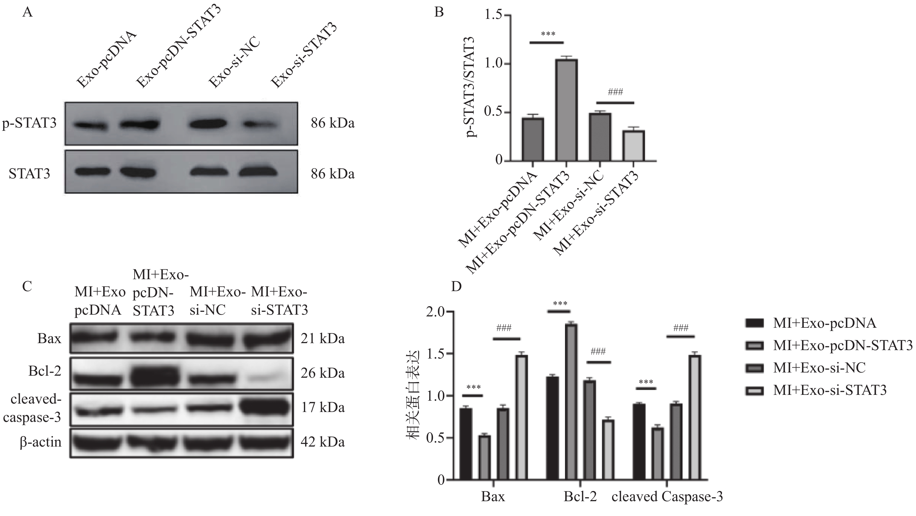 目的 探讨骨髓间充质干细胞(bone marrow derived mesenchymal stem cell,BMSCs)来源外泌体(exosome,Exo)通过传递信号转导和转录激活因子3(signal transduction and transcriptional activator 3,STAT3)蛋白在心肌梗死(myocardial infarction,MI)中的作用。 方法 建立左冠状动脉前降支结扎的MI大鼠模型,随机分为Sham组、MI组及BMSCs-Exo组;另设Exo-pcDNA、Exo-pcDNA-STAT3、Exo-si-NC、Exo-si-STAT3组,研究上调或抑制Exo中STAT3表达对心功能的影响。于术后2周和4周检测大鼠心电图(electrocardiogram,ECG)、血流动力学参数,包括左心室收缩压(left ventricular systolic pressure,LVSP)、左心室舒张末期压力(left ventricular end-diastolic pressure,LVEDP)以及左心室最大上升速度(maximum rate of pressure rise in left ventricle,+dp/dtmax)和左心室最大下降速度(maximum rate of pressure decline in left ventricle,−dp/dtmax)。采用免疫蛋白印迹法免疫印迹(western blot,WB)检测心肌组织中相关蛋白表达水平,包括磷酸化信号转导与转录激活因子3(phosphorylated signal transducer and activator of transcription 3,p-STAT3)、B细胞淋巴瘤-2蛋白(b-cell lymphoma-2,Bcl-2)、Bcl-2相关X蛋白(bcl-2-associated X protein,Bax)以及切割型半胱天冬酶-3(cleaved caspase-3)。 结果 与MI组相比,BMSCs-Exo组ST段、QRS波和QT间期显著恢复(F = 23.462,P < 0.001),心律失常发生率降低(χ2 = 7.248,P = 0.009);同时LVEDP降低、LVSP及±dp/dtmax改善(F = 19.601,P < 0.001)。在转染组中,与Exo-pcDNA组相比,Exo-pcDNA-STAT3组S波振幅升高(P < 0.05),心律失常发生率下降至37.5%;与Exo-si-NC组相比,Exo-si-STAT3组QT间期延长、T波加宽、S波振幅下降(F = 30.592,P < 0.001),心律失常率升至87.5%。心功能检测显示,Exo-pcDNA-STAT3组LVEDP降低(F = 14.937,P < 0.001),而Exo-si-STAT3组ASBP、LVSP和+dp/dtmax升高(F = 16.213,P < 0.001),提示心负荷增加。WB结果显示,Exo-pcDNA-STAT3组p-STAT3与Bcl-2蛋白表达上调,而Bax及Cleaved-caspase-3下调(F = 331.518、901.008、545.635和516.670,P < 0.001);相反,Exo-si-STAT3组呈相反趋势。 结论 BMSCs-Exo可通过传递STAT3改善MI大鼠心功能、降低心律失常并减轻心肌细胞凋亡。上调STAT3可增强外泌体的心脏保护作用,抑制STAT3则削弱该效应。