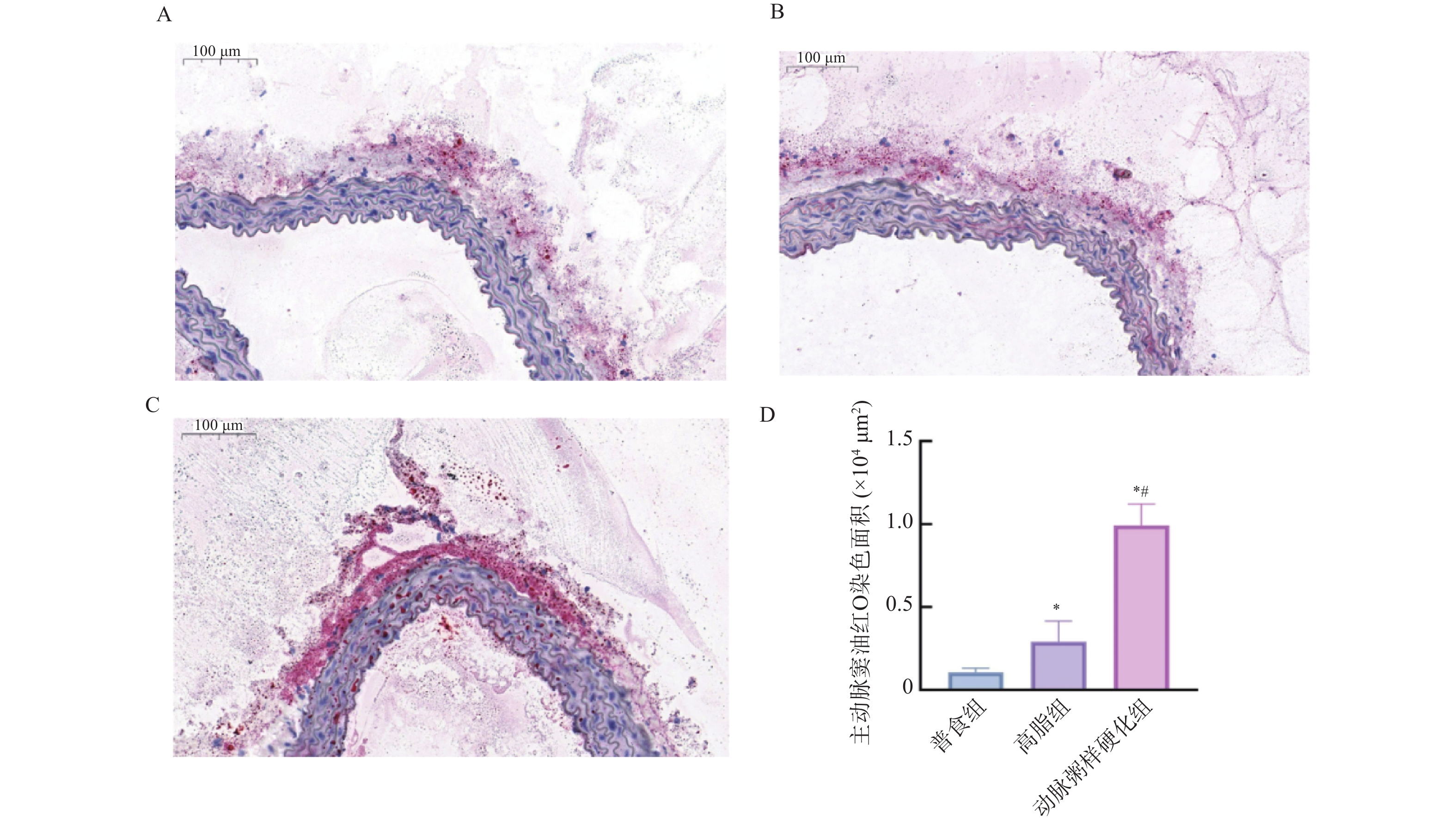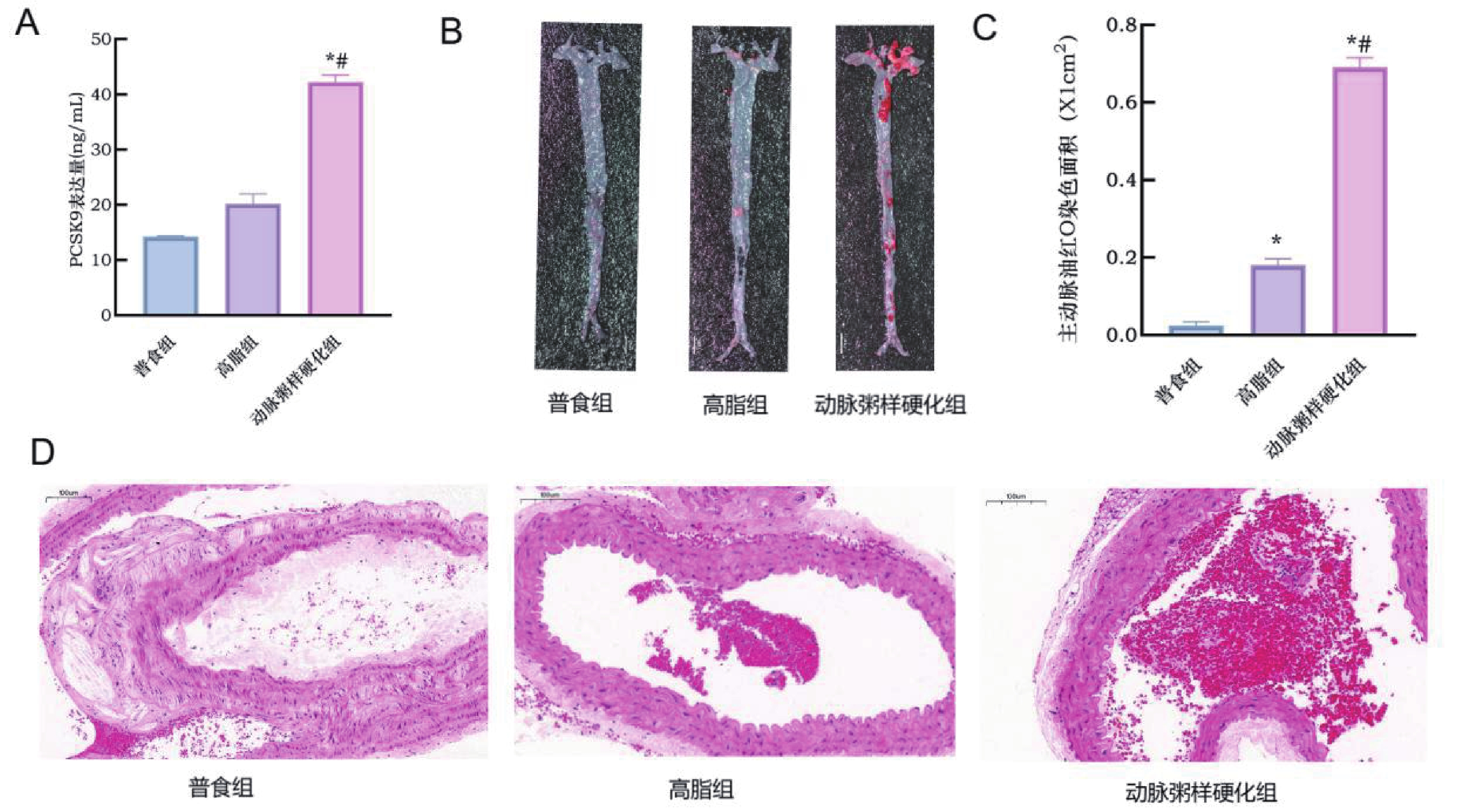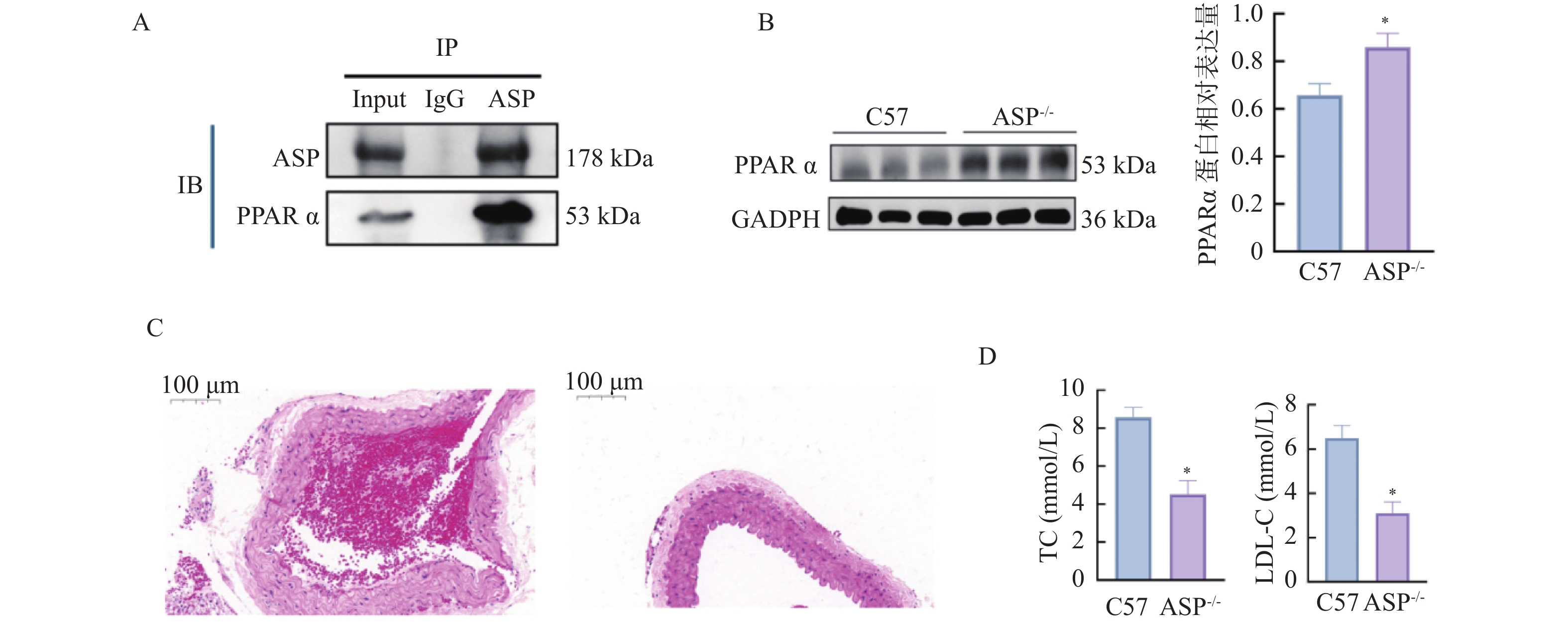 目的 探讨脂代谢相关基因ASP和PPARα在动脉粥样硬化(atherosclerosis,AS)中的作用。 方法 GEO数据库获取AS数据集GSE9874、GSE28829、GSE21545进行交集筛选出共同差异基因(differentially expressed genes,DEGs);对DEGs进行GO、KEGG富集分析;利用String数据库构建蛋白互作网络(protein-protein interaction,PPI),并使用Cytoscape软件筛选关键基因,同时,GeneMANIA数据库寻找关键基因的互作基因并利用HDOCK软件进行分子对接预测,进一步体内实验验证,用C57 小鼠构建动脉粥样硬化模型。采用油红O染色法观察各组小鼠全主动脉、主动脉窦斑块沉积面积;HE染色观察各组主动脉窦组织病理变化;Elisa法检测各组小鼠血脂水平及PCSK9、ASP和PPARα表达水平;RT-qPCR及WB检测主动脉组织中ASP、PPARα的mRNA和蛋白表达水平;CO-IP分析ASP和PPARα蛋白之间的相互作用。 结果 筛选出AS差异表达基因35个,主要富集于胆固醇转移活性、磷脂酰胆碱转运活性、ABC转运蛋白、吞噬体等方面。PPI和cytoscape的结果筛选出ASP为关键基因,且通过GeneMANIA数据库获得ASP的互作基因:PPARα,分子对接预测结果显示两者存在强相互作用并形成稳定结构。体内实验结果表明,与普食组相比,高脂组和动脉粥样硬化组小鼠主动脉、主动脉窦形态表现出不同程度损伤及斑块面积增加;血清中血脂水平显著升高及主动脉组织中ASP mRNA和蛋白水平均显著升高(P < 0.05),PPARα水平则相反;同高脂组相比,动脉粥样硬化组上述指标差异有统计学意义(P < 0.05);CO-IP分析证明ASP和PPARα存在相互作用,且敲低ASP小鼠动脉粥样硬化斑块及血脂水平降低,PPARα表达水平升高(P < 0.05)。 结论 ASP和PPARα参与了AS的发展,且可能与脂代谢密切相关。