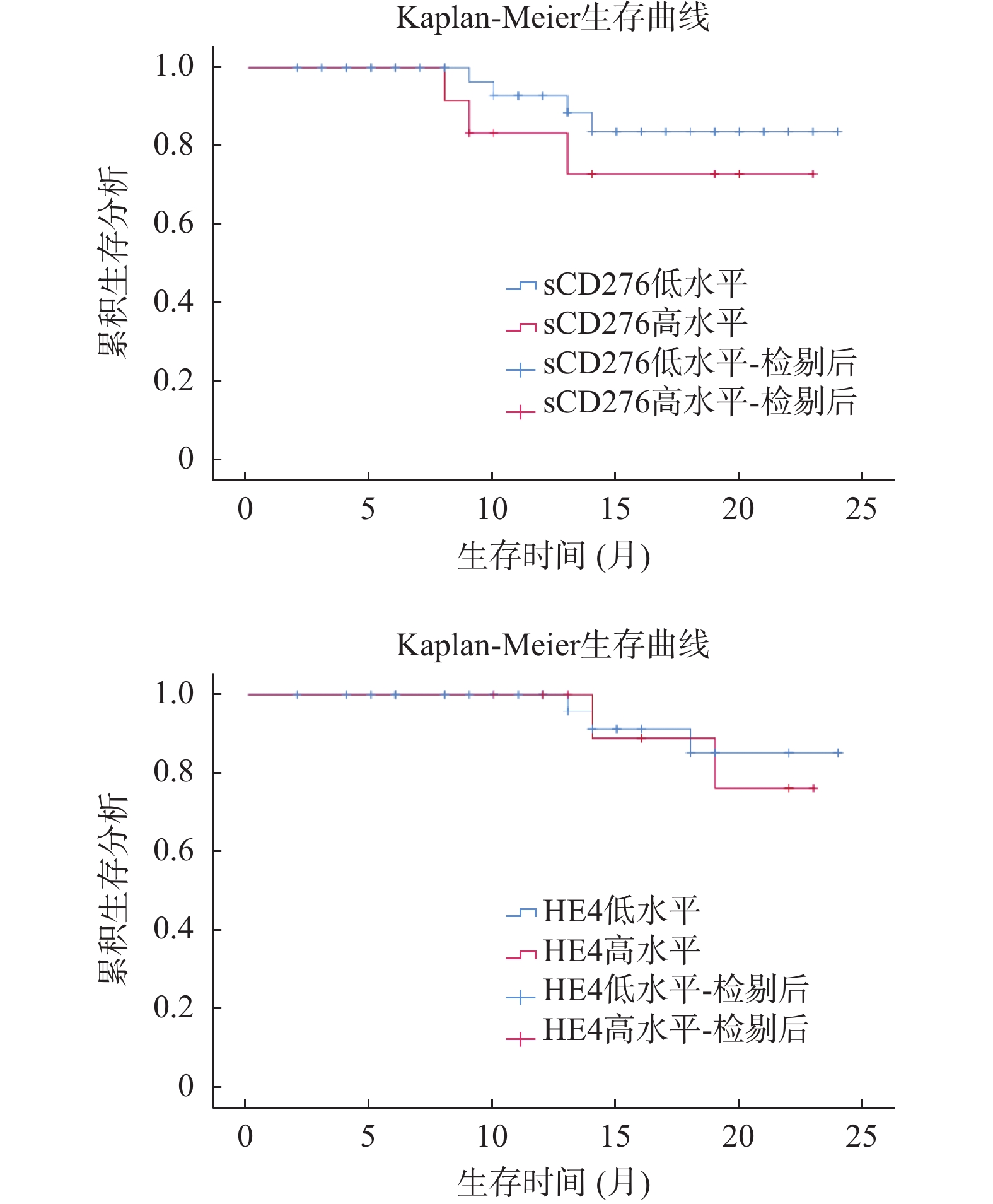目的 探究卵巢癌患者血清可溶性CD276(soluble CD276,sCD276)、人附睾蛋白4 (humanEpididymisProtein4,HE4)水平及与患者术后复发的相关性。 方法 回顾性选取山东第二医科大学附属医院2022年2月至2023年4月诊治的卵巢癌患者52例作为研究组,另同期选取正常体检者50例为对照组,对比血清sCD276、HE4水平,确定血清sCD276、HE4水平与卵巢癌患者病理特征之间的相关性。术后对患者行1年随访,按随访过程中复发情况分为复发组12例,未复发组40例,对比两组血清sCD276、HE4水平,影响卵巢癌患者术后复发高危因素行Cox回归分析;绘制受试者工作特征(receiver operating characteristic,ROC)曲线分析sCD276、HE4对术后复发的预测价值;以Kaplan-Meier法行生存分析。 结果 与对照组相比,研究组血清sCD276、HE4水平升高;与未复发组相比,复发组血清sCD276、HE4水平升高,且组织分化程度、淋巴结转移、术后残余病灶直径、癌胚抗原(carcinoembryonic antigen,CEA)、调节性T淋巴细胞(regulatory T lymphocyte,Treg)比率、叶酸结合受体1(folate receptor1,FOLR1)、糖类抗原125(carbohydrate antigen 125,CA125)相比(P < 0.05)。行Cox回归分析显示,组织分化程度、淋巴结转移、术后残余病灶直径、CEA、Treg比率、FOLR1、sCD276、HE4均是影响卵巢癌术后复发的危险因素;ROC曲线分析显示,sCD276、HE4联合检测效能高于单项检测,差异有统计学意义(P < 0.05);Kaplan-Meier生存曲线分析显示,sCD276、HE4高水平死亡率高于低水平患者(P < 0.05)。 结论 血清sCD276、HE4水平在卵巢癌患者中升高,并与患者术后复发相关。