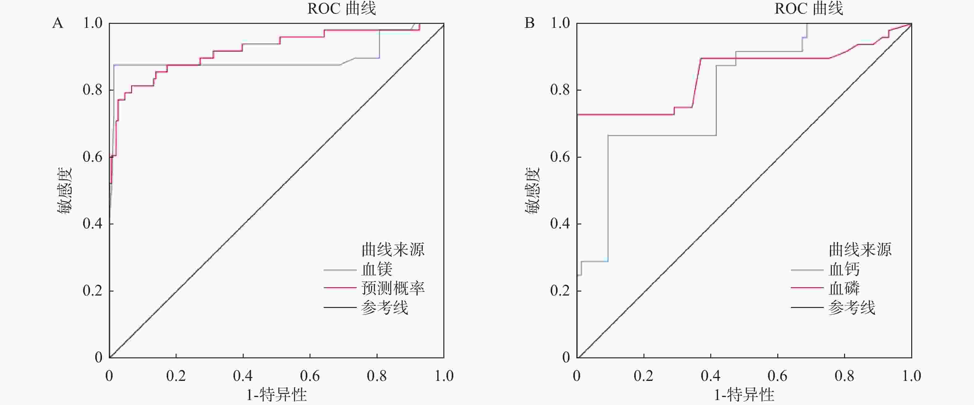 变量 AUC S.E P 95%CI cut-off值 约登指数 敏感度(%) 特异度(%) 下限 上限 血镁 0.895 0.039 <0.001*** 0.820 0.971 0.965 0.862 87.5 98.7 预测概率 0.921 0.027 <0.001*** 0.867 0.974 0.595 0.747 81.3 93.4 血钙 0.802 0.036 <0.001*** 0.732 0.873 2.805 0.575 66.7 90.8 血磷 0.851 0.041 <0.001*** 0.770 0.932 2.195 0.729 72.9 100 ***P < 0.001。 -