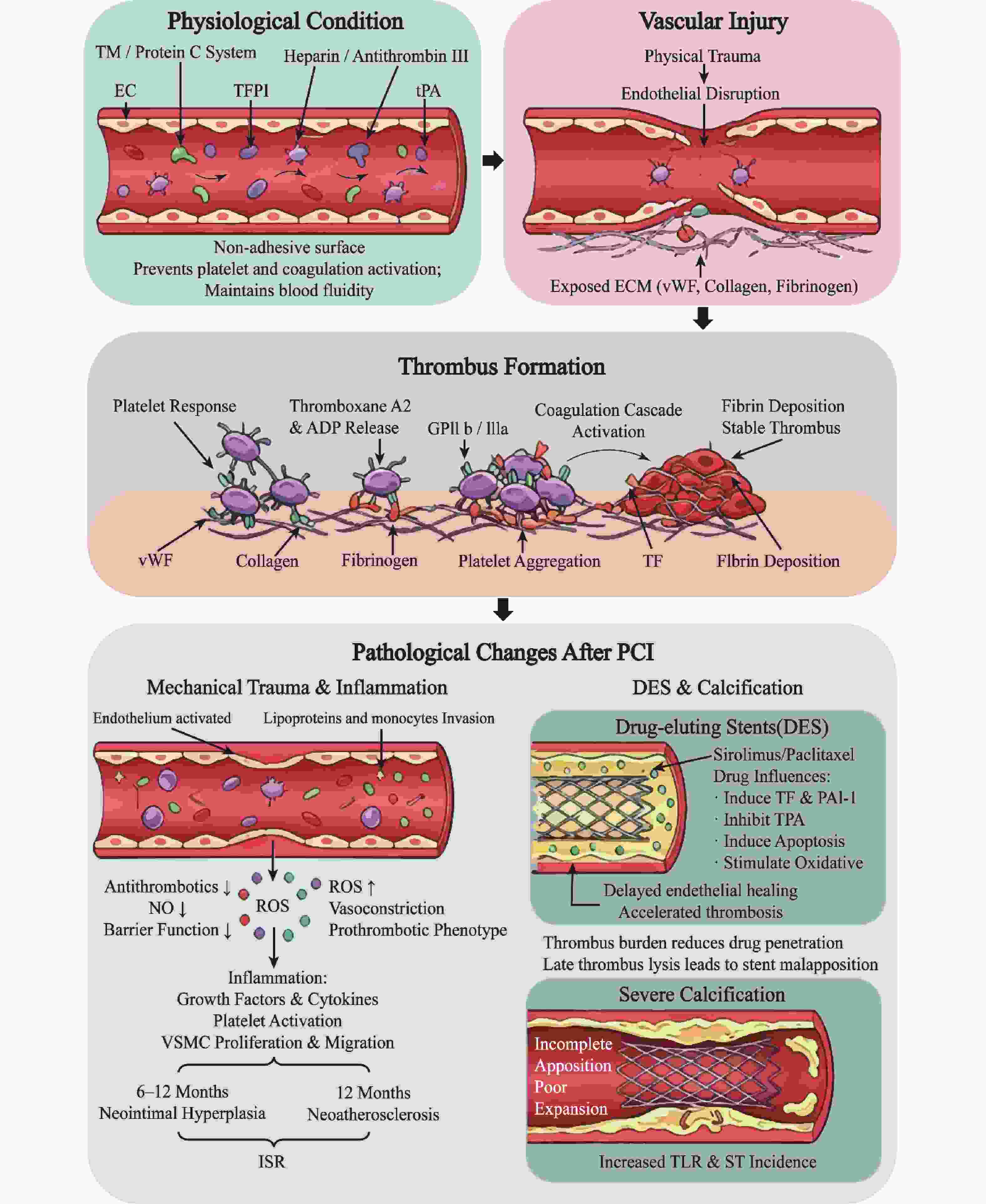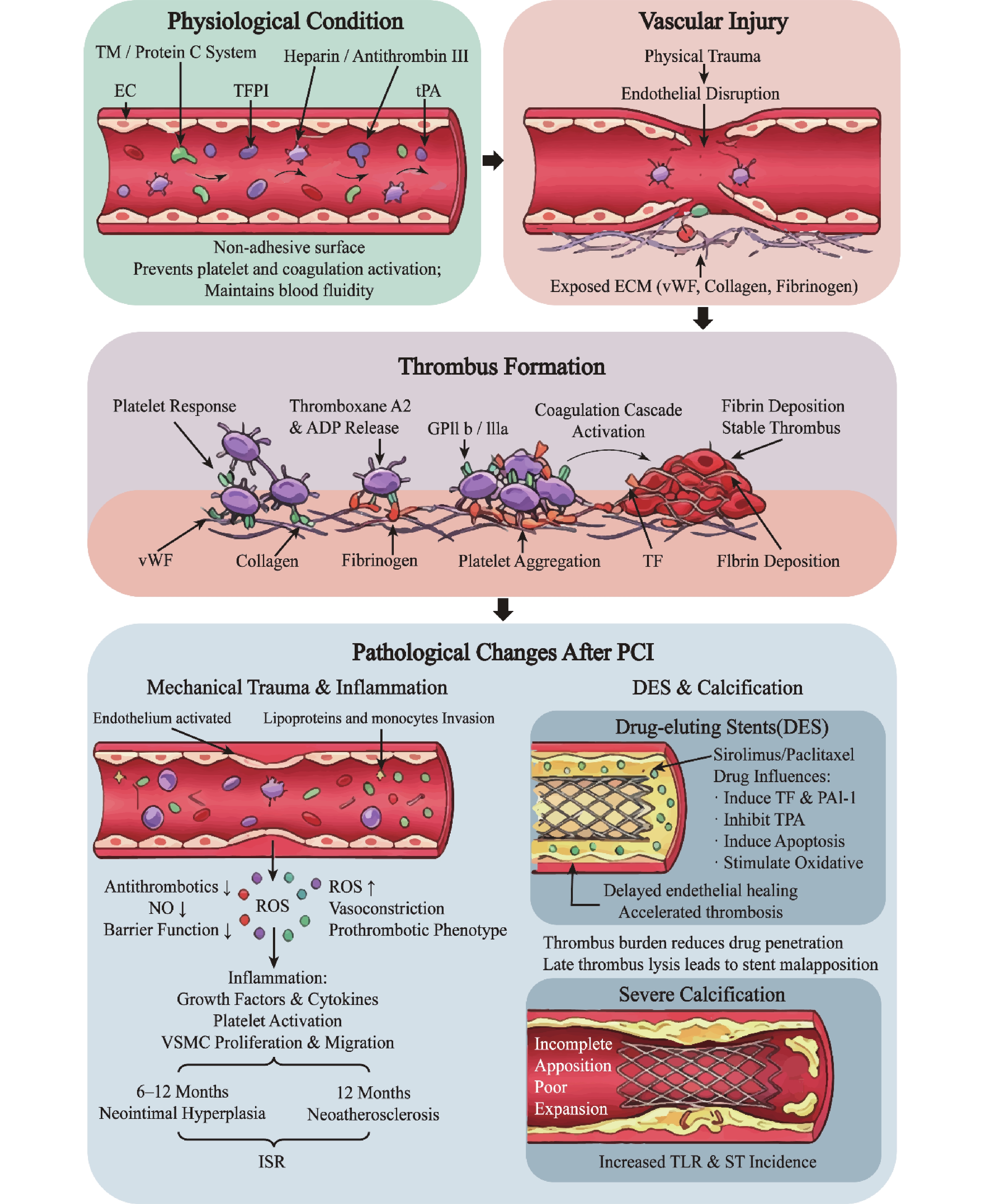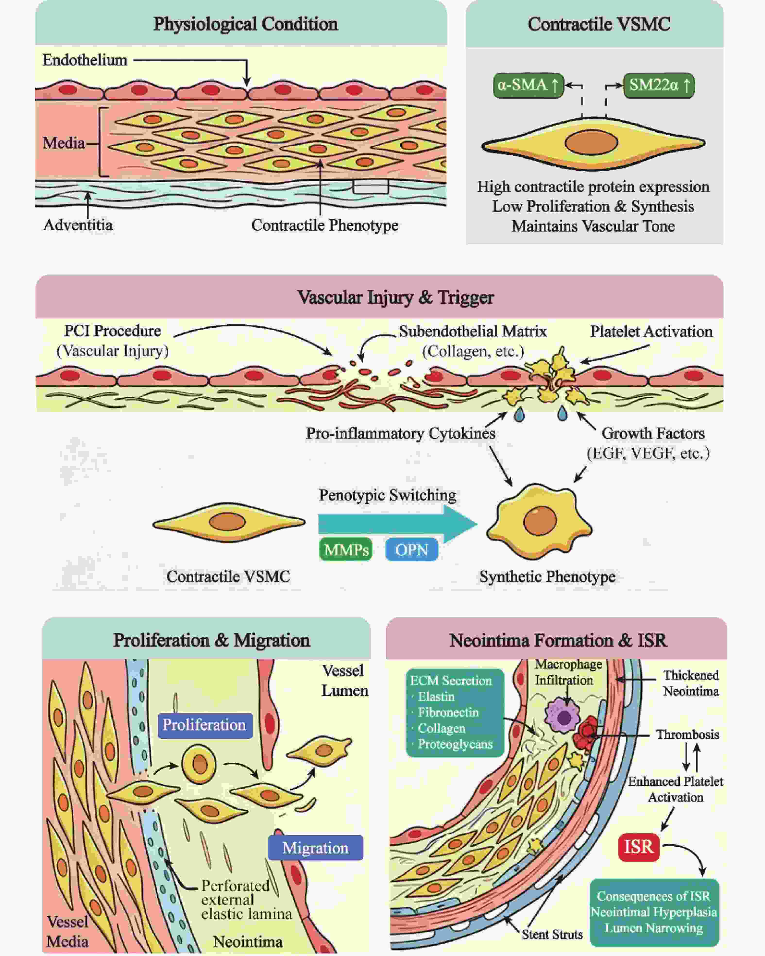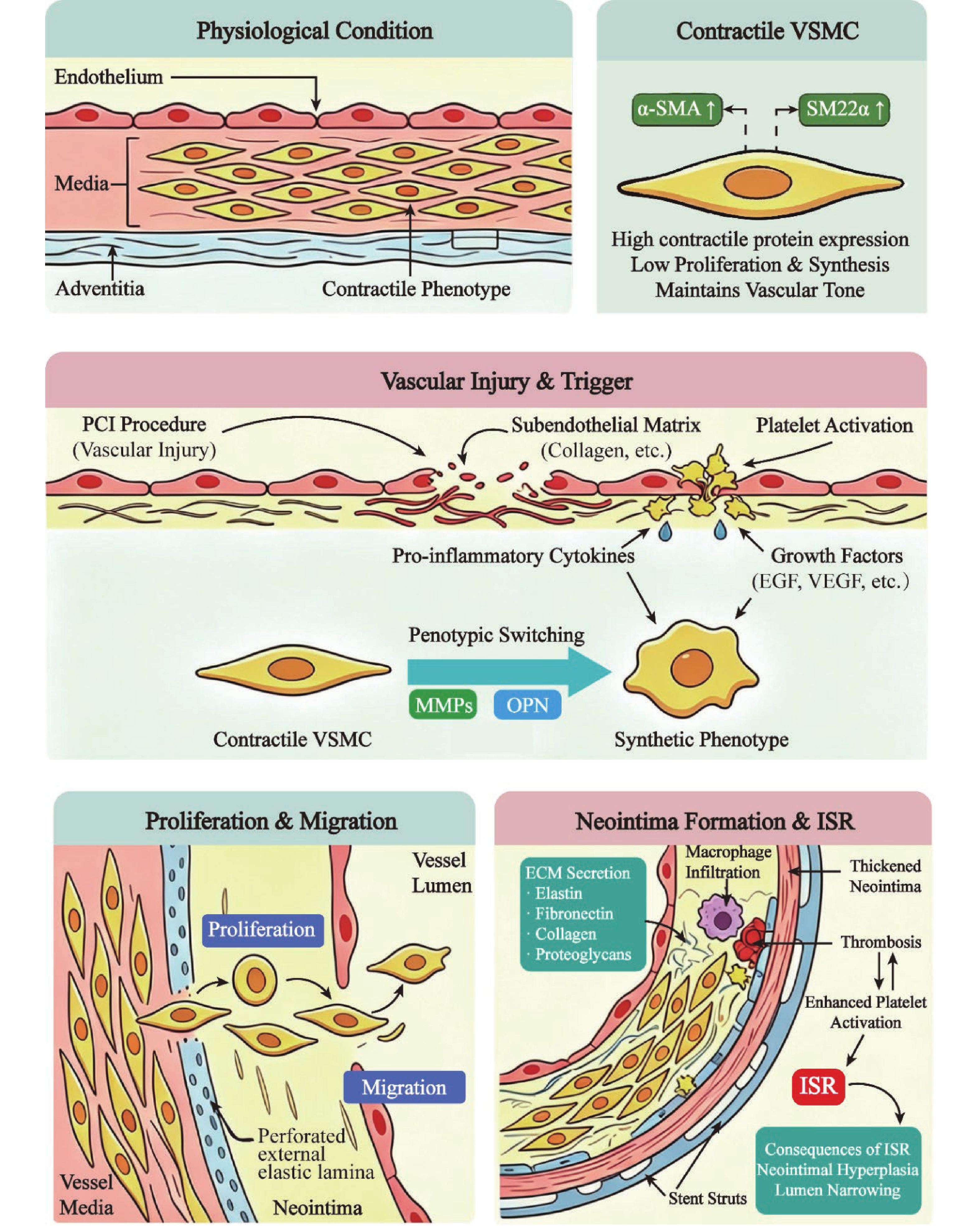 Abstract: Percutaneous coronary intervention (PCI) is currently the most widely used myocardial reperfusion therapy worldwide and is effective in increasing survival rates and improving quality of life in patients with coronary artery disease and myocardial infarction. However, the progressive thickening of neo-atherosclerotic (NA) plaques after PCI can lead to in-stent restenosis (ISR), which can even rupture and progress to acute adverse cardiovascular events, seriously affecting patient prognosis. Progressive angina due to in-stent restenosis and acute cardiovascular events due to in-stent thrombosis are the main pathological manifestations of ISR after PCI. Intra-stent restenosis is a pathological neointimal hyperplasia mediated by a complex combination of patient factors, vascular factors, mechanical and stenting, and anatomical factors, and research on its pathogenesis is ongoing. This article provides an in-depth discussion of the pathogenesis of ISR and its clinical implications by reviewing imaging in the interventional field, endothelial cell injury and thrombus formation, vascular smooth muscle cell (VSMCs) proliferation and migration, inflammatory response, and neointimal atherosclerosis. -