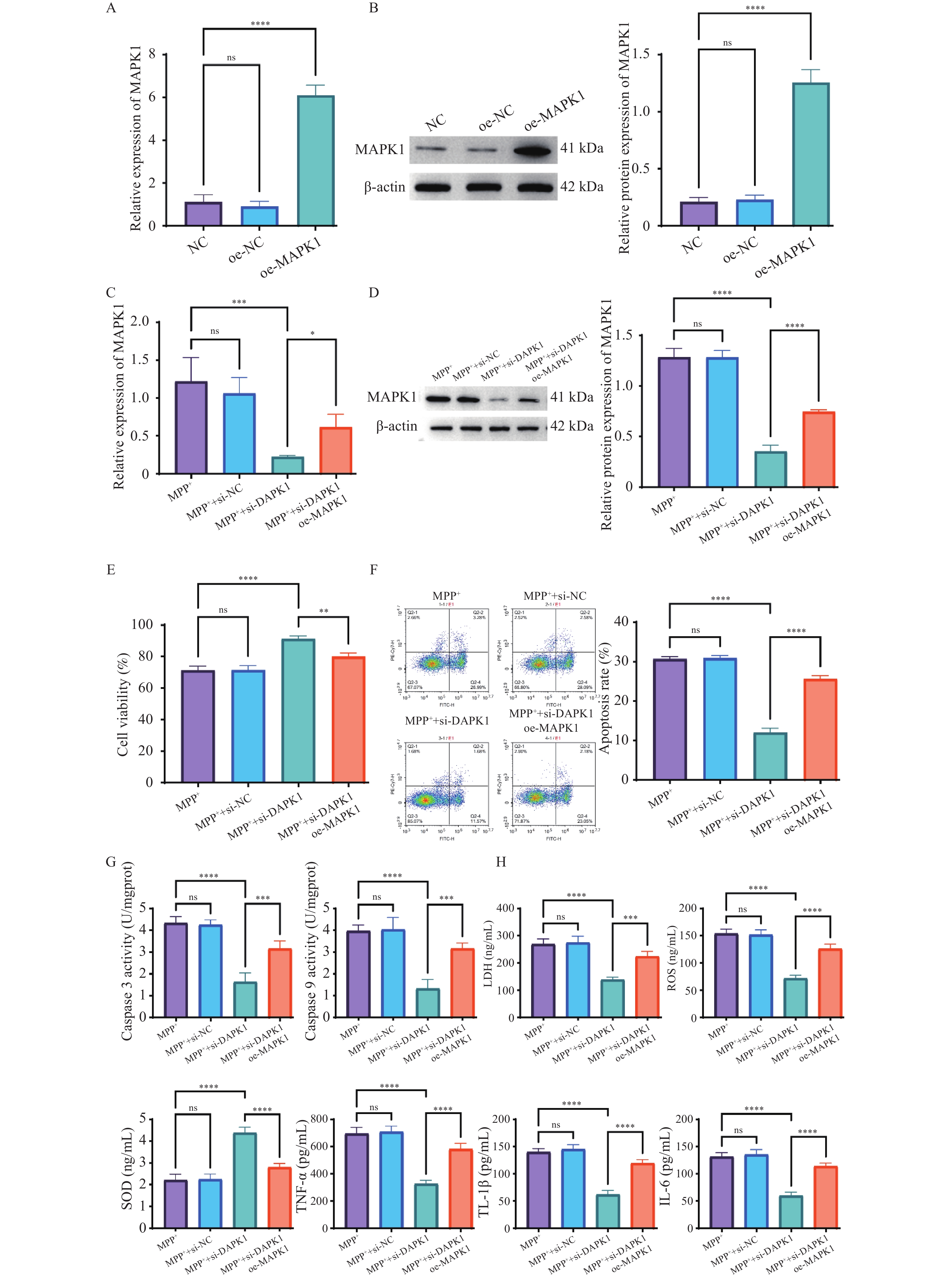A:RT-qPCR检测转染效率;B:Western blot检测转染效率;C:RT-qPCR检测MAPK1的表达水平;D:Western blot检测MAPK1的蛋白表达水平;E:CCK-8检测细胞活力;F:流式细胞术检测细胞凋亡;G:试剂盒Caspase-3和Caspase-9 活性检测;H:ELISA检测LDH、ROS、SOD、TNF-α、IL-1β和IL-6水平;nsP > 0.05;*P < 0.05;**P < 0.01;***P < 0.001;****P < 0.0001。