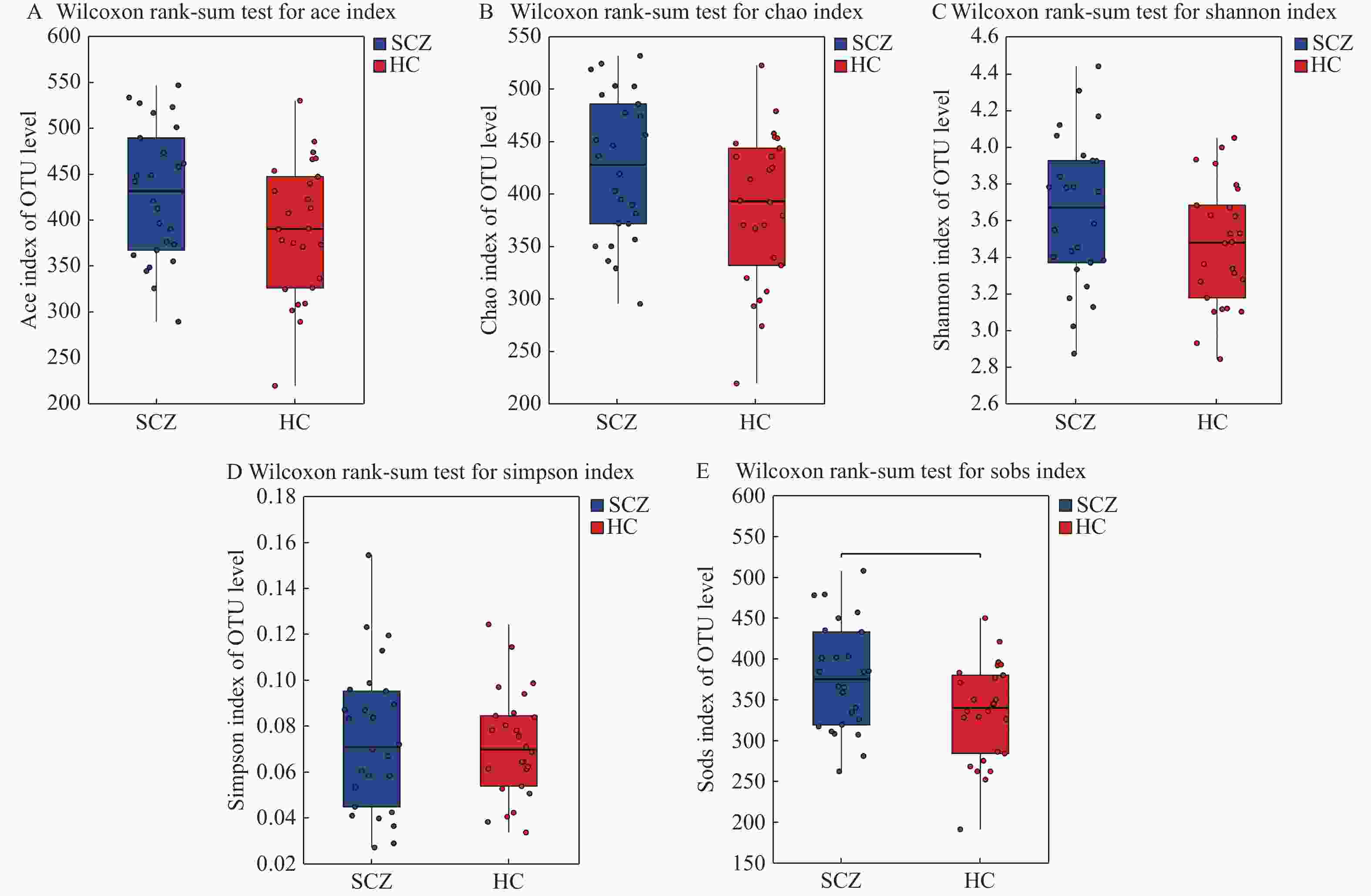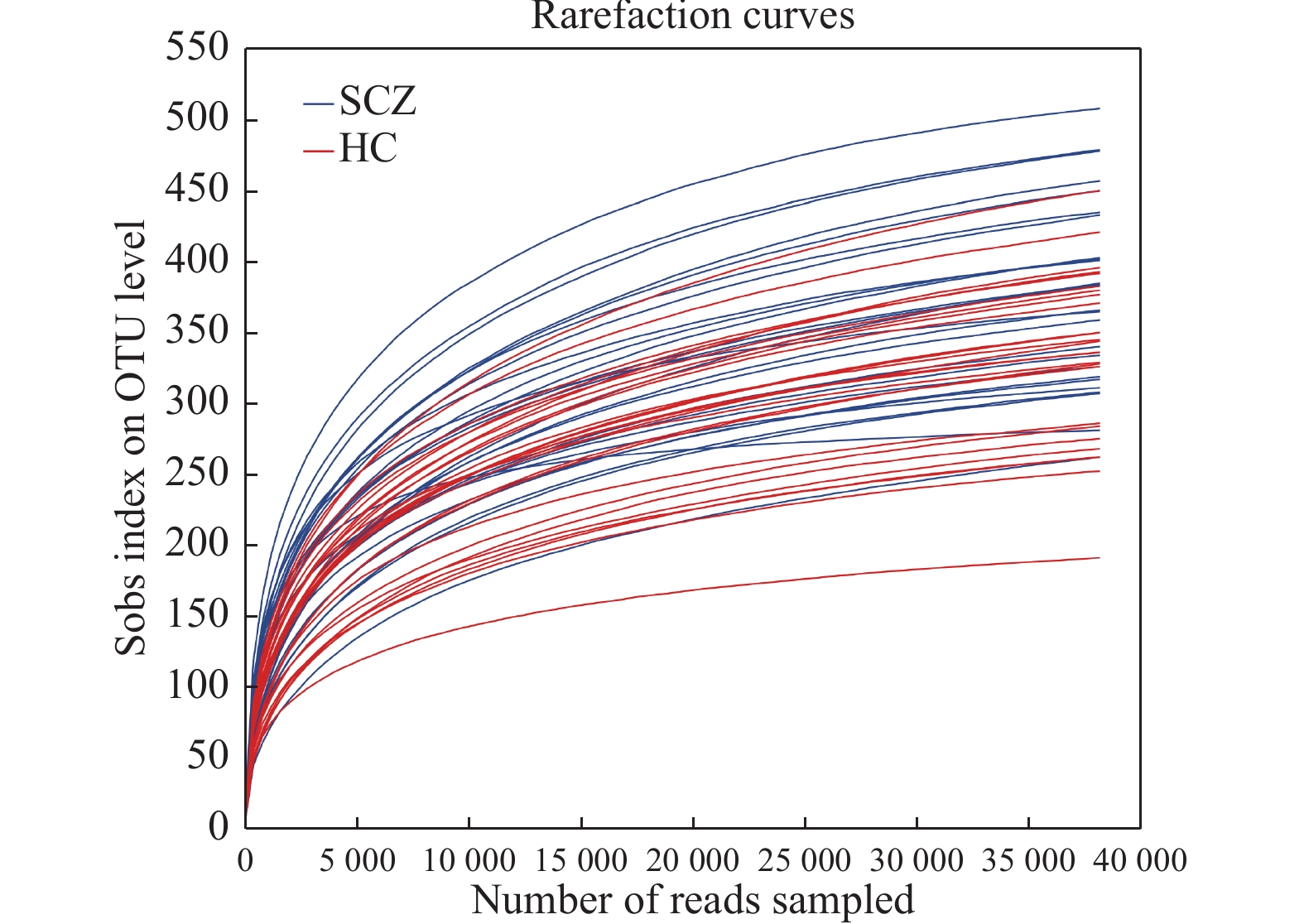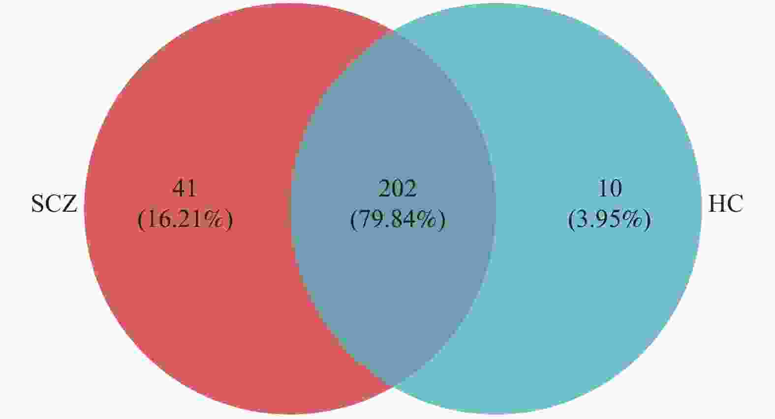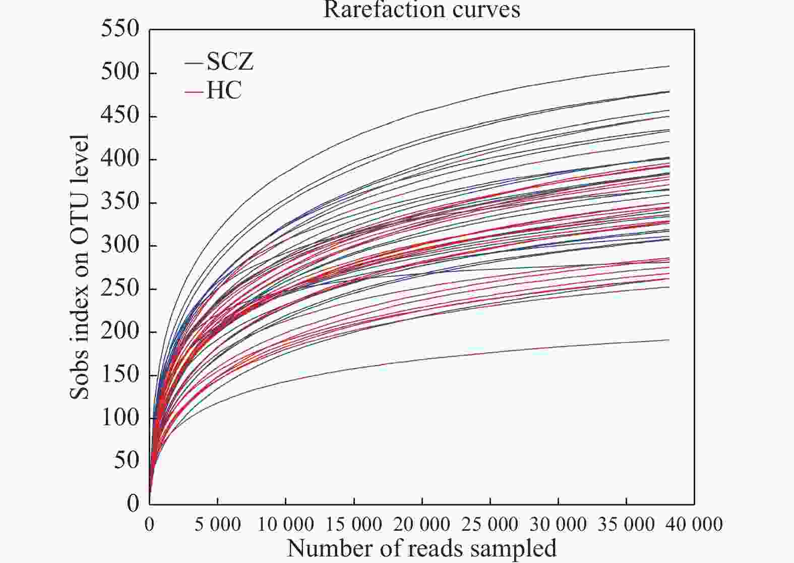 指数 HC SCZ P ace 389.27 ± 73.099 427.76 ± 72.398 0.101 chao 386.35 ± 72.254 424.91 ± 68.711 0.071 shannon 3.463 ± 0.333 3.645 ± 0.406 0.098 simpson 0.071 ± 0.023 0.074 ± 0.032 0.876 sobs 334.12 ± 60.165 376.69 ± 65.685 0.047* 和HC组相比,*P < 0.05。 -
