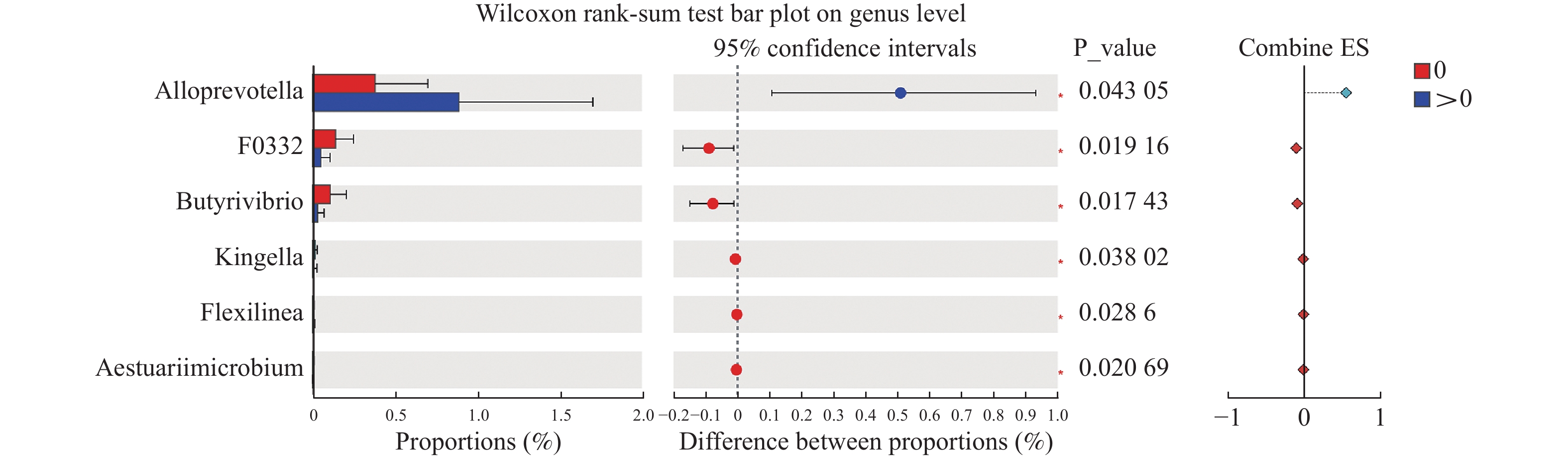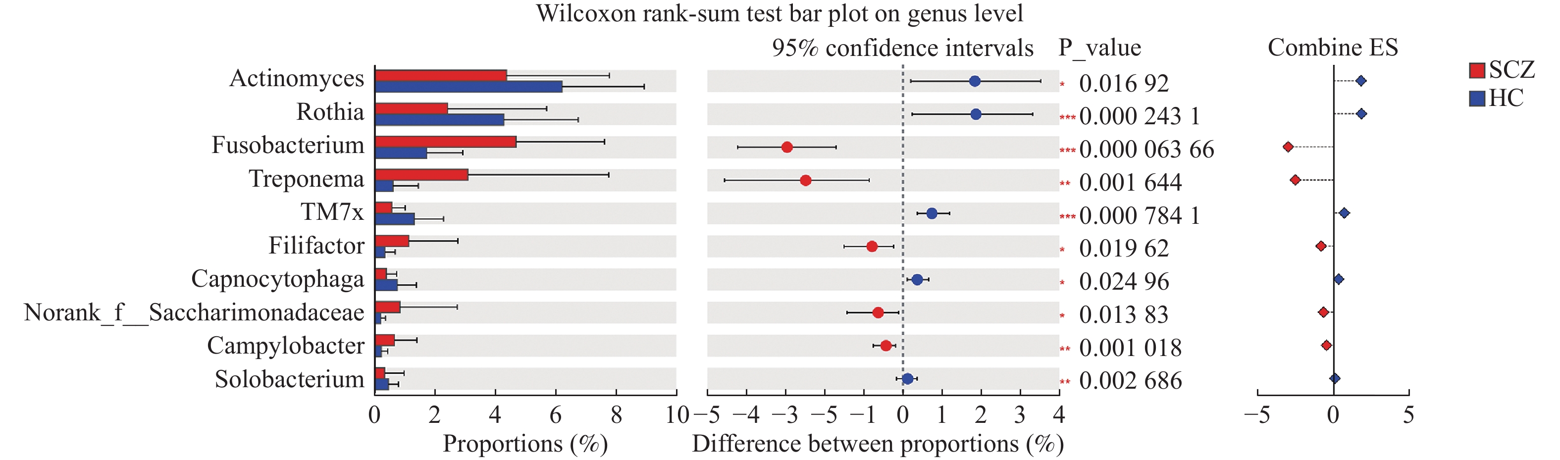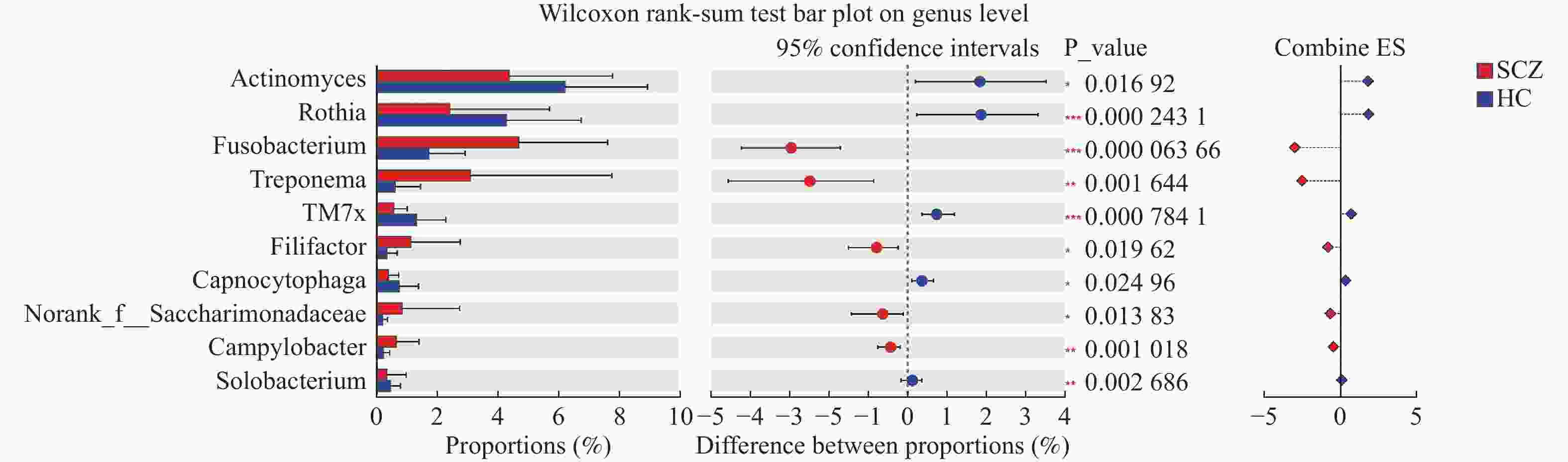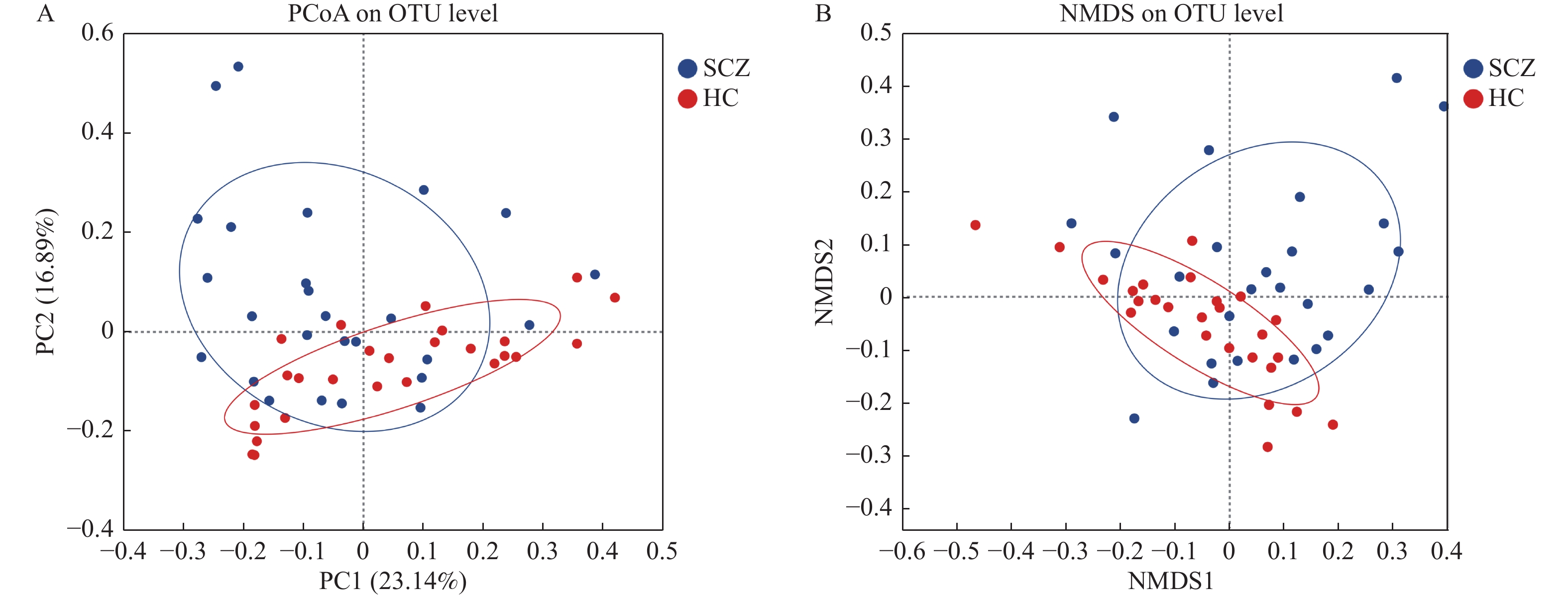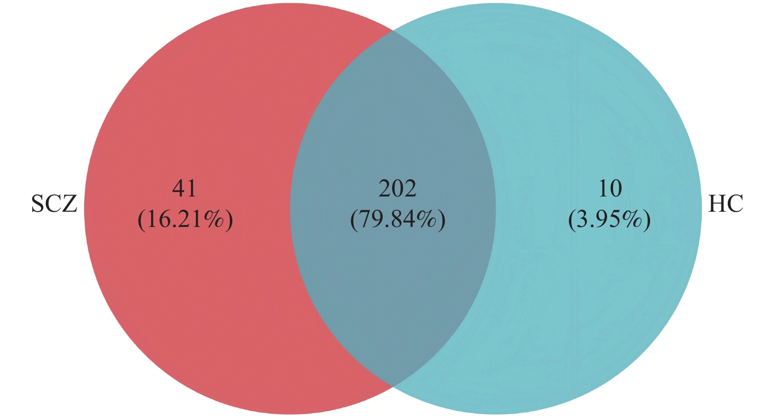 指数 HC SCZ P ace 389.27 ± 73.099 427.76 ± 72.398 0.101 chao 386.35 ± 72.254 424.91 ± 68.711 0.071 shannon 3.463 ± 0.333 3.645 ± 0.406 0.098 simpson 0.071 ± 0.023 0.074 ± 0.032 0.876 sobs 334.12 ± 60.165 376.69 ± 65.685 0.047* 和HC组相比,*P < 0.05。 -