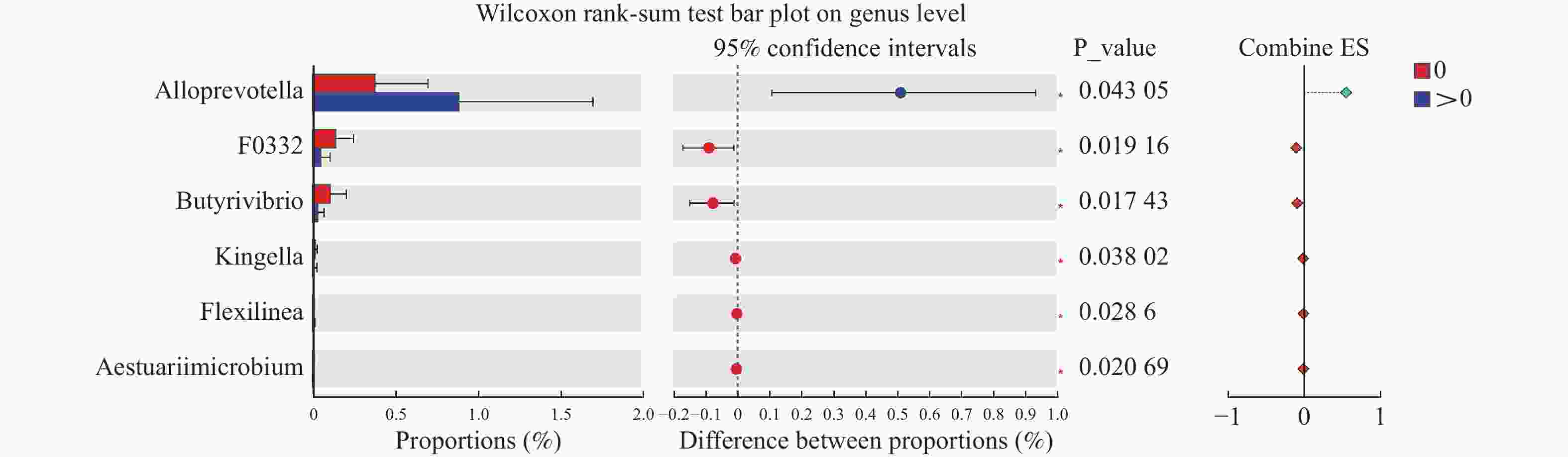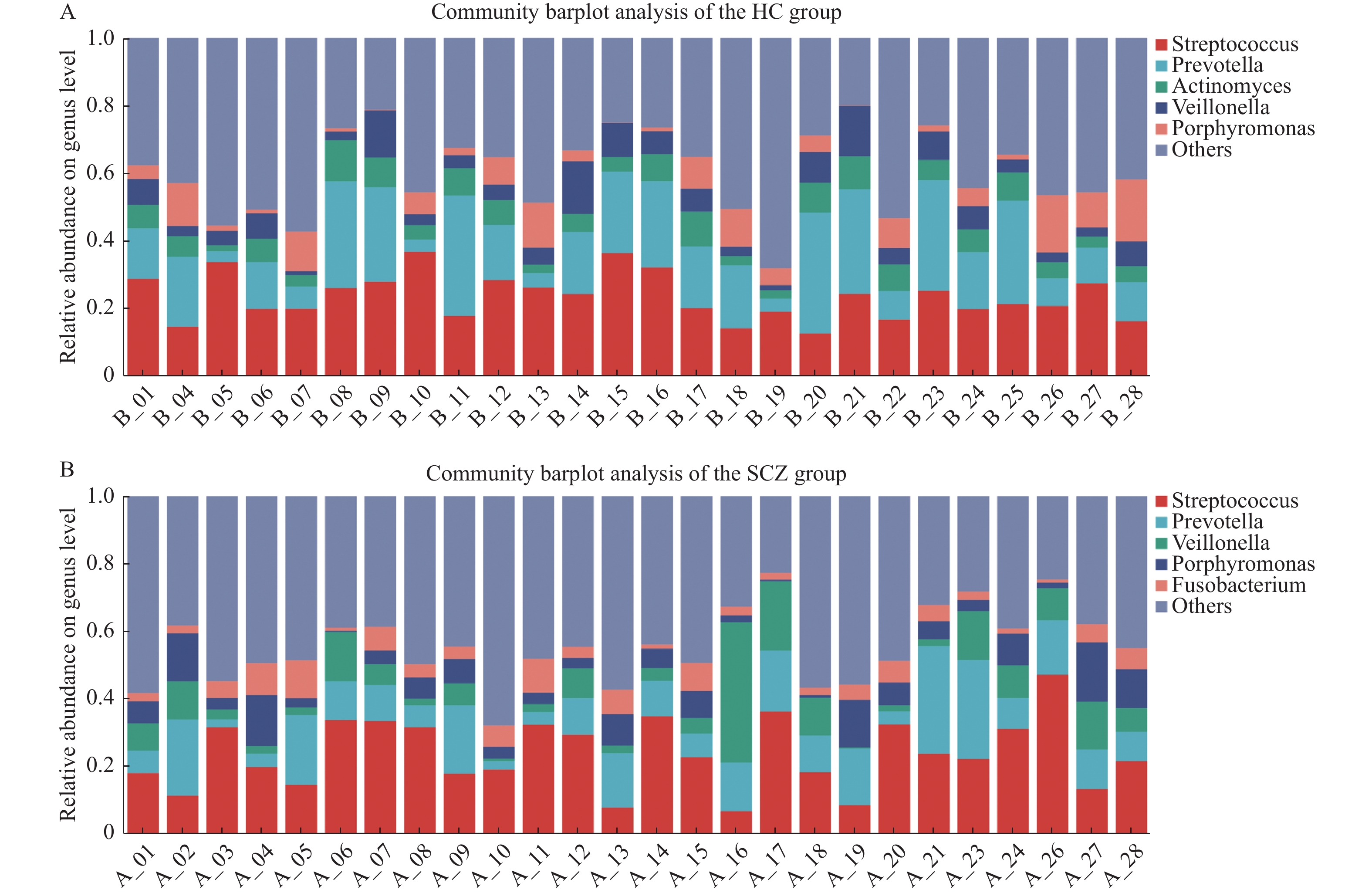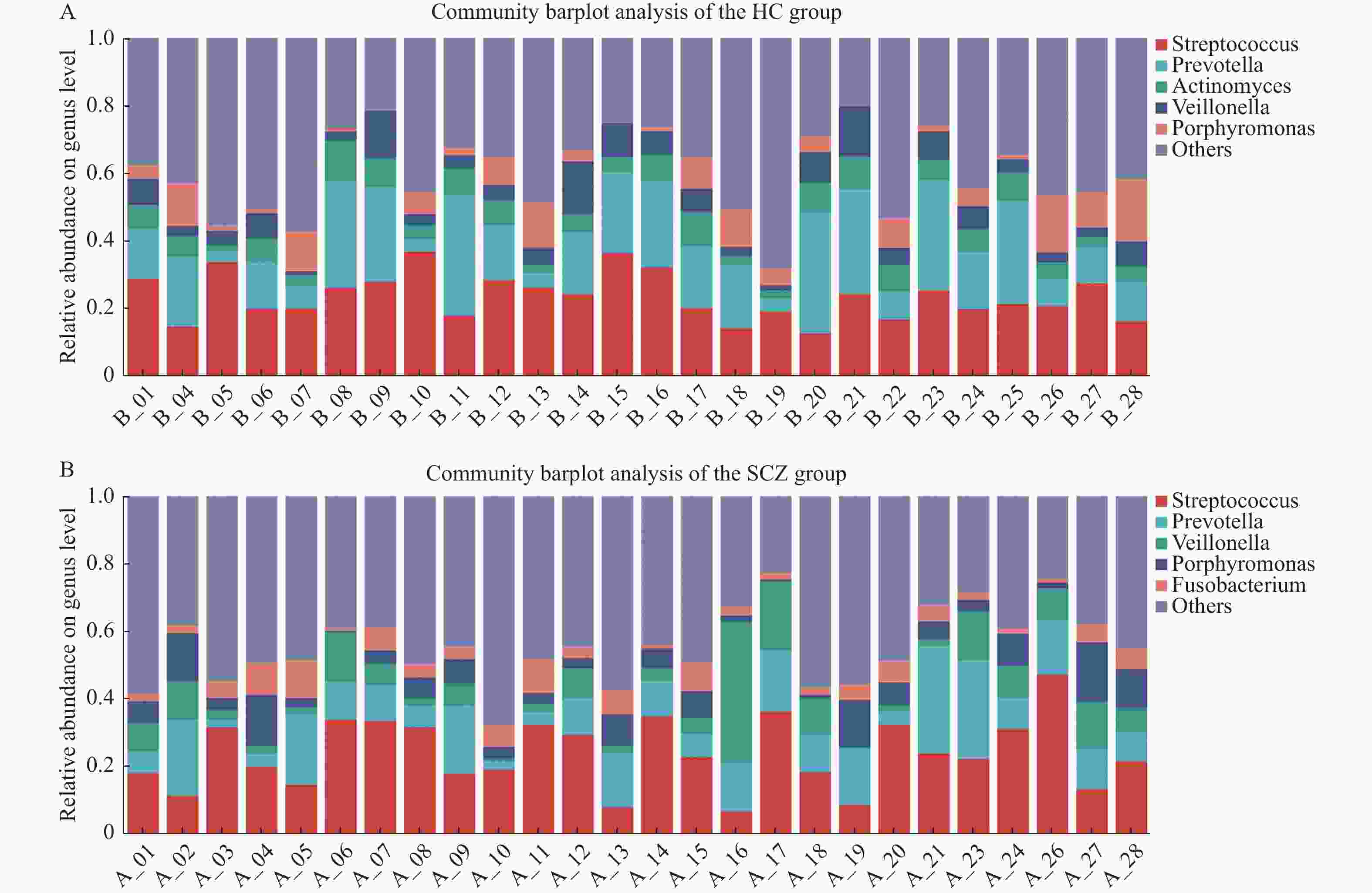 目的 分析保山市精神分裂症患者和健康人之间口腔卫生及口腔微生物间的差异。 方法 选择保山市第三人民医院26名精神分裂症患者作为病例组,按年龄、体质指数匹配的26名健康人作为健康对照组,收集人口学资料、体格指标及口腔状况,采集52名研究对象唾液样本并采用16S rDNA基因测序分析,比较精神分裂症患者和健康人之间口腔卫生及口腔微生物间的差异。 结果 病例组和健康对照组的口腔微生物群落丰富度差异具有统计学意义(P < 0.05),病例组所含物种种类高于健康对照组;属水平上,除病例组的Fusobacterium和健康对照组的Actinomyces,两组排名前5的优势菌种一致;物种差异分析结果显示在病例组中Fusobacterium和Campylobacter均高于健康对照组(P < 0.05)。 结论 精神分裂症患者口腔的部分优势菌种向产生硫化氢的硫酸盐还原菌属转变,过量的硫化氢或多硫化物的产生可能会损害线粒体的能量代谢。 Abstract:Objective To analyze the differences in oral hygiene and oral microbiota between the patients with schizophrenia and healthy individuals in Baoshan City. Methods 26 patients with schizophrenia from Baoshan Third People's Hospital were selected as the SCZ group and 26 healthy individuals matched by age and BMI as the HC (Healthy control) group. Demographic data, physical indicators, and oral conditions were collected. Saliva samples from 52 subjects were collected and 16S rDNA gene sequencing was used to compare the differences in oral hygiene and oral microbiota between the patients with schizophrenia and the healthy individuals. Results The difference in oral microbial community richness between the SCZ group and the HC group was statistically significant (P < 0.05), with the SCZ group containing higher species than the HC group; at the genus level, except for Fusobacterium in the SCZ group and Actinomyces in the HC group, the top 5 dominant bacterial species in both groups were consistent; the results of species difference analysis showed that Fusobacterium and Campylobacter in the SCZ group were higher than those in the HC group (P < 0.05). Conclusion The partial dominant bacterial species in the oral cavity of the patients with schizophrenia have changed to sulfate-reducing bacteria that produce hydrogen sulfide. Excessive production of hydrogen sulfide or polysulfide may damage the energy metabolism of mitochondria. -