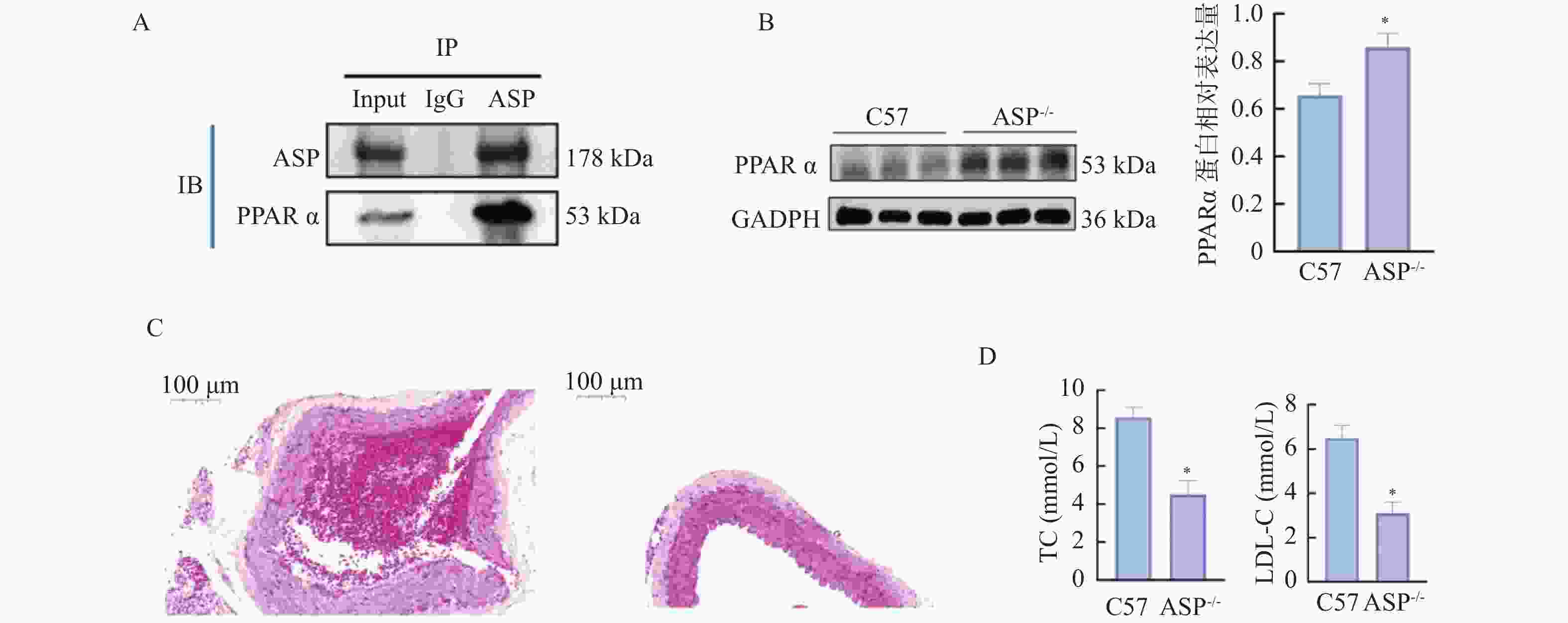 A:ASP和PPARα经CO-IP后Western blot检测结果;B:各组小鼠主动脉组织中PPARα蛋白相对表达水平;C:各组HE染色图(×40);D:各组小鼠血清中TC、LDL相对表达水平;与C57组比较,*P < 0.05。