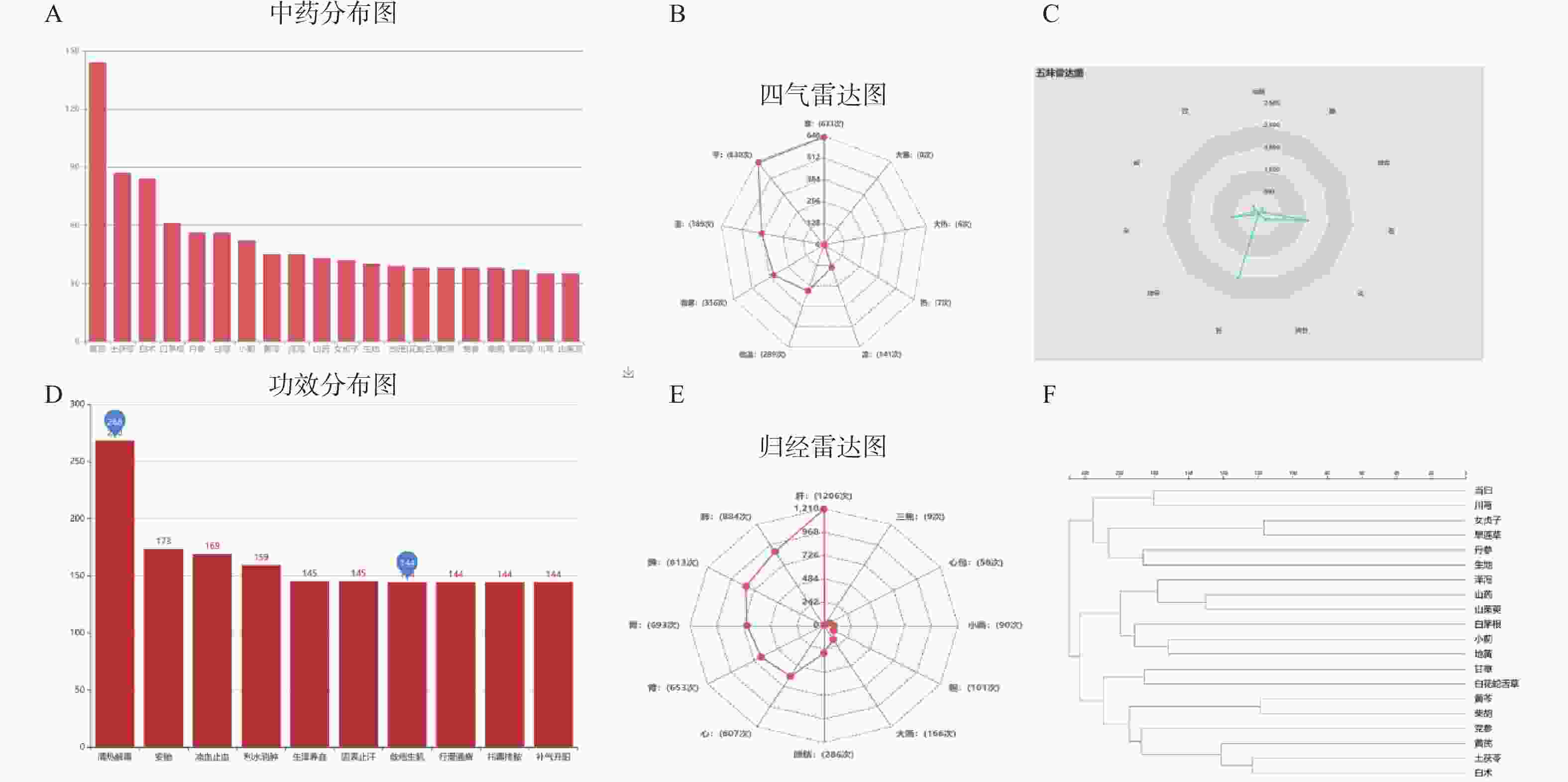 (g)1 黄芪 144 62.88 28.72 21 太子参 34 14.85 16.6 2 土茯苓 87 37.99 17 22 防风 34 14.85 9.55 3 白术 84 36.68 12.51 23 茜草 34 14.85 16.29 4 白茅根 61 26.64 26.85 24 连翘 32 13.97 14.96 5 丹参 56 24.45 20.22 25 金银花 31 13.54 16.25 6 甘草 56 24.45 7.22 26 芡实 30 13.10 19.16 7 小蓟 52 22.71 21.4 27 土茯苓 28 12.23 26.42 8 黄芩 45 19.65 11.78 28 桃仁 27 11.79 13.13 9 泽泻 45 19.65 15.23 29 知母 25 10.92 10.94 10 山药 43 18.78 16.45 30 仙鹤草 25 10.92 23.26 11 女贞子 42 18.34 15 31 金樱子 25 10.92 17.05 12 生地 40 17.47 16.5 32 丹皮 25 10.92 12.38 13 当归 39 17.03 12.71 33 玄参 24 10.48 13.67 14 白花蛇舌草 38 16.59 26.38 34 白芍 23 10.04 16.07 15 地黄 38 16.59 17.94 35 益母草 22 9.61 21.11 16 党参 38 16.59 16.71 36 菟丝子 22 9.61 18 17 柴胡 38 16.59 11.21 37 杜仲 22 9.61 14.17 18 旱莲草 37 16.16 16.11 38 黄柏 21 9.17 10.82 19 川芎 35 15.28 14.4 39 山萸肉 20 8.73 14.59 20 山茱萸 35 15.28 12.97 40 牛蒡子 20 8.73 11.35 表 3 中药属性四气、五味分析