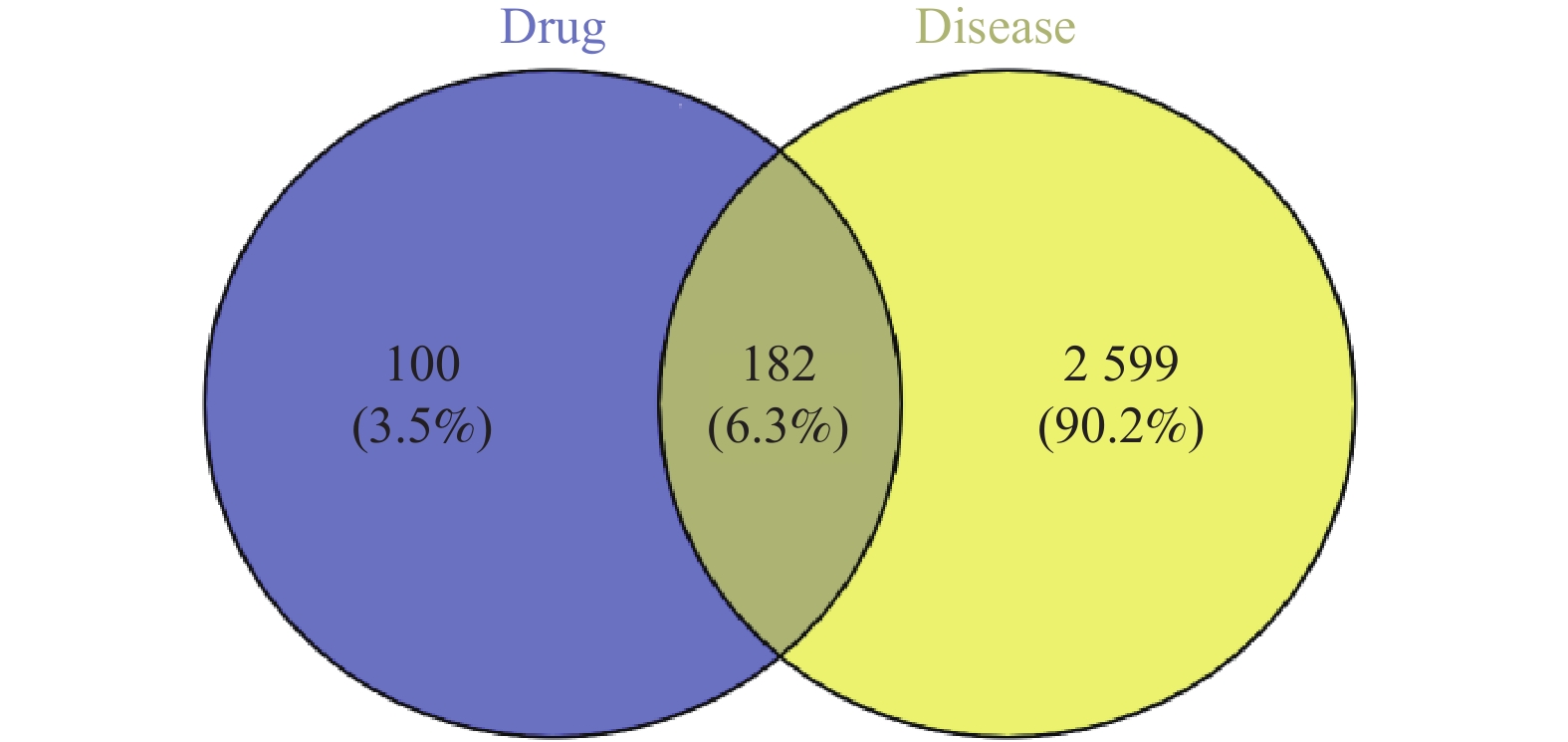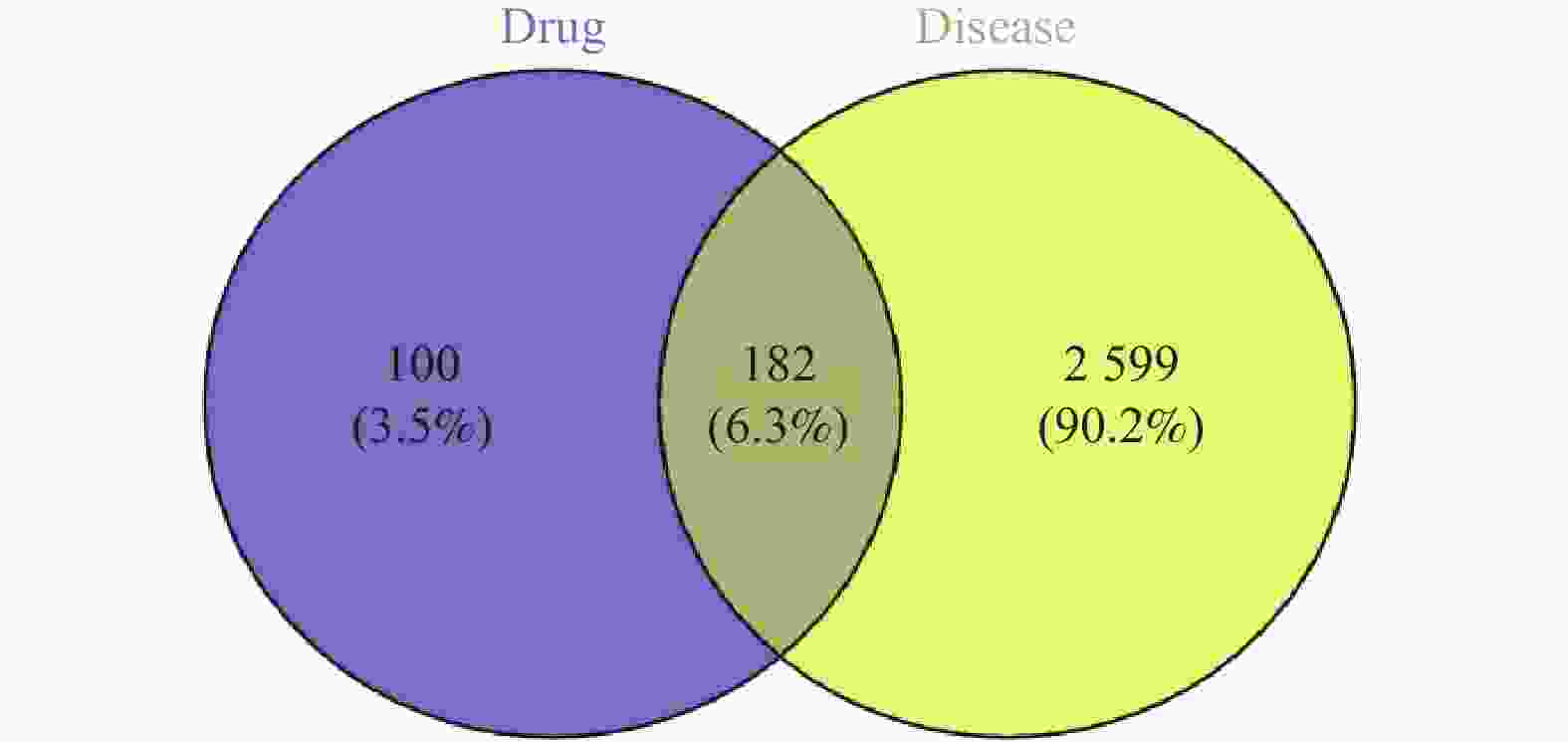 序号 归经 频次 百分比% (频次/总频次) 序号 功效 频次 百分比%(频次/总频次) 1 肝 1206 36.42 1 清热解毒 268 8.09 2 肺 884 26.70 2 安胎 173 5.23 3 脾 813 24.55 3 凉血止血 169 5.10 4 胃 693 20.93 4 利水消肿 159 4.80 5 肾 653 19.72 5 生津养血 145 4.38 6 心 607 18.33 6 固表止汗 145 4.38 7 膀胱 286 8.64 7 敛疮生肌 144 4.35 8 大肠 166 5.01 8 行滞通痹 144 4.35 9 胆 101 3.05 9 托毒排脓 144 4.35 10 小肠 90 2.72 10 补气升阳 144 4.35 11 心包 58 1.75 12 三焦 9 0.27 表 5 活性成分与基因靶点度值(Degree)列表