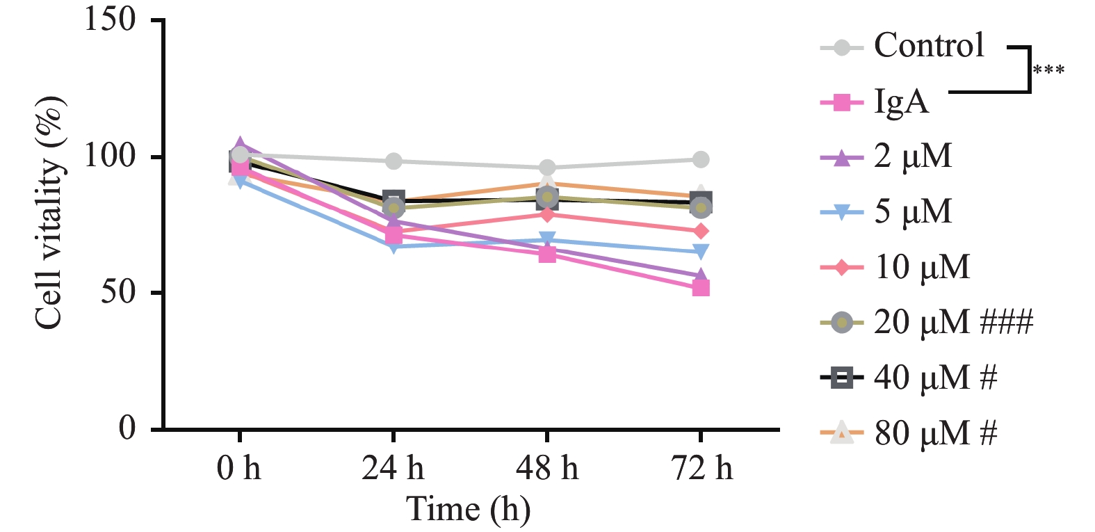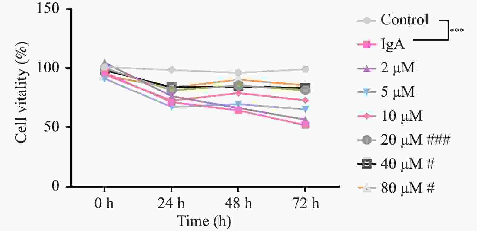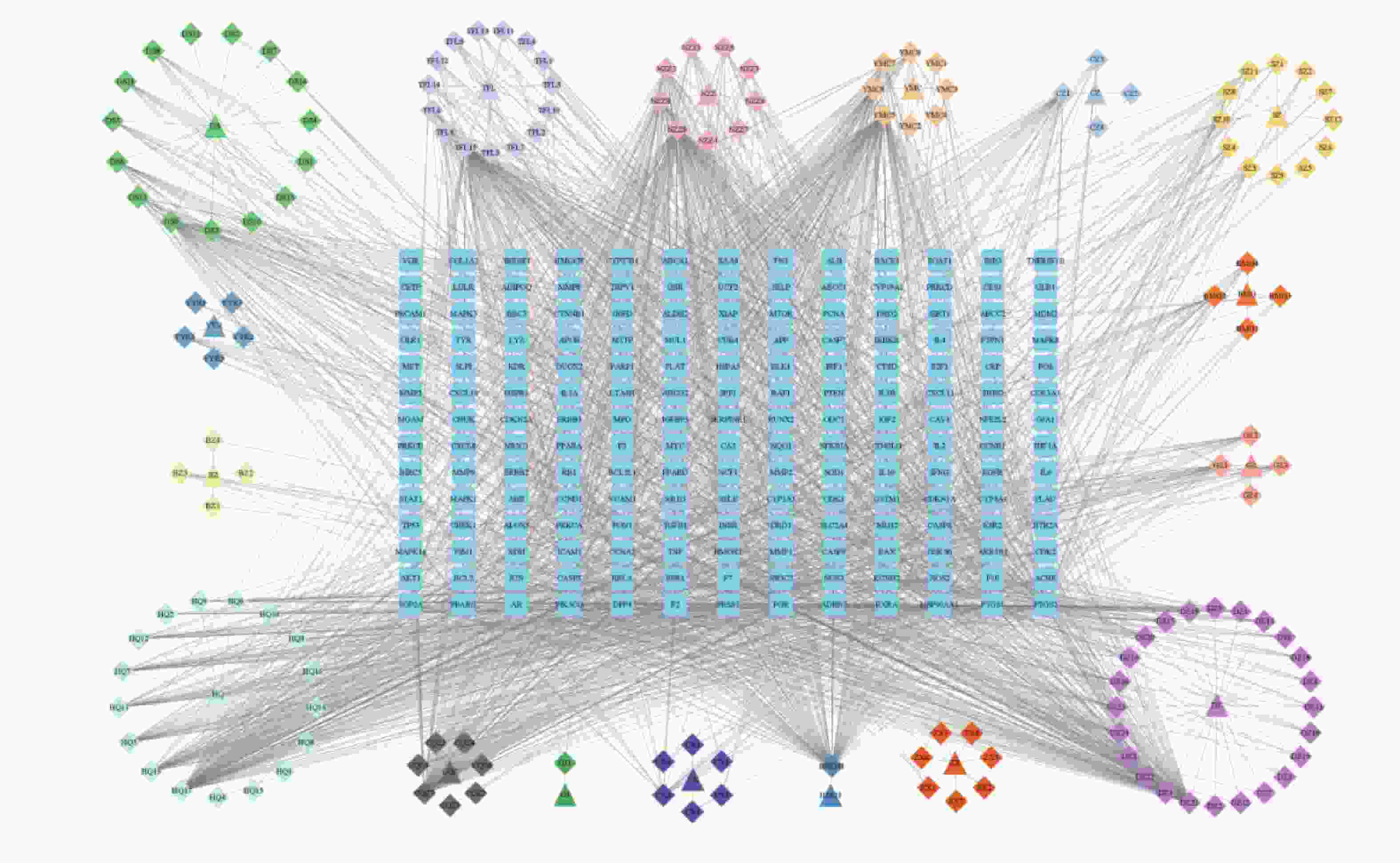 目的 基于数据挖掘、网络药理学预测中药治疗IgA肾病(IgA nephropathy,IgAN)的机制,通过体外实验验证。 方法 在古今医案云平台检索治疗IgAN的名家医案,筛选核心药物。在TCMSP等数据库检索药物靶点,在Genecards等数据库中检索IgAN靶点,用韦恩图取交集,建立疾病-成分-靶点网络图。建立PPI网络,进行GO与KEGG分析,采用分子对接验证。建立IgAN细胞模型,设立对照组、模型组(IgA)、不同浓度药物组(槲皮素),采用CCK-8法检测各组细胞活力;ELISA法检测各组分泌IL-6水平;qPCR法检测各组靶点水平。 结果 数据挖掘得到黄芪频次最高,达144次;中药属性以寒、甘、肝、清热解毒为主。网络药理学分析出核心物质为槲皮素、山柰酚、木犀草素、汉黄芩素、异鼠李素。PPI分析核心靶点为ESR1、IL6、BCL2、JUN、CASP3。分子对接验证了核心物质与靶点之间有强结合力。GO分析包含基因表达的正向调节;KEGG富集在AGE-RAGE信号通路、IL-17 信号通路等。实验验证了槲皮素组干预后细胞活力升高(P < 0.05),抑制了IL-6因子表达(P < 0.01),并上调了ESR1、BCL-2的mRNA水平(P < 0.05),下调IL-6、 JUN、 CASP3 水平(P < 0.05)。 结论 本研究挖掘IgAN的用药规律,筛选出治疗IgAN核心物质及对应靶点,实验验证了槲皮素增强IgA刺激下的细胞活力,抑制炎症因子分泌,调节靶点水平,为研究治疗IgAN分子机制提供有益参考。 Abstract:Objective To predict the mechanism of traditional Chinese medicine (TCM) in treating IgA nephropathy (IgAN) based on data mining and network pharmacology, and to verify findings through in vitro experiments. Methods Methods: Medical case records for IgAN treatment were retrieved from the Ancient and Modern Medical Case Cloud Platform to screen core drugs. Drug targets were searched in databases including TCMSP, and IgAN targets were searched in databases such as Genecards. Venn diagrams were used to identify intersecting targets, establishing disease-component-target network maps. PPI networks were constructed, followed by GO and KEGG analysis, with molecular docking validation. An IgAN cell model was established with control groups, model groups (IgA), and drug-treated groups at different concentrations (quercetin). Cell viability was detected using CCK-8 assays; IL-6 secretion levels were measured by ELISA; target gene expression levels were detected by qPCR. Results Data mining revealed Astragalus had the highest frequency at 144 occurrences; TCM properties were predominantly cold, sweet, hepatic-targeting, and heat-clearing with detoxifying effects. Network pharmacology analysis identified core substances as quercetin, kaempferol, luteolin, homoisoflavone, and isoleucine. PPI analysis identified core targets as ESR1, IL6, BCL2, JUN, and CASP3. Molecular docking verified strong binding affinity between core substances and targets. GO analysis included positive regulation of gene expression; KEGG enrichment pathways included AGE-RAGE signaling and IL-17 signaling pathways. Experimental verification showed that quercetin intervention increased cell viability (P < 0.05); suppressed IL-6 expression (P < 0.01), and upregulated ESR1, BCL-2 mRNA levels (P < 0.05), and downregulating IL-6, JUN, and CASP3 levels (P < 0.05). Conclusion This study elucidated medication patterns for IgAN treatment, identified core therapeutic substances and corresponding targets, and experimentally validated that quercetin enhances cell viability under IgA stimulation, suppresses inflammatory cytokine secretion, and modulates target gene expression, providing valuable insights for investigating molecular mechanisms of IgAN therapy. -