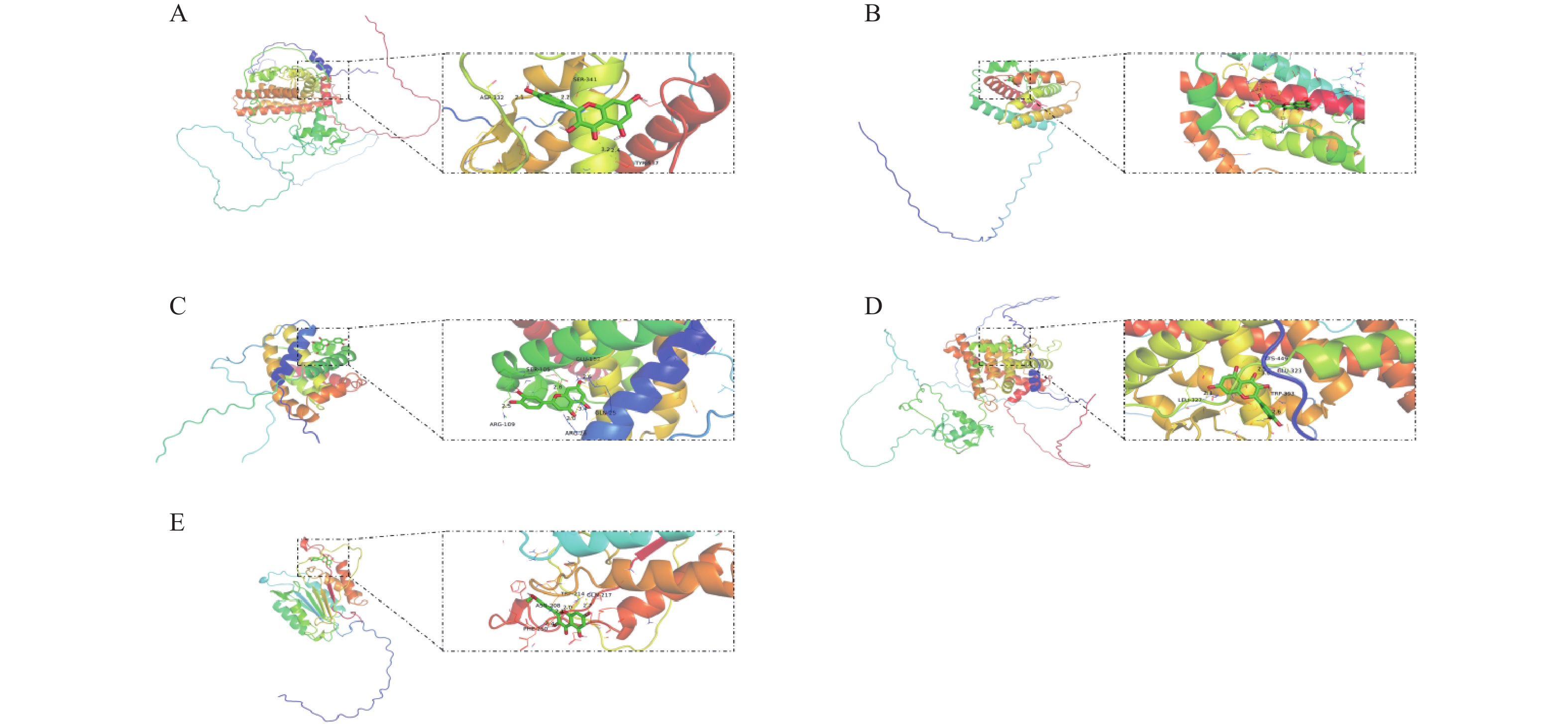 活性成分 ESR1 IL6 BCL2 JUN CASP3 quercetin −7.4 −7.7 −6.9 −5.6 −6.6 luteolin −7.9 −6.3 −7.1 −5.7 −7.1 kaempferol −7.4 −6.4 −7.5 −5.5 −6.8 wogonin −7.7 −6.1 −6.9 −5.4 −6.8 isorhamnetin −7.5 −5.9 −7.4 −5.4 −7.5 -