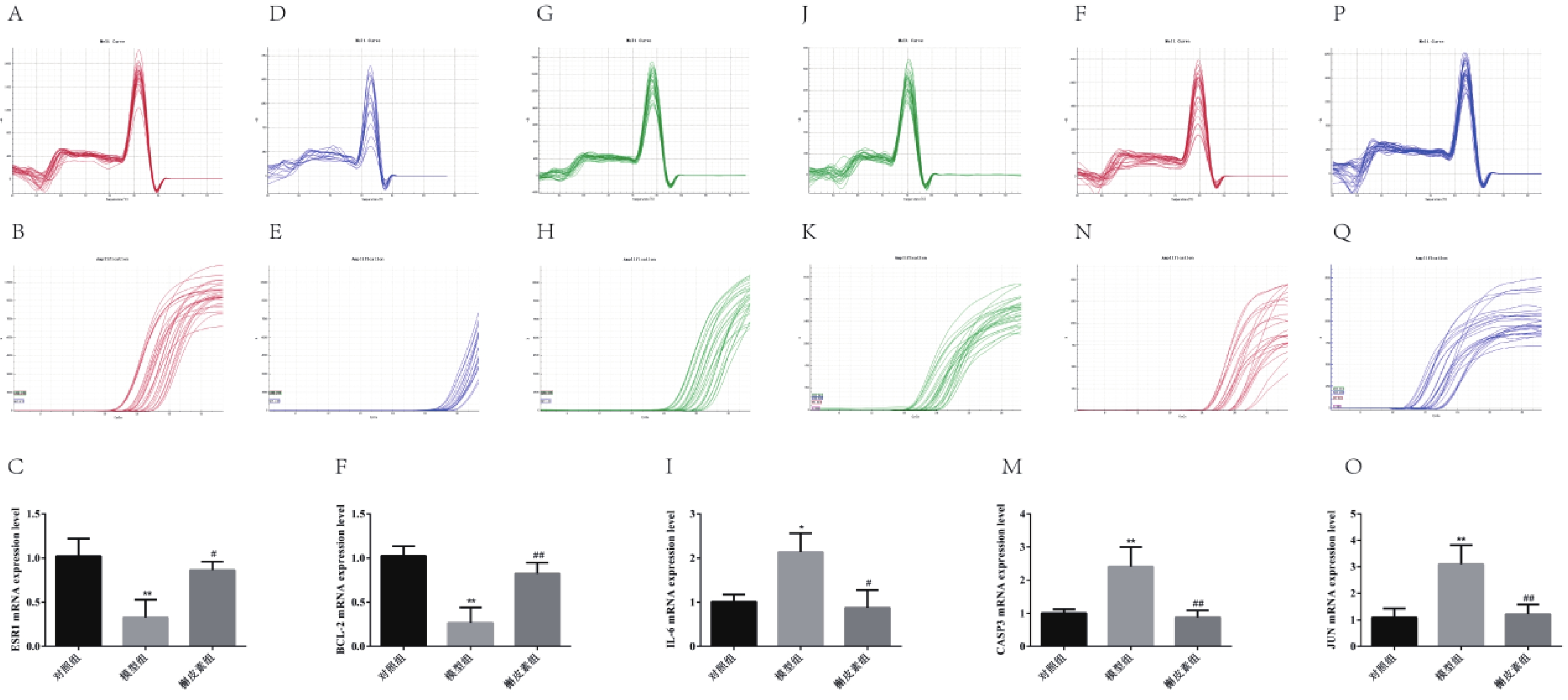 A~C:ESR1的溶解曲线图、扩增曲线图和结果柱状图;D~F:BCL-2的溶解曲线图、扩增曲线图和结果柱状图;G~I:IL-6的溶解曲线图、扩增曲线图和结果柱状图;J~M:CASP3的溶解曲线图、扩增曲线图和结果柱状图;F~O:JUN的溶解曲线图、扩增曲线图和结果柱状图;P~Q:内参GAPDH的溶解曲线图和扩增曲线图。模型组与对照组比较,*P < 0.05;**P < 0.01;槲皮素组与模型组比较,#P < 0.05;##P < 0.01。