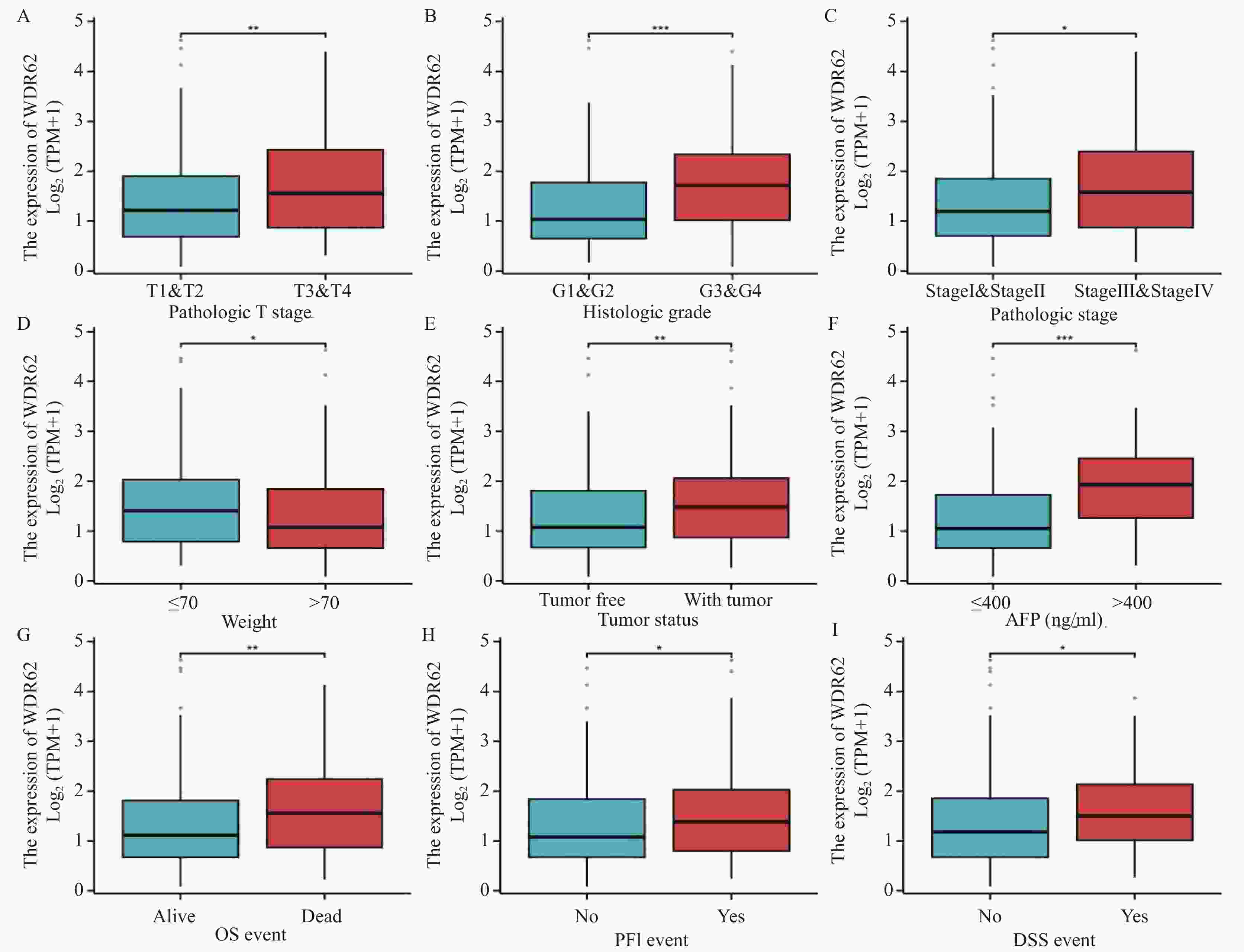 A: WDR62在病理T分期中的差异;B:WDR62在组织学分级中的差异;C:WDR62在病理分期中的差异;D:WDR62在体重方面的差异;E:WDR62在肿瘤状态中的差异;F:WDR62在AFP中的差异;G:WDR62在OS中的差异;H:WDR62在PFS中的差异;I:WDR62在DSS中的差异。*P < 0.05;**P < 0.01;***P < 0.001。