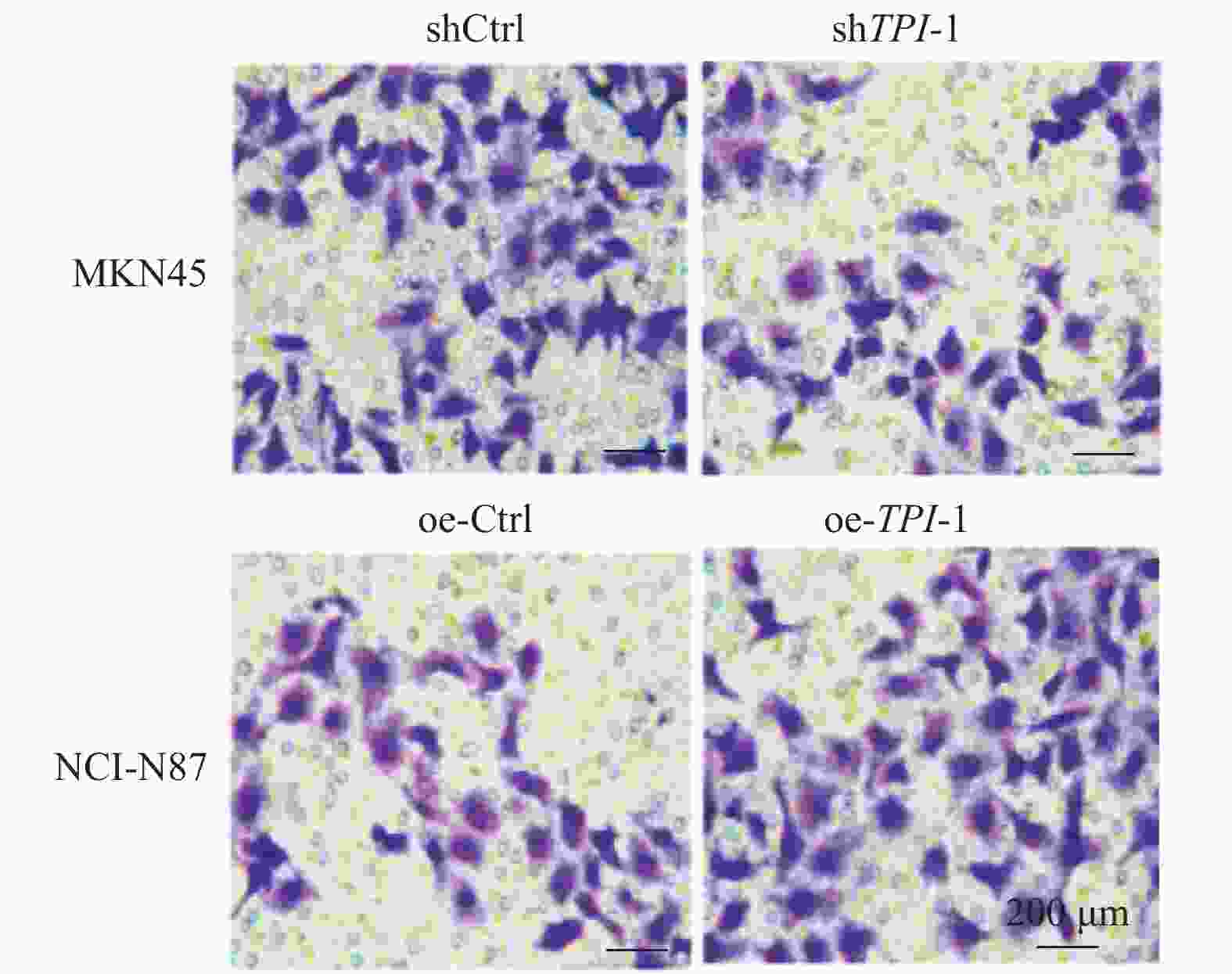 组别 24 h 48 h 72 h oe-Ctrl 0.41 ± 0.01 0.50 ± 0.06 0.70 ± 0.04 oe-TPI-1 0.41 ± 0.06 0.48 ± 0.06 0.85 ± 0.04 t 0.19 0.29 5.22 P 0.86 0.79 0.006** **P < 0.01。 表 3 TPI-1对胃癌细胞侵袭的影响($\bar x \pm s $,n = 3)