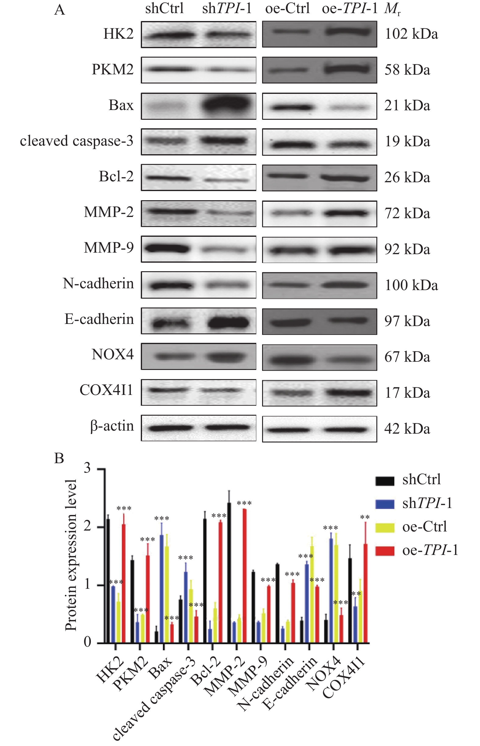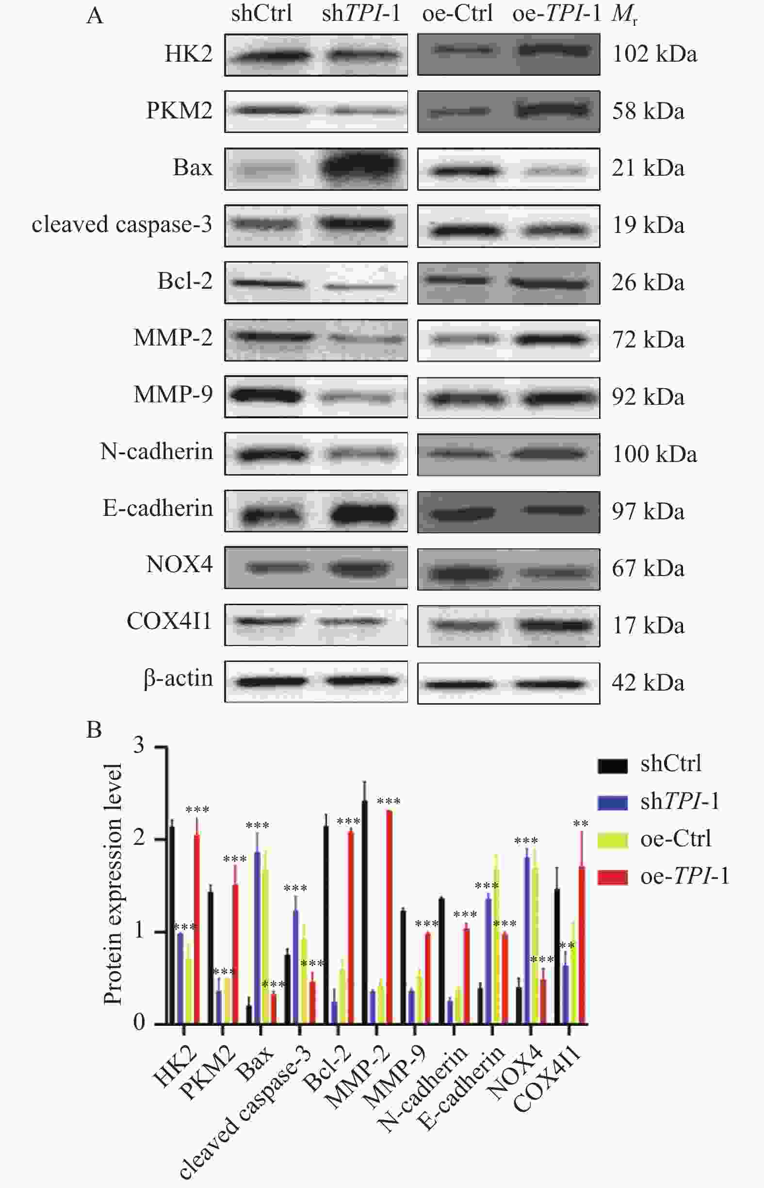 A:HK2、PKM2、Bax、cleaved caspase-3、Bcl-2、MMP-2、MMP-9、N-cadherin、E-cadherin、NOX4和COX4I1蛋白与对照细胞相比,在shTPI-1细胞与oe-TPI-1细胞中的表达情况;B:蛋白表达含量的量化柱状图,与shCtrl组比较,**P < 0.01;***P < 0.001;与oe-Ctrl组比较,**P < 0.01;***P < 0.001。HK2:己糖激酶2;PKM2:丙酮酸激酶同工酶; MMP-2:金属蛋白酶-2;MMP-9:金属蛋白酶-9;E-cadherin:E型钙粘蛋白;N-cadherin:N型钙粘蛋白;Bcl-2:B淋巴细胞瘤-2;Bax:促凋亡蛋白;cleaved caspase-3:剪切的半胱天冬蛋白酶-3;NOX4: NADPH氧化酶4;COX4I1:细胞色素c氧化酶亚基。