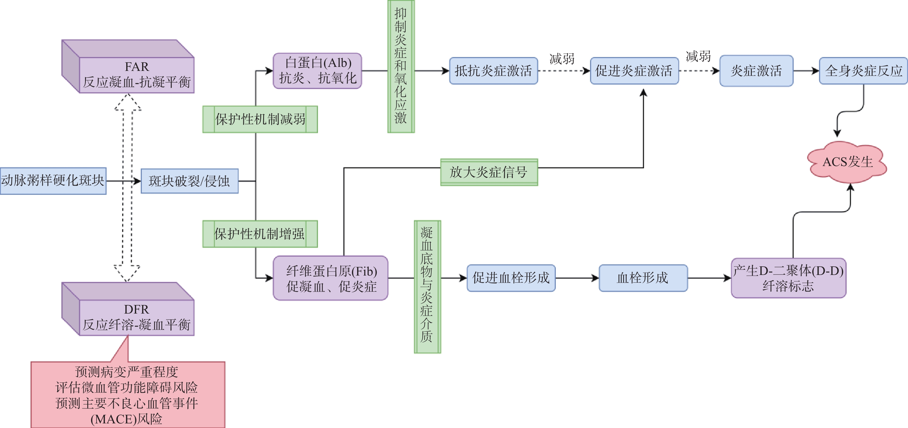 急性冠脉综合征(acute coronary syndromes,ACS)是冠状动脉粥样硬化进程中,不稳定的粥样硬化斑块破裂或糜烂继发新鲜血栓形成所导致的心脏急性缺血综合征。近年来,基于凝血-炎症通路的生物标志物,如血浆D-二聚体/纤维蛋白原比值(D-dimer/fibrinogen ratio,DFR)、纤维蛋白原/白蛋白比值(fibrinogen/albumin ratio,FAR),因其与斑块稳定性、血栓负荷及微血管功能障碍密切相关,成为预测冠脉病变严重程度的研究热点。系统综述了DFR、FAR在ACS患者冠脉病变评估中的机制及临床应用价值,指出DFR、FAR在评估ACS患者的冠脉病变程度,以及为后续制定合理的治疗方案和改善预后等方面的重要意义。