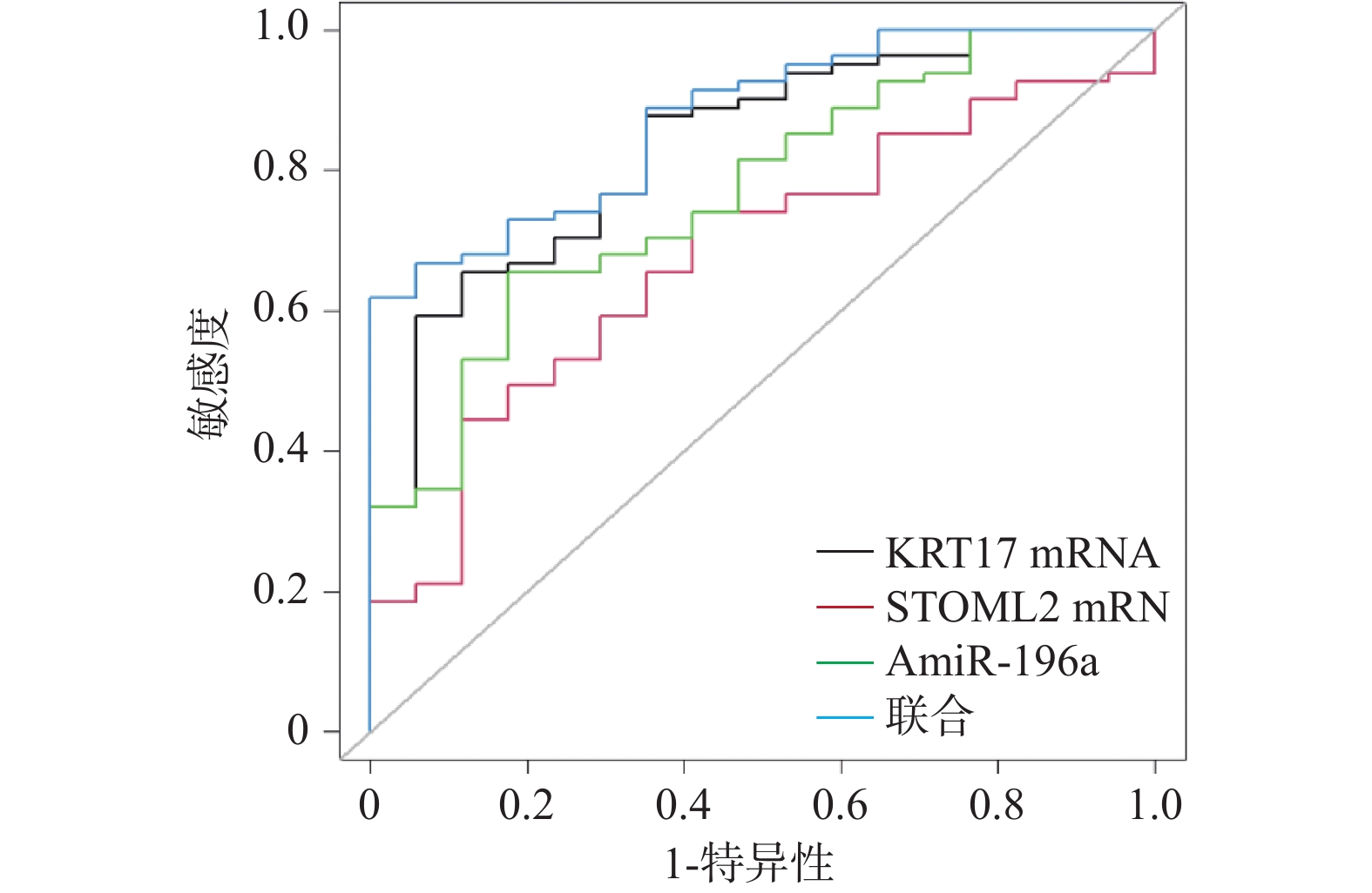 目的 探讨角蛋白17(keratin 17,KRT17)、人口型蛋白样蛋白2(stomatin-like protein 2,STOML2)、微小RNA-196a(microRNA-196a,miR-196a)在宫颈病变组织中的表达及在宫颈癌病理学评估中的价值。 方法 回顾性纳入2022年1月-2024年1月206例患者的宫颈组织,包括宫颈癌98例、宫颈上皮瘤变(CIN3 )65例、正常43例,采用RT-qPCR检测KRT17 mRNA、STOML2 mRNA及miR-196a表达,分析其与宫颈癌病理特征的相关性,随访宫颈癌患者1年结局,采用Cox回归筛选预后影响因素,并以ROC评估单指标及联合预测效能,Western blot对STOML2相关信号通路关键蛋白磷酸化水平进行验证。 结果 KRT17 mRNA、STOML2 mRNA及miR-196a在对照组、CIN3组、宫颈癌组组织中呈递增表达趋势(P < 0.05);多因素Logistic结果显示,在控制混杂因素后,三种分子表达水平均为宫颈病变等级的独立影响因素;KRT17 mRNA(OR = 2.42,95%CI:1.61~3.66,P < 0.001)、STOML2 mRNA(OR = 2.19,95%CI:1.39~3.46,P = 0.001)和 miR-196a(OR = 2.76,95%CI:1.65~4.32,P < 0.001)均显著与病变等级升高相关;宫颈癌组织中KRT17 mRNA、STOML2 mRNA、miR-196a高表达与TNM分期、分化程度及淋巴结转移相关(P < 0.05);98例宫颈癌患者随访1年死亡17例(17.35%);Cox回归提示TNMⅢ期、低分化、淋巴结转移及癌组织KRT17 mRNA、STOML2 mRNA、miR-196a高表达为死亡的独立危险因素(P < 0.05)。癌组织KRT17 mRNA、STOML2 mRNA、miR-196a联合检测宫颈癌患者预后的AUC为0.873,敏感度61.73%,特异度99.06%。Western blot结果提示STOML2下调可抑制NF-κB通路相关蛋白磷酸化水平。 结论 KRT17、STOML2及miR-196a在宫颈癌组织中高表达并与不良预后相关,其通过NF-κB信号通路协同促进肿瘤进展。联合检测三者可提高宫颈癌患者预后预测的准确性,具有潜在临床转化价值。