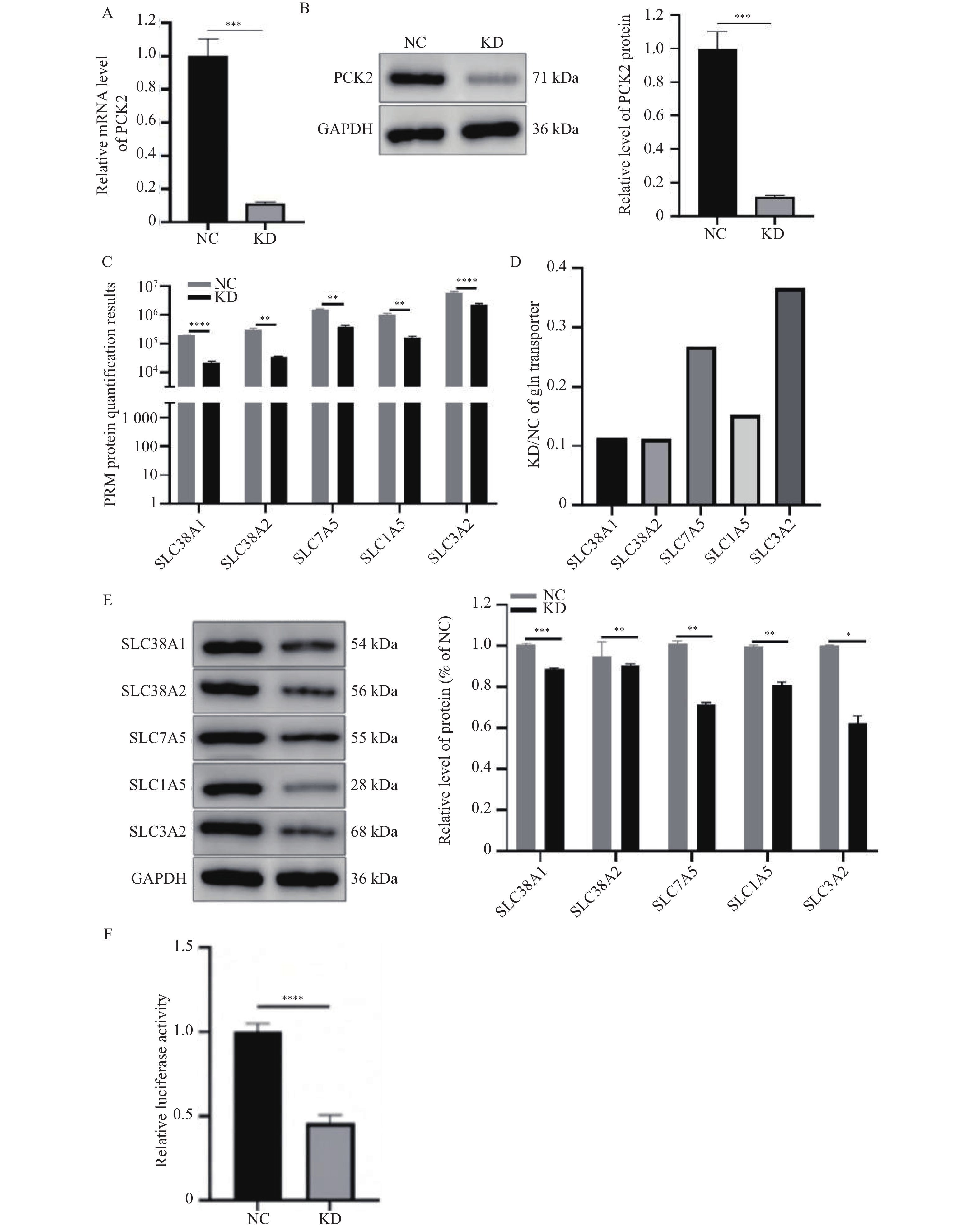 目的 探讨在低糖环境下,磷酸烯醇式丙酮酸羧激酶2(phosphoenolpyruvate carboxykinase2,PCK2)调控谷氨酰胺(glutamine,Gln)转运的分子机制及其对非小细胞肺癌(non-small cell lung cancer,NSCLC)细胞恶性行为的影响。 方法 在人NSCLC细胞系A549上构建PCK2稳定敲低细胞系(KD组)及阴性对照(NC组)。所有体外实验均独立重复3次 (n = 3)。采用PRM蛋白质组学、Western blot和双荧光素酶报告基因实验检测PCK2对溶质载体家族38成员2(solute carrier family 38 member 2,SLC38A2)转录和蛋白表达的影响。在低糖条件 (1000 mg/L葡萄糖) 下,通过MTT法、划痕实验和流式细胞术分析细胞增殖、迁移和凋亡。最后设置Gln补充组(KD+Gln组)和SLC38A2过表达组(KD+SLC38A2组)进行功能挽救实验。 结果 PCK2敲低后,SLC38A2启动子活性下降约60%(P < 0.0001 ),蛋白表达亦显著降低(P < 0.01)。低糖条件下,KD组细胞增殖受抑制,24 h迁移率(约20%)显著低于NC组(约55%,P < 0.0001 ),凋亡率(约13%)显著高于NC组(约4.5%,P < 0.0001 )。补充Gln或过表达SLC38A2均能显著逆转上述现象,使迁移率恢复至约50%(P < 0.01 vs. KD组),凋亡率降至约5.5%(P < 0.0001 vs. KD组)。 结论 在低糖状态下,PCK2通过在转录水平上调控SLC38A2的表达,维持Gln摄取,从而促进NSCLC细胞的增殖、迁移和存活。PCK2-SLC38A2轴揭示了肿瘤代谢重编程的新机制,可能是一个潜在的NSCLC治疗靶点。