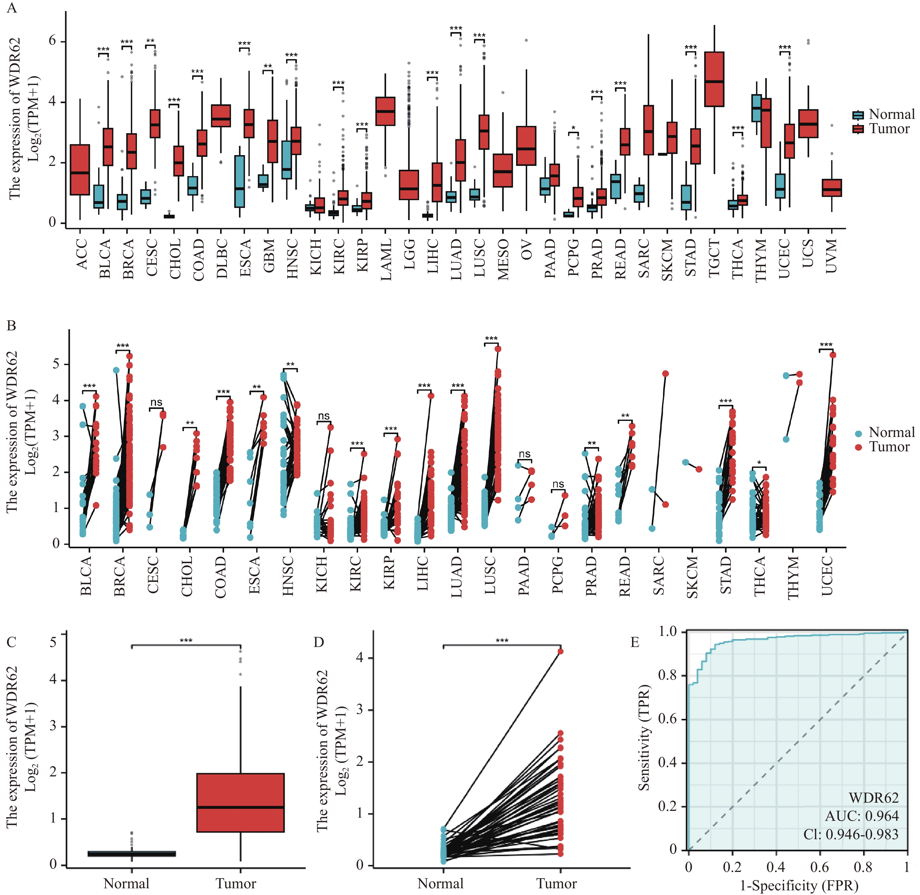 目的 探讨WDR62在肝细胞肝癌(hepatocellular carcinoma,HCC)中的表达特征及其与临床病理特征和预后的关系,并基于WDR62构建总生存(overall survival,OS)预测列线图模型。 方法 利用癌症基因组图谱(the cancer genome atlas,TCGA)肝细胞肝癌队列(TCGA-LIHC)RNA-seq 及临床资料,比较癌与癌旁WDR62 mRNA 表达差异,并通过受试者工作特征(receiver operating characteristic,ROC)曲线评估其诊断价值。按 WDR62 表达中位数分为高、低表达组,分析其与临床病理特征及OS、生存结局〔肿瘤特异性生存(disease-specific survival,DSS)、无进展生存(progression-free survival,PFS)〕的关系。采用单因素和多因素 Cox 回归筛选 OS 独立危险因素,在此基础上构建预后列线图;通过 Harrell C 指数(Harrell’ s concordance index,C-index)、校准曲线和决策曲线分析(decision curve analysis,DCA)评价模型性能。另收集昆明医科大学第二附属医院配对手术标本,行免疫组织化学(immunohistochemistry,IHC)检测 WDR62 蛋白表达。 结果 TCGA-LIHC共纳入 HCC 424 例及癌旁组织50 例,WDR62 在 HCC 中表达显著升高(P < 0.001),区分癌与癌旁的曲线下面积(area under the curve,AUC)为 0.964。WDR62 高表达组病理Ⅲ~Ⅳ期、组织学 G3~G4、甲胎蛋白(alpha-fetoprotein,AFP)>400 ng/mL 及有肿瘤状态患者比例升高,OS 死亡事件更多(均 P < 0.05)。Kaplan-Meier 分析显示,高表达组 OS、DSS 和 PFS 均明显低于低表达组(OS:P = 0.004)。多因素 Cox 分析表明,病理 T3~T4 期、有肿瘤状态及WDR62高表达是OS的独立危险因素,其中WDR62高表达风险比(hazard ratio,HR)为 1.656(95% 置信区间 confidence interval,CI:1.028~2.667,P = 0.038)。列线图模型 Harrell C-index 为 0.629(95%CI:0.576~0.680),1、3、5 年OS校准良好,DCA显示在约0.05~0.20阈值概率范围内模型具有较高净获益。该院IHC队列中,HCC 组织WDR62蛋白表达亦高于癌旁(P < 0.05)。 结论 WDR62在HCC中高表达并与肿瘤进展及不良预后相关。基于WDR62及临床病理特征构建的OS预后列线图在 TCGA-LIHC队列中具有一定预测能力,可为HCC风险分层和预后评估提供参考。