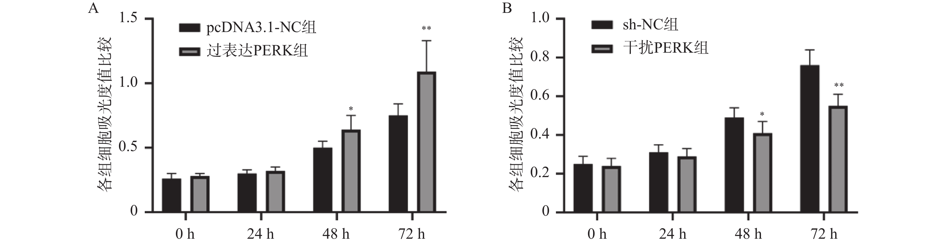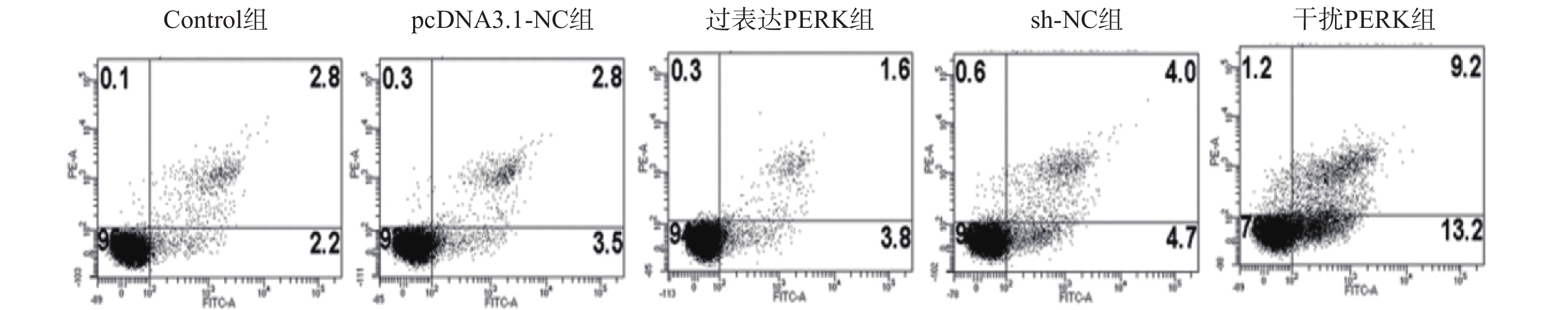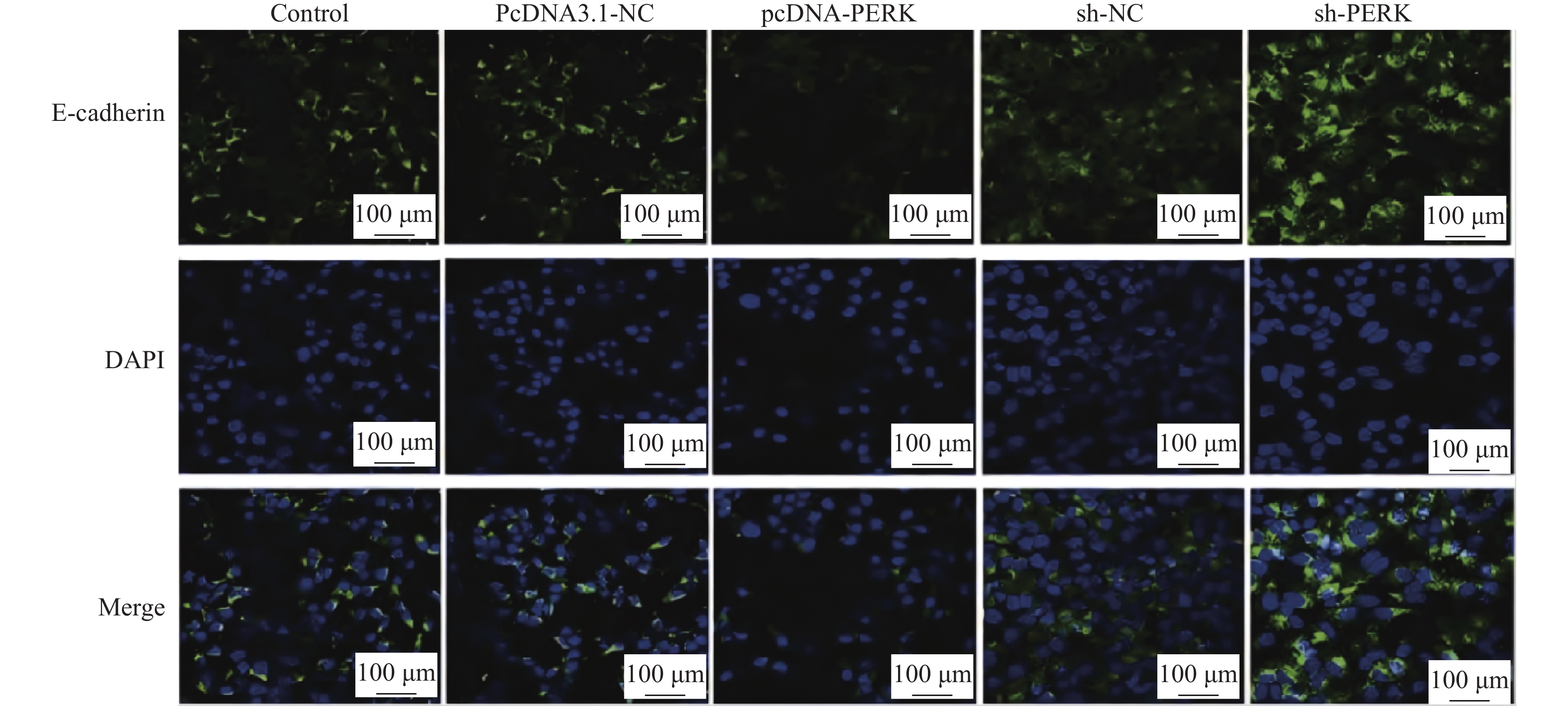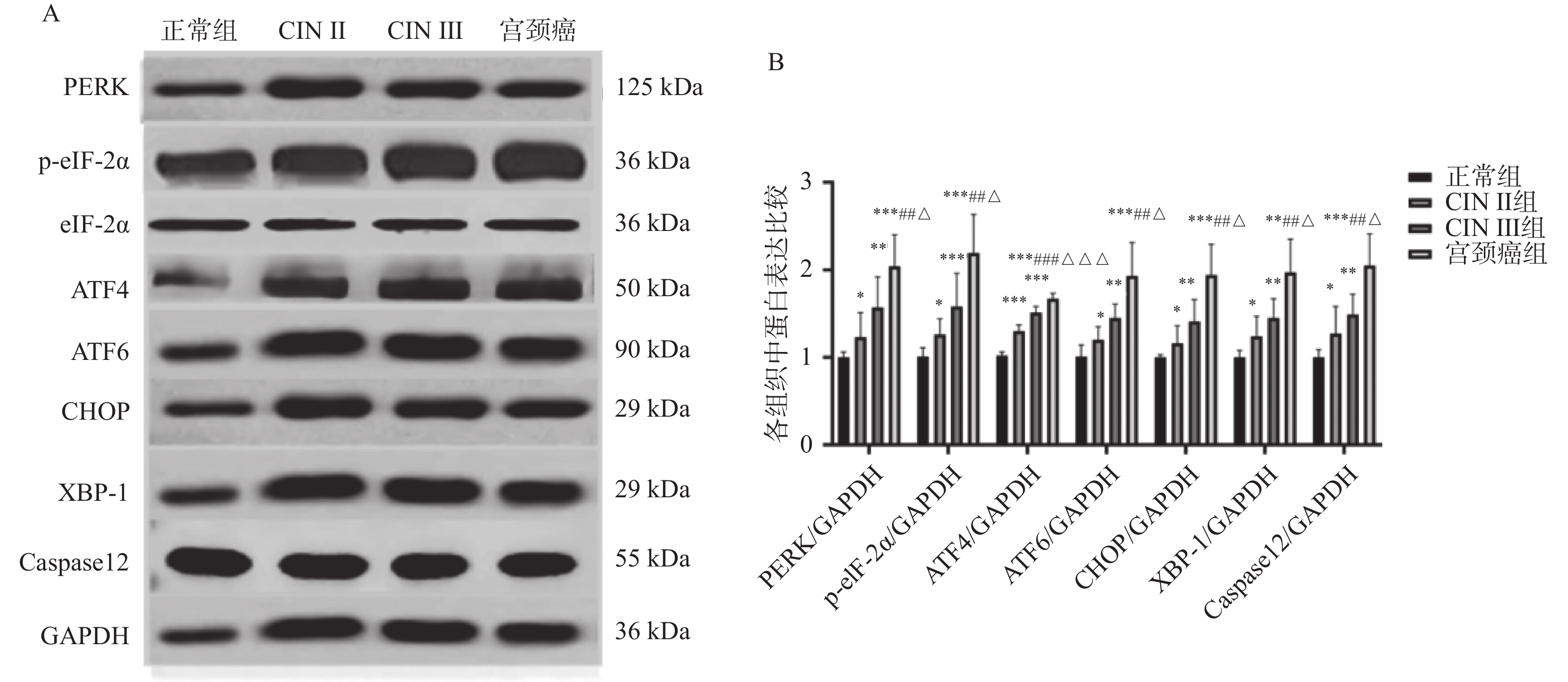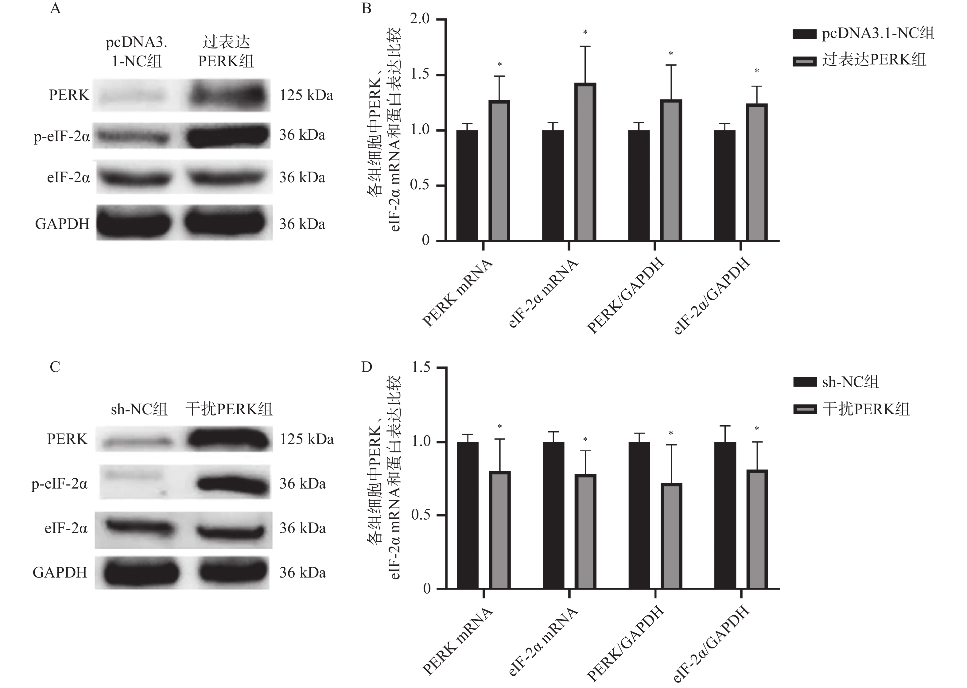 目的 探讨内质网应激蛋白激酶R样内质网激酶(stress protein kinase R-like endoplasmic reticulum kinase,PERK)/真核启动因子2α(eukaryotic initiation factor 2α,eIF-2α)信号通路在宫颈上皮内瘤变(cervical intraepithelial neoplasia,CIN)和宫颈癌(cervical carcinoma,CC)中的表达及其对肿瘤进程的影响。 方法 收集29例CC患者活检标本为宫颈癌组,26例宫颈上皮内瘤变(CIN Ⅱ级、CIN Ⅲ级)作为对照组,17例健康子宫患者的宫颈组织为正常组。Western blot法检内质网介导相关蛋白的表达;免疫组织化学法检测PERK/eIF-2α在CC中的染色状况。将HeLa细胞分为对照组、pcDNA3.1-NC组、过表达PERK组、sh-NC组、干扰PERK组,采用CCK-8法检测细胞增殖活性,免疫荧光染色观察细胞内上皮型钙黏蛋白(E-cadherin)表达,应用流式细胞术检测细胞凋亡与周期分布,Transwell实验评估细胞迁移与侵袭能力。 结果 随着CIN分级程度的增加,PERK/eIF-2α表达升高(P < 0.05),且CC组织PERK/eIF-2α表达显著高于CIN组织(P < 0.05);与pcDNA3.1-NC组比较,过表达PERK组细胞增殖活性升高,细胞内E-cadherin荧光表达明显减弱(P < 0.05),E-cadherin蛋白表达下调(P < 0.05),促进细胞增殖、迁移与侵袭,抑制细胞凋亡(P < 0.05);与sh-NC组比较,干扰PERK组细胞增殖活性降低,细胞内E-cadherin荧光表达则明显增强(P < 0.05),E-cadherin蛋白表达上调(P < 0.05),抑制细胞增殖、迁移与侵袭,促进细胞凋亡(P < 0.05)。 结论 内质网应激PERK/eIF-2α在子宫内瘤变和CC组织中表达升高,抑制其表达能够降低CC肿瘤细胞增殖,从而减缓肿瘤进程。