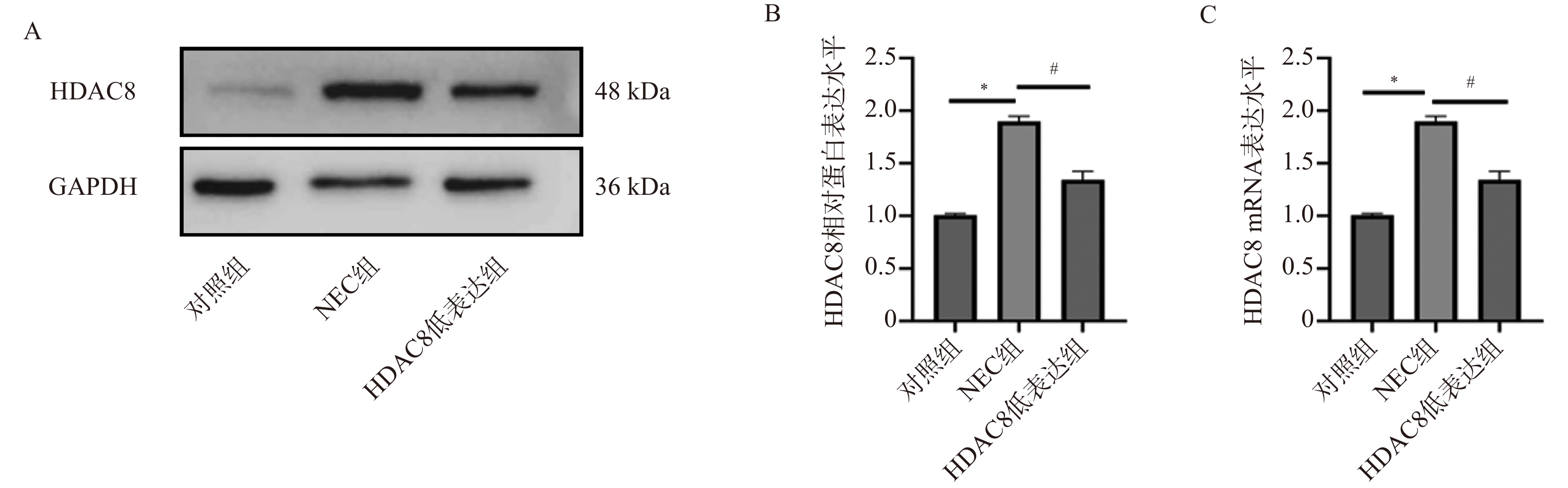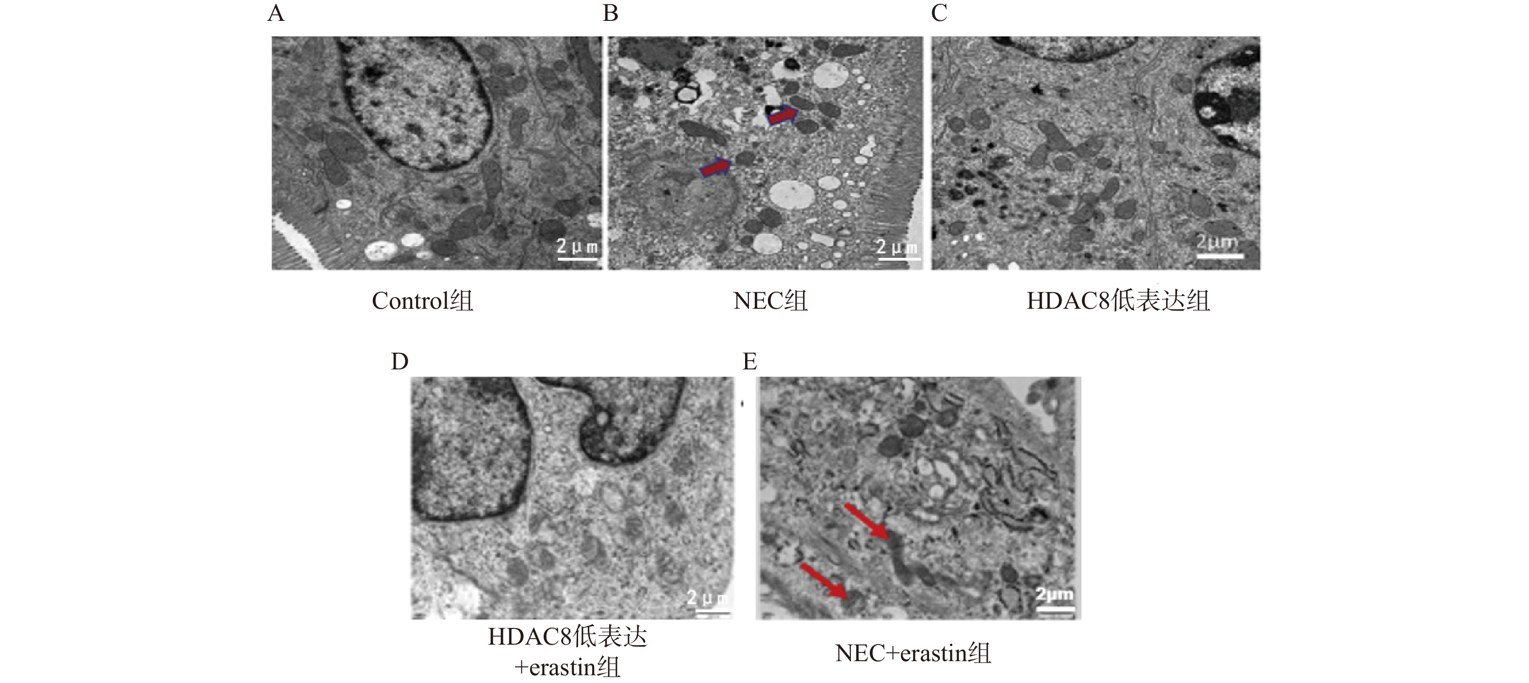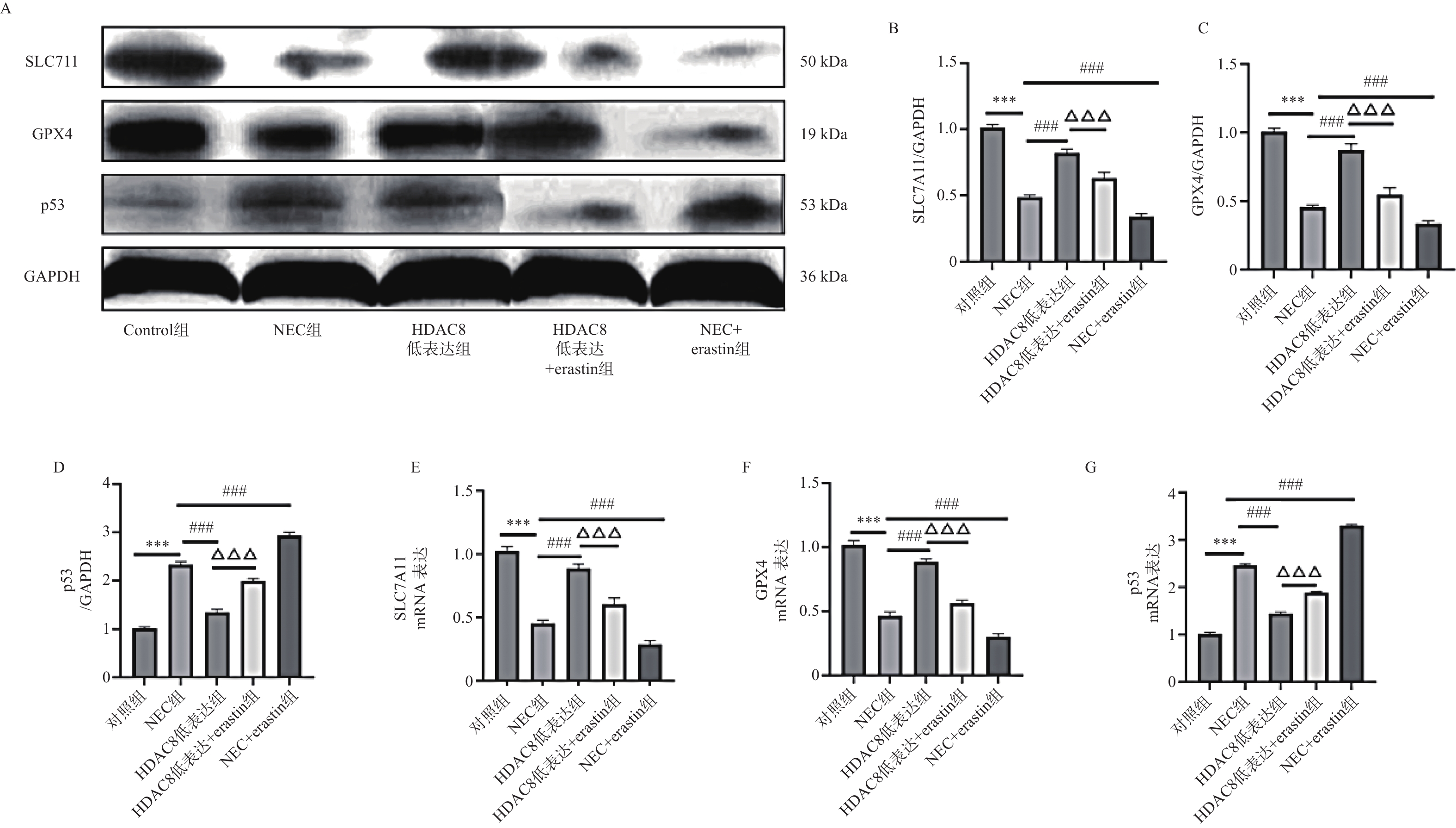 目的 探讨组蛋白去乙酰酶8(histone deacetylase 8,HDAC8)抑制剂PCI-34051 对坏死性小肠结肠炎(necrotizing enterocolitis,NEC)小鼠肠道损伤的保护作用及其与铁死亡(ferroptosis)的关系,并通过体外实验进一步验证HDAC8在肠上皮细胞铁死亡中的作用机制。 方法 选取40只出生8~11 d SPF级雄性C57BL/6小鼠,随机分为对照组、NEC组、HDAC8低表达组(NEC+PCI-34051 )、HDAC8低表达+Erastin组(NEC+PCI-34051 +Erastin)及NEC+Erastin组(每组8只)。采用缺氧加冷应激法建立NEC模型,给予HDAC8抑制剂PCI-34051 (20 mg/kg)及/或铁死亡诱导剂Erastin(40 mg/kg)腹腔注射,每日1次,共14 d。检测肠道组织病理学变化、氧化应激及炎症指标、铁死亡相关蛋白(SLC7A11、GPX4、p53)表达及线粒体超微结构。同时采用小鼠肠上皮细胞系IEC-6进行体外实验,分为对照组、Erastin组、HDAC8低表达组(PCI-34051 )、HDAC8过表达组(ADV-HDAC8)及HDAC8低表达+SLC7A11敲低组。通过qRT-PCR与Western blot检测HDAC8、SLC7A11、GPX4及ACSL4的表达,并检测细胞活性变化。 结果 与对照组相比,NEC组小鼠肠道结构紊乱,炎性细胞浸润明显,GSH下降(P < 0.001),MDA、ROS及Fe2+升高(P < 0.001),SLC7A11和GPX4表达下降(P < 0.001),p53升高(P < 0.001);HDAC8低表达组肠道组织损伤明显减轻,GSH表达增加,MDA、ROS及Fe2+降低,SLC7A11和GPX4表达增加,p53降低(P < 0.001)。Erastin干预可部分逆转PCI-34051 的保护作用。体外实验结果一致:Erastin诱导IEC-6细胞铁死亡,HDAC8抑制上调SLC7A11和GPX4并提高细胞活性,而HDAC8过表达或SLC7A11敲低均增强铁死亡表型(P < 0.001)。 结论 HDAC8抑制剂PCI-34051 可通过上调SLC7A11/GPX4、抑制p53信号通路,减轻NEC小鼠及肠上皮细胞的氧化应激、炎症反应及线粒体损伤,其保护作用与抑制铁死亡密切相关。