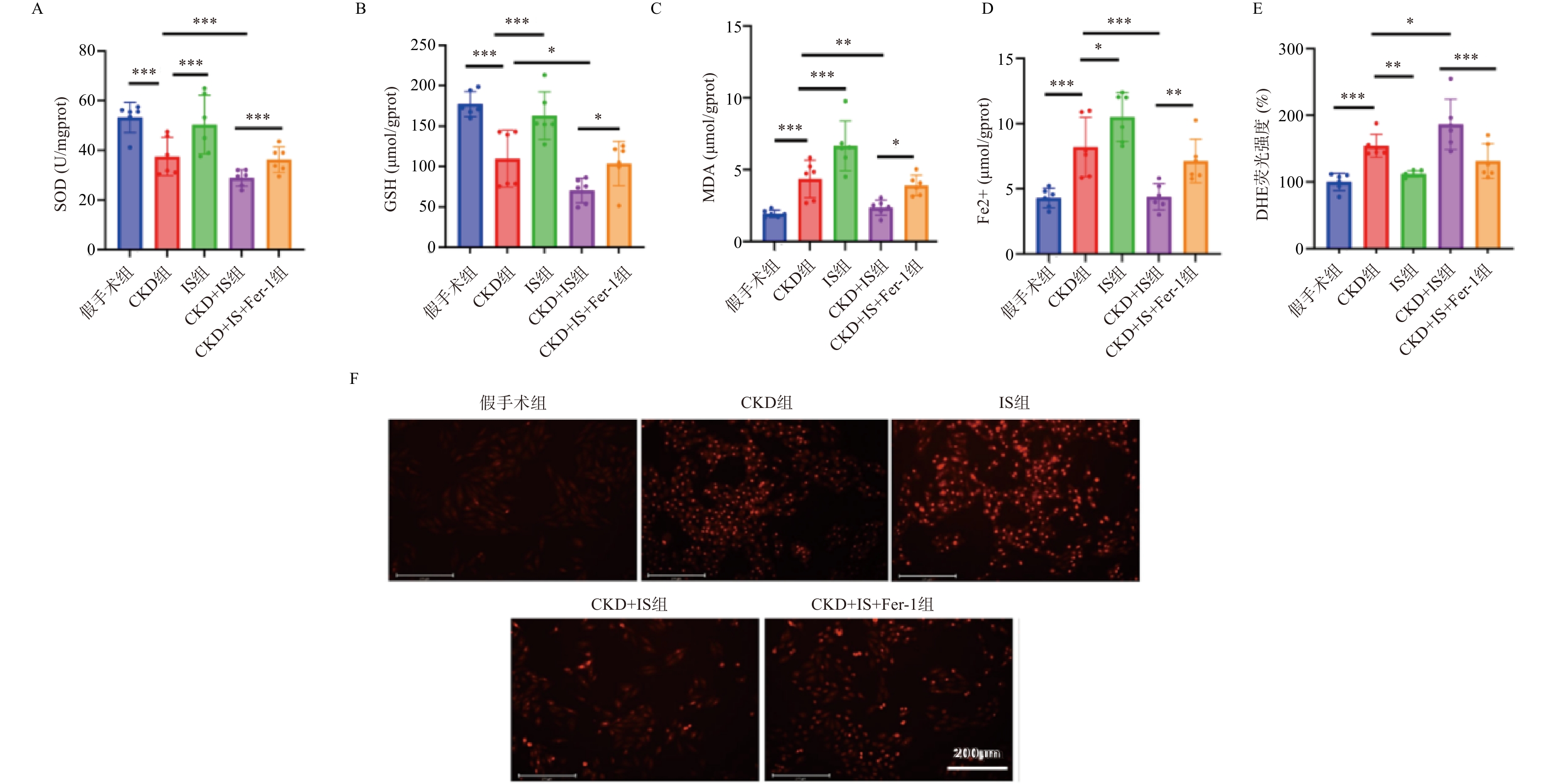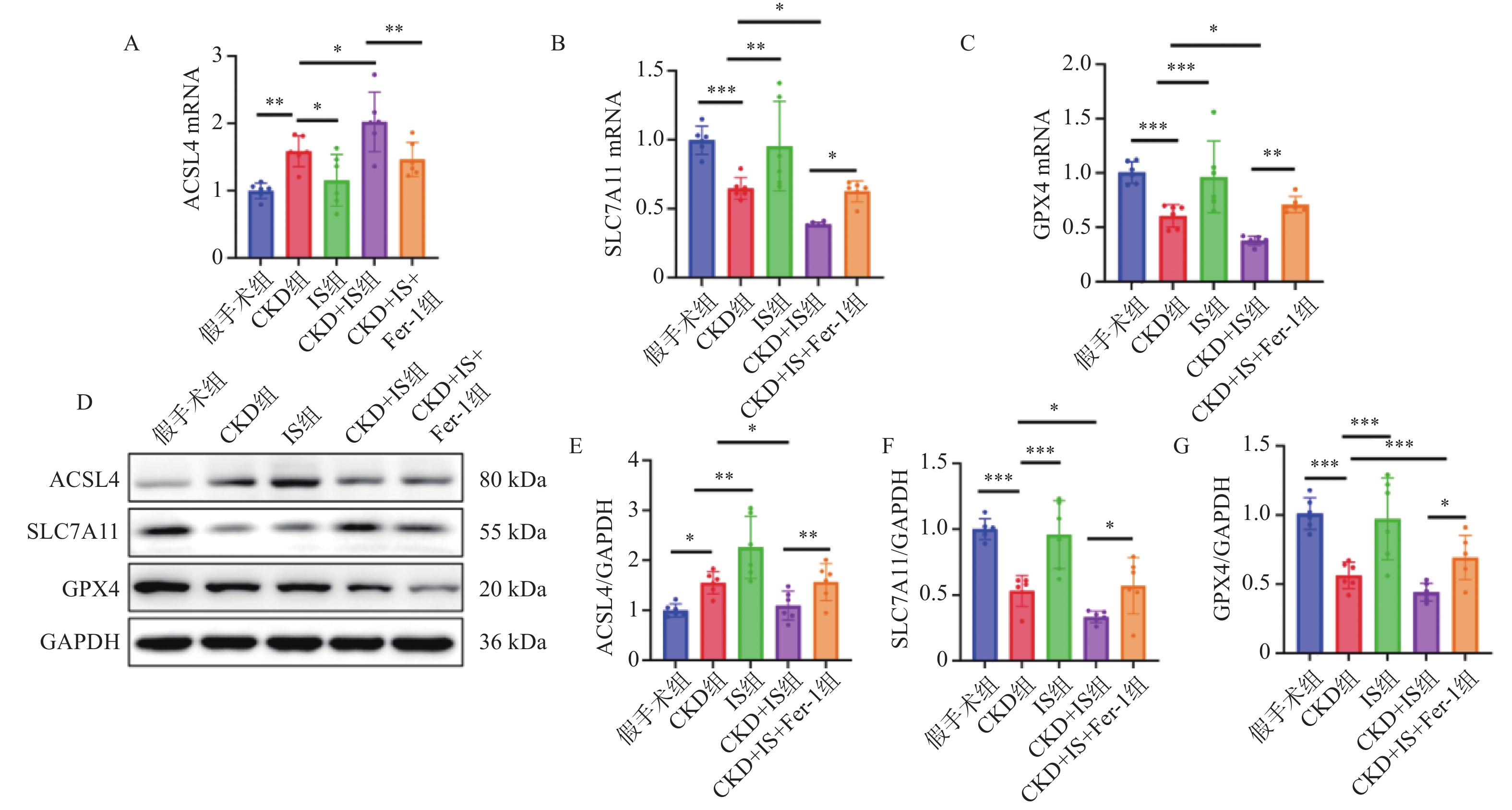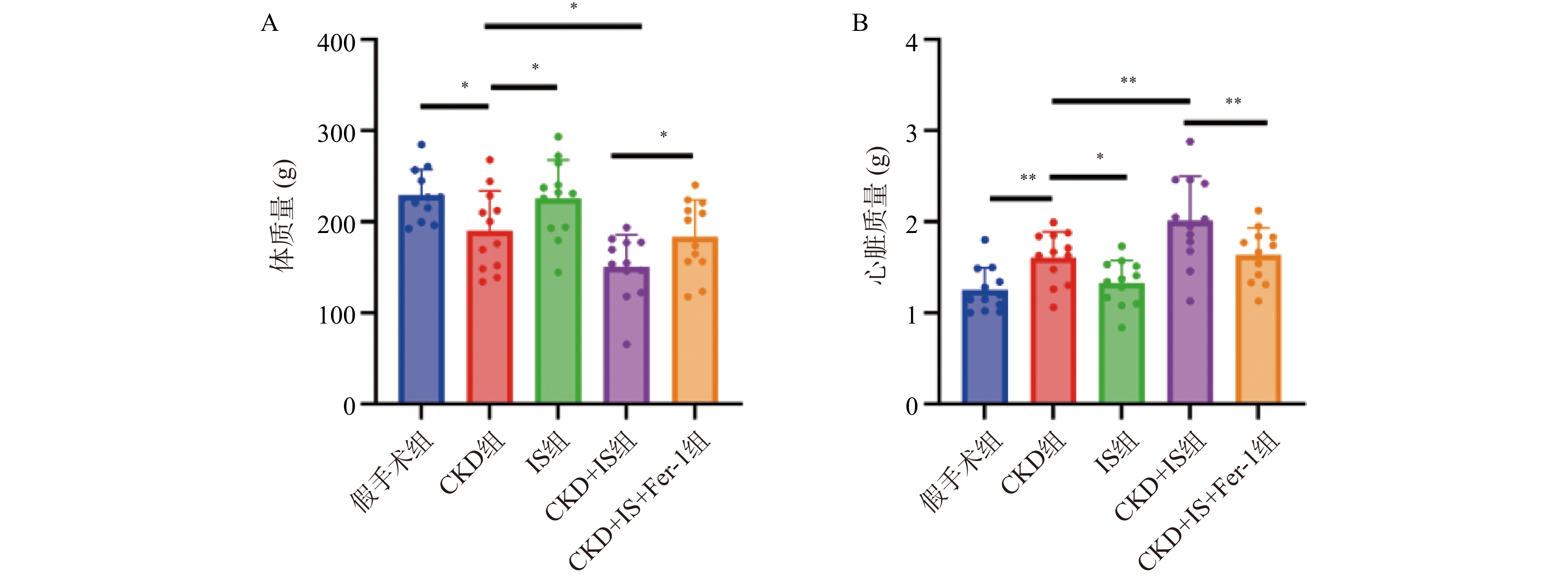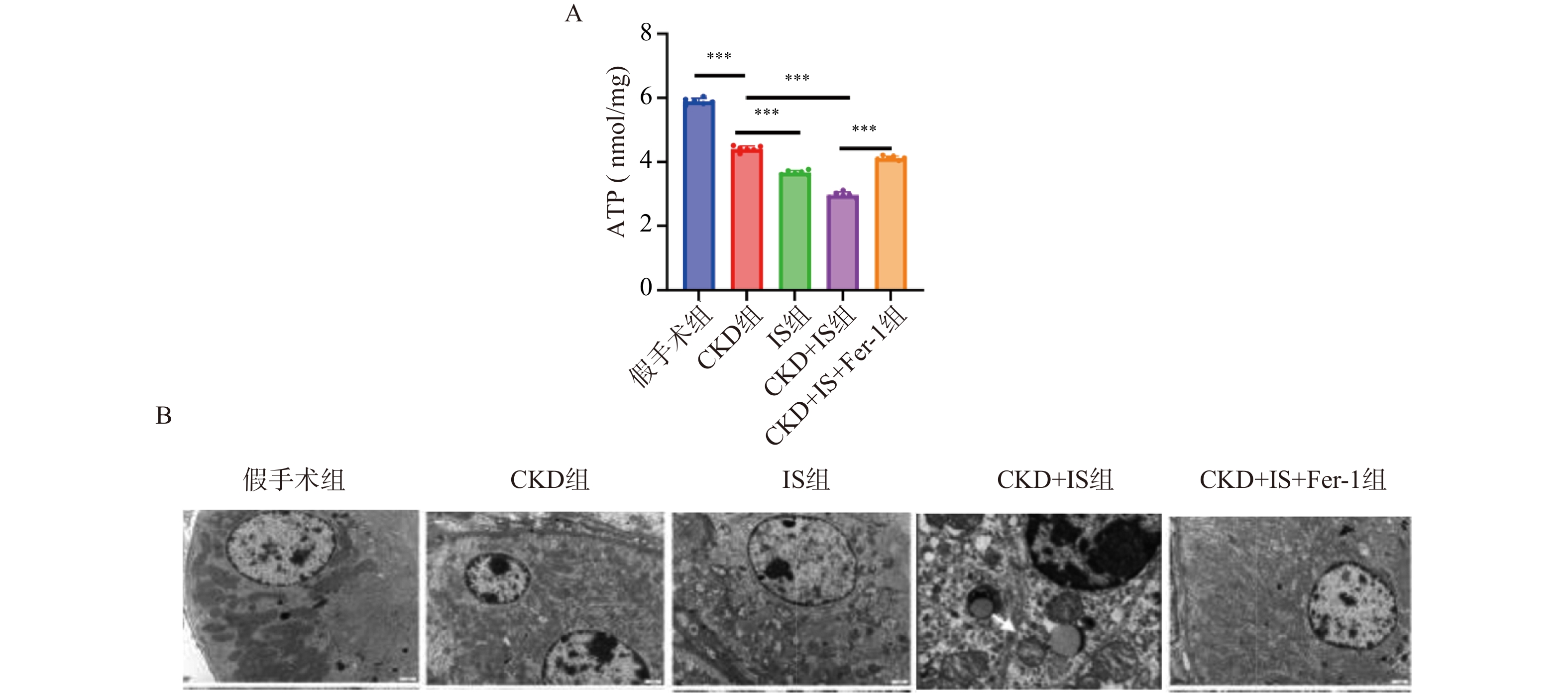 目的 探讨尿毒症毒素硫酸吲哚酚(indoxyl sulfate,IS)在慢性肾病(chronic kidney disease,CKD)大鼠心肌损伤中的作用及其通过线粒体途径介导铁死亡的机制。 方法 采用5/6肾切除法建立CKD模型,将大鼠随机分为假手术组、CKD组、IS组、CKD+IS组及CKD+IS+铁死亡抑制剂Ferrostatin-1(Fer-1)组。通过比色法检测心肌组织超氧化物歧化酶(superoxide dismutase,SOD)活性、丙二醛(malonaldehyde,MDA)、还原型谷胱甘肽(reduced glutathione hormone,GSH)及Fe2+含量;采用二氢乙啶(dihydropyridine,DHE)荧光法观察活性氧(reactive oxygen,ROS)水平;RT-qPCR与Western blot检测铁死亡相关基因长链脂肪酸-CoA合成酶4(acyl-coA synthetase long-chain family member 4,ACSL4)、胱氨酸/谷氨酸逆转运蛋白(solute carrier family 7 member 11,SLC7A11)和GPX4的mRNA及蛋白表达;TUNEL法评估心肌细胞凋亡;同时检测线粒体ATP含量并通过透射电镜观察其超微结构变化。 结果 与假手术组相比,CKD组大鼠体重下降,心脏质量增加(P < 0.05),SOD与GSH水平下降,MDA、Fe2+及ROS显著升高(P < 0.05);ACSL4表达上调,而SLC7A11与GPX4显著下调(P < 0.05),并伴随大量心肌细胞凋亡及ATP含量减少(P < 0.05)。慢性IS暴露进一步加剧上述变化(P < 0.05),表现为线粒体肿胀、嵴断裂及膜密度增加等典型铁死亡超微结构特征;而Fer-1干预可逆转这些损伤,使ATP水平恢复、线粒体形态改善。 结论 IS可通过激活线粒体途径诱导铁死亡,加重CKD大鼠心肌氧化应激与能量代谢障碍,从而促进心肌细胞凋亡;Fer-1干预可显著缓解IS诱导的线粒体损伤与心肌铁死亡。