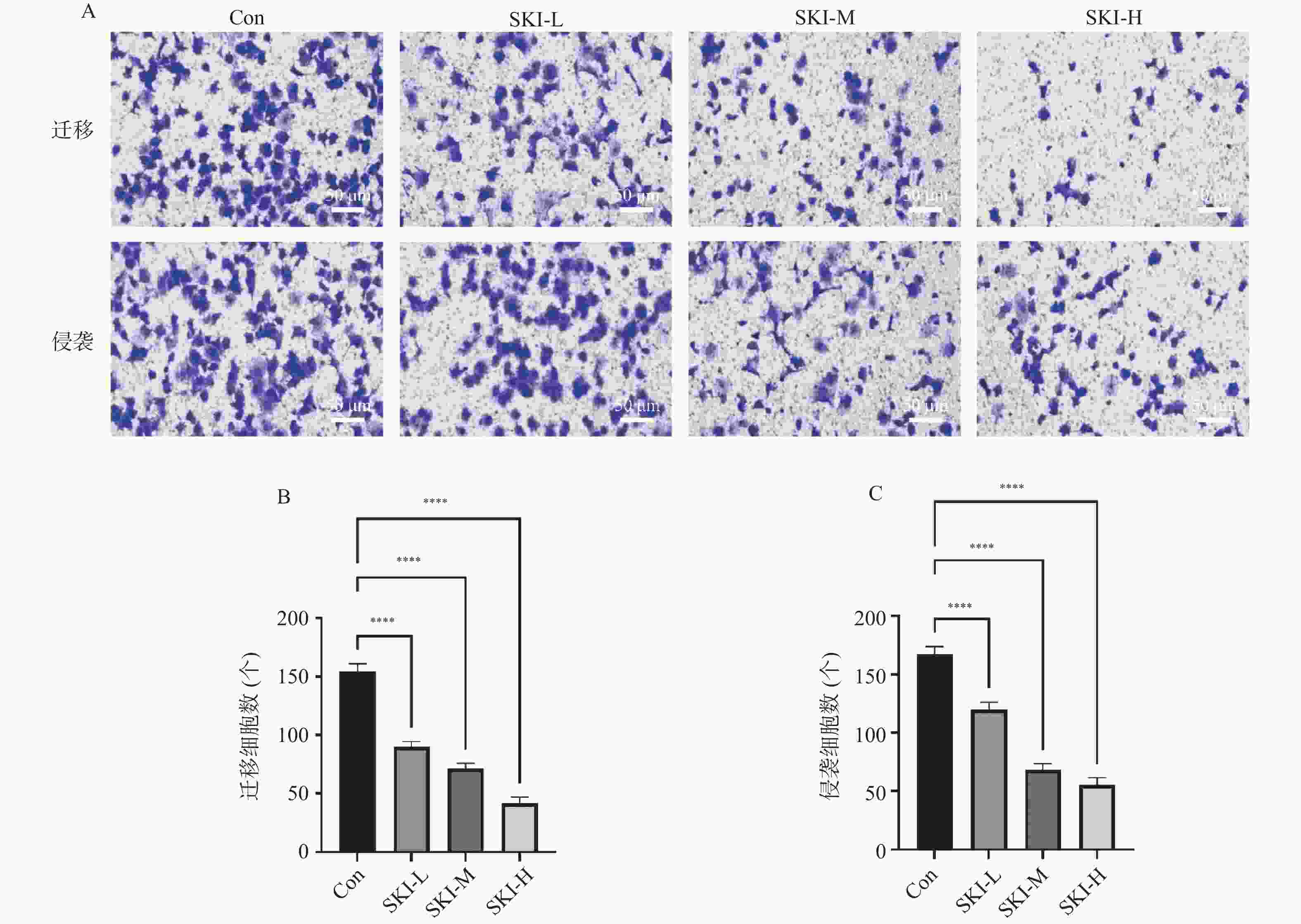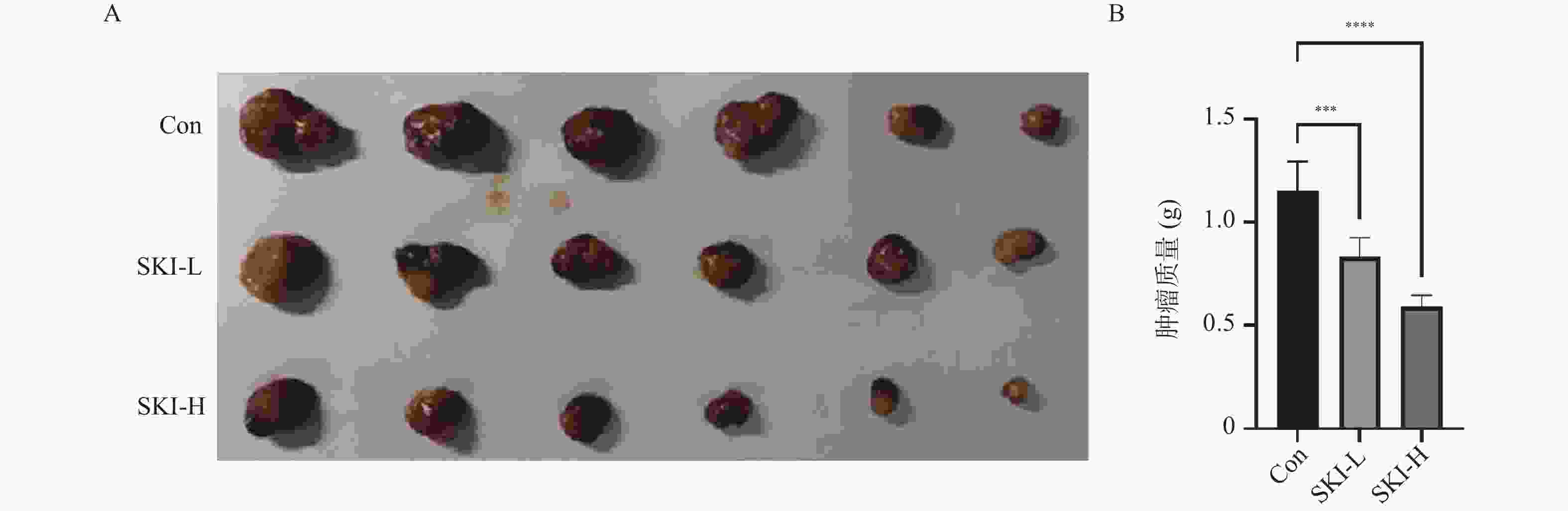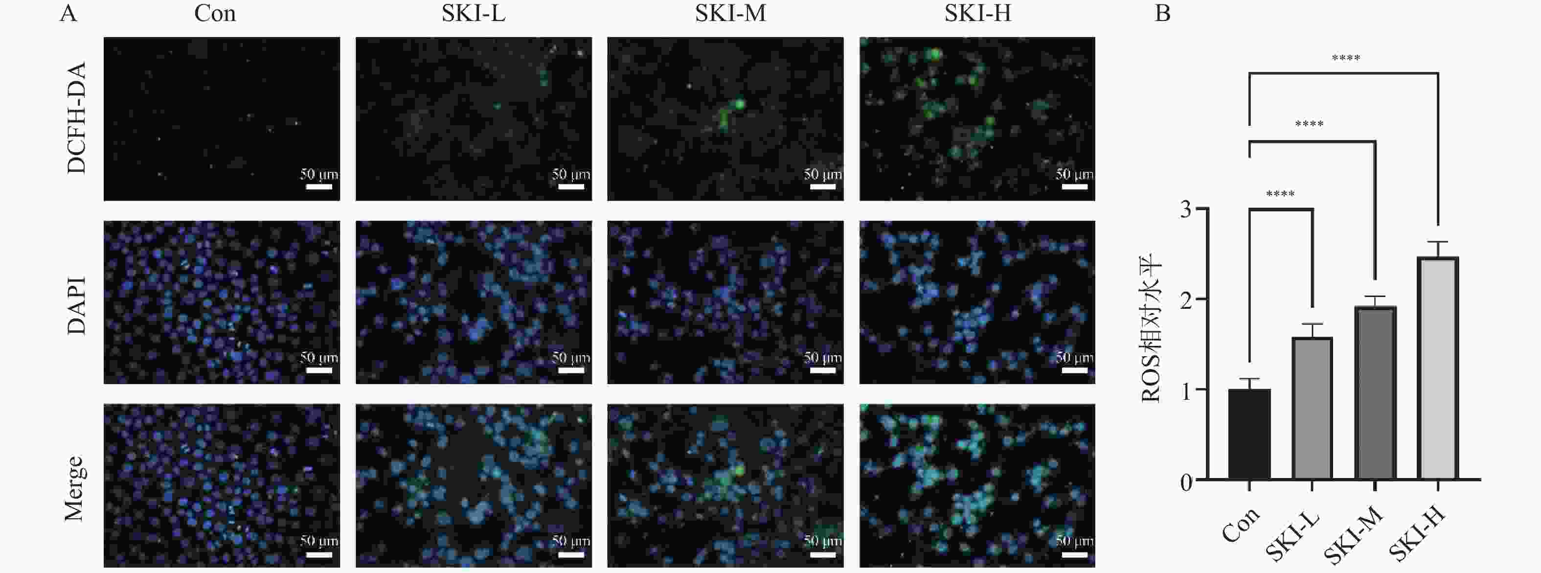 目的 探讨紫草素(shikonin,SKI)能否通过ROS/JNK通路诱导铁死亡从而抑制胰腺癌恶性行为。 方法 选用人胰腺癌PANC-1细胞或BxPC-3细胞,药效实验设置空白组(Con组)、SKI低、中、高剂量组(2,4,8 μmol/L),JNK相关机制实验分为空白组(Con组)、SKI组(SKI组)、SKI+JNK抑制剂组(SKI+SP600125组),ROS相关机制实验分为空白组(Con组)、SKI组(SKI组)、SKI+ROS清除剂组(SKI+NAC组)。采用CCK-8法检测细胞活力并计算半数抑制浓度(IC50);Transwell实验评估细胞迁移与侵袭能力;使用C11 BODIPY 581/591探针通过流式细胞术检测脂质过氧化水平,FerroOrange荧光探针测定亚铁离子水平;活性氧检测试剂盒检测ROS水平;Western blot法检测铁死亡关键蛋白(SLC7A11、GPX4)、凋亡相关蛋白(Caspase3、PARP)及JNK通路蛋白(JNK、p-JNK)的表达;采用体内异种移植瘤模型检测体内肿瘤增殖情况。 结果 SKI处理可浓度依赖性和时间依赖性地显著抑制PANC-1细胞(IC50为6.04 μmol/L,P < 0.0001 )和BxPC-3细胞(IC50为12.27 μmol/L,P <0.0001 )活力,并明显减少迁移和侵袭的细胞数(P <0.0001 ),8 μmol/L SKI处理组迁移细胞数降至对照组的约30%(P <0.0001 )。机制上,SKI诱导细胞内脂质过氧化水平升高、Fe2+积累以及ROS大量生成(P <0.0001 ),同时显著下调SLC7A11和GPX4的蛋白表达(GPX4蛋白表达降至对照组的40%,P <0.0001 ),并激活JNK磷酸化(p-JNK/JNK比值增至2.8倍,P <0.0001 )。而使用JNK特异性抑制剂SP600125或ROS清除剂NAC预处理,均能有效逆转SKI对细胞活力的抑制或对SLC7A11/GPX4蛋白的下调作用(均P < 0.01)。SKI也能在体内抑制胰腺癌肿瘤细胞的增殖(P <0.0001 )。结论 SKI通过激活ROS/JNK通路诱导铁死亡,进而抑制胰腺癌增殖、迁移与侵袭。 Abstract:Objective To investigate if Shikonin (SKI) can induce ferroptosis via the ROS/JNK pathway to inhibit the malignant behavior of pancreatic cancer. Methods Human pancreatic cancer PANC-1 or BxPC-3 cells were selected. Drug efficacy experiments were established with a blank control group (Con group) and low, medium, and high dose SKI groups (2, 4, 8 μmol/L). JNK-related mechanism experiments were categorized into a blank control group (Con group), SKI group, and SKI+JNK inhibitor group (SKI+SP600125 group). ROS-related mechanism experiments were divided into a blank control group (Con group), SKI group, and SKI+ROS scavenger group (SKI+NAC group). Cell viability was assessed using the CCK-8 method to calculate IC50; Transwell experiments evaluated cell migration and invasion capabilities; the C11 BODIPY 581/591 probe was utilized for flow cytometry to detect lipid peroxidation levels, while the FerroOrange fluorescent probe measured ferrous ion levels; ROS levels were determined using a ROS detection kit; the Western blot method identified ferroptosis-related key proteins (SLC7A11, GPX4), apoptosis-related proteins (Caspase3, PARP), and JNK pathway proteins (JNK, p-JNK); an in vivo xenograft tumor model was employed to assess tumor proliferation. Results SKI treatment significantly and dose-dependently inhibited PANC-1 cell viability (IC50: 6.04 μmol/L, P < 0.0001 ) and BxPC-3 cell viability (IC50: 12.27 μmol/L, P <0.0001 ), and significantly reduced migrating and invasive cell numbers (P <0.0001 ), with migration cell numbers dropping to about 30% of the control group at 8 μmol/L SKI treatment (P <0.0001 ). Mechanistically, SKI induced increased intracellular lipid peroxidation, Fe2+ accumulation, and significant ROS production (P <0.0001 ), significantly downregulated SLC7A11 and GPX4 protein expression (GPX4 protein expression reduced to 40% of that in the control group, P <0.0001 ), and activated JNK phosphorylation (p-JNK/JNK ratio increased to 2.8-fold, P <0.0001 ). Pretreatment with the JNK-specific inhibitor SP600125 or ROS scavenger NAC effectively reversed SKI's inhibition of cell viability and downregulation of SLC7A11/GPX4 protein (all P < 0.01). SKI also inhibited pancreatic cancer tumor cell proliferation in vivo (P <0.0001 ).Conclusion SKI induces ferroptosis by activating the ROS/JNK pathway, thereby inhibiting pancreatic cancer proliferation, migration, and invasion. -