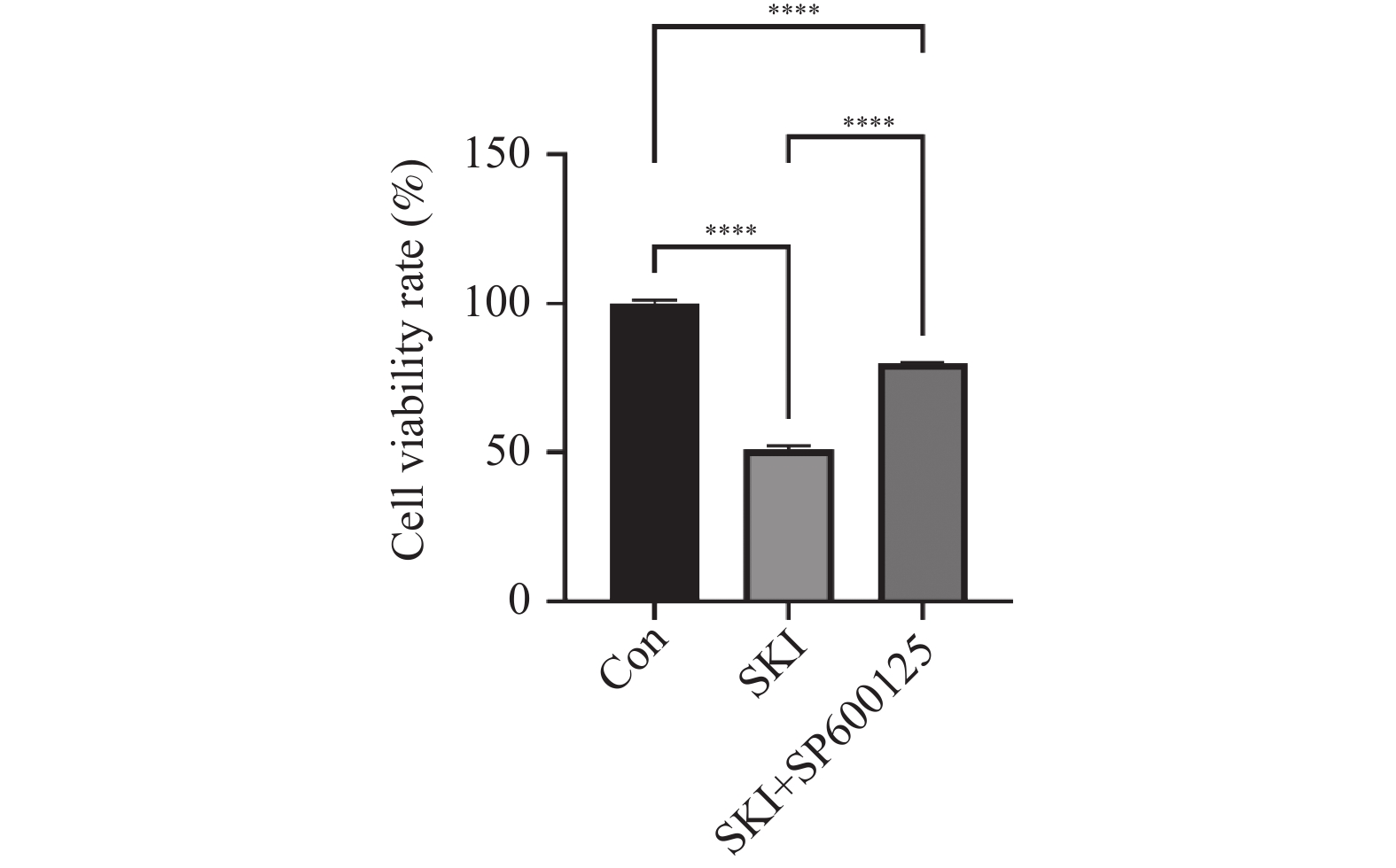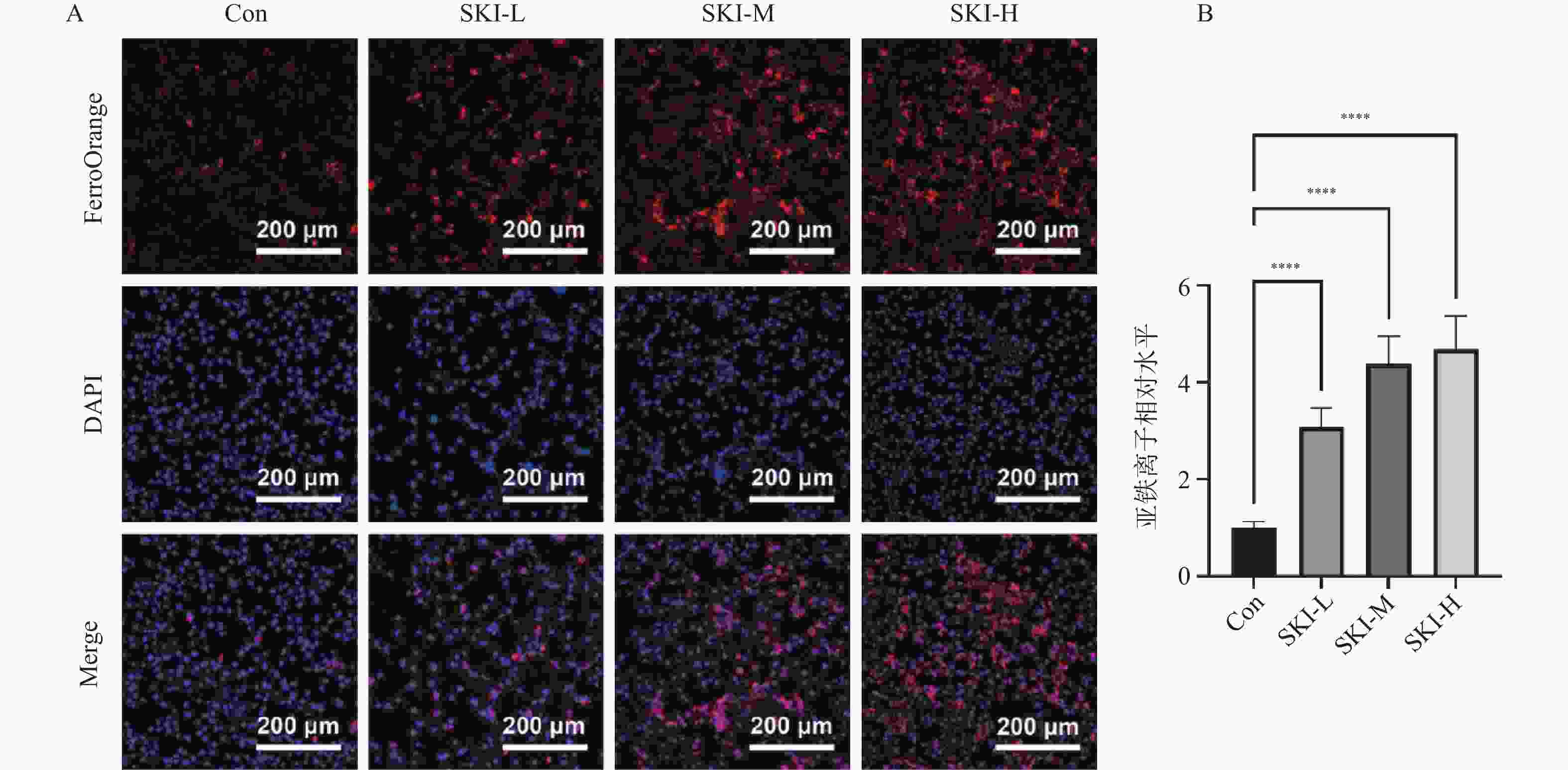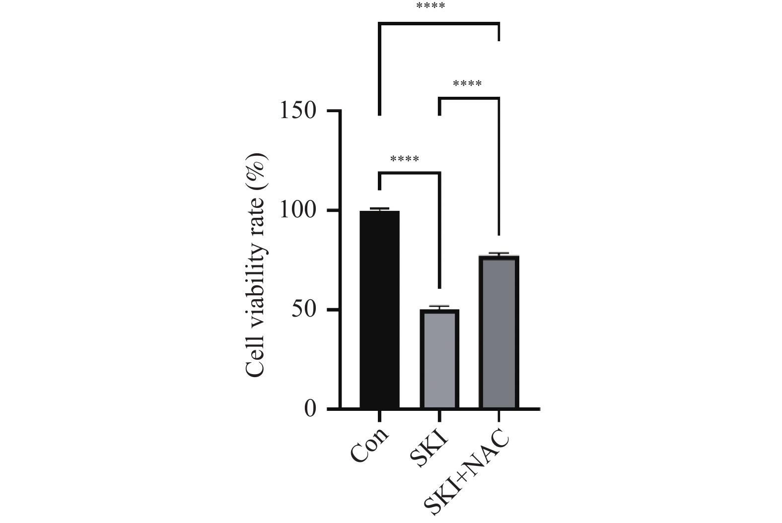 目的 探讨紫草素(shikonin,SKI)能否通过ROS/JNK通路诱导铁死亡从而抑制胰腺癌恶性行为。 方法 选用人胰腺癌PANC-1细胞或BxPC-3细胞,药效实验设置空白组(Con组)、SKI低、中、高剂量组(2,4,8 μmol/L),JNK相关机制实验分为空白组(Con组)、SKI组(SKI组)、SKI+JNK抑制剂组(SKI+SP600125组),ROS相关机制实验分为空白组(Con组)、SKI组(SKI组)、SKI+ROS清除剂组(SKI+NAC组)。采用CCK-8法检测细胞活力并计算半数抑制浓度(IC50);Transwell实验评估细胞迁移与侵袭能力;使用C11 BODIPY 581/591探针通过流式细胞术检测脂质过氧化水平,FerroOrange荧光探针测定亚铁离子水平;活性氧检测试剂盒检测ROS水平;Western blot法检测铁死亡关键蛋白(SLC7A11、GPX4)、凋亡相关蛋白(Caspase3、PARP)及JNK通路蛋白(JNK、p-JNK)的表达;采用体内异种移植瘤模型检测体内肿瘤增殖情况。 结果 SKI处理可浓度依赖性和时间依赖性地显著抑制PANC-1细胞(IC50为6.04 μmol/L,P < 0.0001 )和BxPC-3细胞(IC50为12.27 μmol/L,P <0.0001 )活力,并明显减少迁移和侵袭的细胞数(P <0.0001 ),8 μmol/L SKI处理组迁移细胞数降至对照组的约30%(P <0.0001 )。机制上,SKI诱导细胞内脂质过氧化水平升高、Fe2+积累以及ROS大量生成(P <0.0001 ),同时显著下调SLC7A11和GPX4的蛋白表达(GPX4蛋白表达降至对照组的40%,P <0.0001 ),并激活JNK磷酸化(p-JNK/JNK比值增至2.8倍,P <0.0001 )。而使用JNK特异性抑制剂SP600125或ROS清除剂NAC预处理,均能有效逆转SKI对细胞活力的抑制或对SLC7A11/GPX4蛋白的下调作用(均P < 0.01)。SKI也能在体内抑制胰腺癌肿瘤细胞的增殖(P <0.0001 )。结论 SKI通过激活ROS/JNK通路诱导铁死亡,进而抑制胰腺癌增殖、迁移与侵袭。 Abstract:Objective To investigate if Shikonin (SKI) can induce ferroptosis via the ROS/JNK pathway to inhibit the malignant behavior of pancreatic cancer. Methods Human pancreatic cancer PANC-1 or BxPC-3 cells were selected. Drug efficacy experiments were established with a blank control group (Con group) and low, medium, and high dose SKI groups (2, 4, 8 μmol/L). JNK-related mechanism experiments were categorized into a blank control group (Con group), SKI group, and SKI+JNK inhibitor group (SKI+SP600125 group). ROS-related mechanism experiments were divided into a blank control group (Con group), SKI group, and SKI+ROS scavenger group (SKI+NAC group). Cell viability was assessed using the CCK-8 method to calculate IC50; Transwell experiments evaluated cell migration and invasion capabilities; the C11 BODIPY 581/591 probe was utilized for flow cytometry to detect lipid peroxidation levels, while the FerroOrange fluorescent probe measured ferrous ion levels; ROS levels were determined using a ROS detection kit; the Western blot method identified ferroptosis-related key proteins (SLC7A11, GPX4), apoptosis-related proteins (Caspase3, PARP), and JNK pathway proteins (JNK, p-JNK); an in vivo xenograft tumor model was employed to assess tumor proliferation. Results SKI treatment significantly and dose-dependently inhibited PANC-1 cell viability (IC50: 6.04 μmol/L, P < 0.0001 ) and BxPC-3 cell viability (IC50: 12.27 μmol/L, P <0.0001 ), and significantly reduced migrating and invasive cell numbers (P <0.0001 ), with migration cell numbers dropping to about 30% of the control group at 8 μmol/L SKI treatment (P <0.0001 ). Mechanistically, SKI induced increased intracellular lipid peroxidation, Fe2+ accumulation, and significant ROS production (P <0.0001 ), significantly downregulated SLC7A11 and GPX4 protein expression (GPX4 protein expression reduced to 40% of that in the control group, P <0.0001 ), and activated JNK phosphorylation (p-JNK/JNK ratio increased to 2.8-fold, P <0.0001 ). Pretreatment with the JNK-specific inhibitor SP600125 or ROS scavenger NAC effectively reversed SKI's inhibition of cell viability and downregulation of SLC7A11/GPX4 protein (all P < 0.01). SKI also inhibited pancreatic cancer tumor cell proliferation in vivo (P <0.0001 ).Conclusion SKI induces ferroptosis by activating the ROS/JNK pathway, thereby inhibiting pancreatic cancer proliferation, migration, and invasion. -