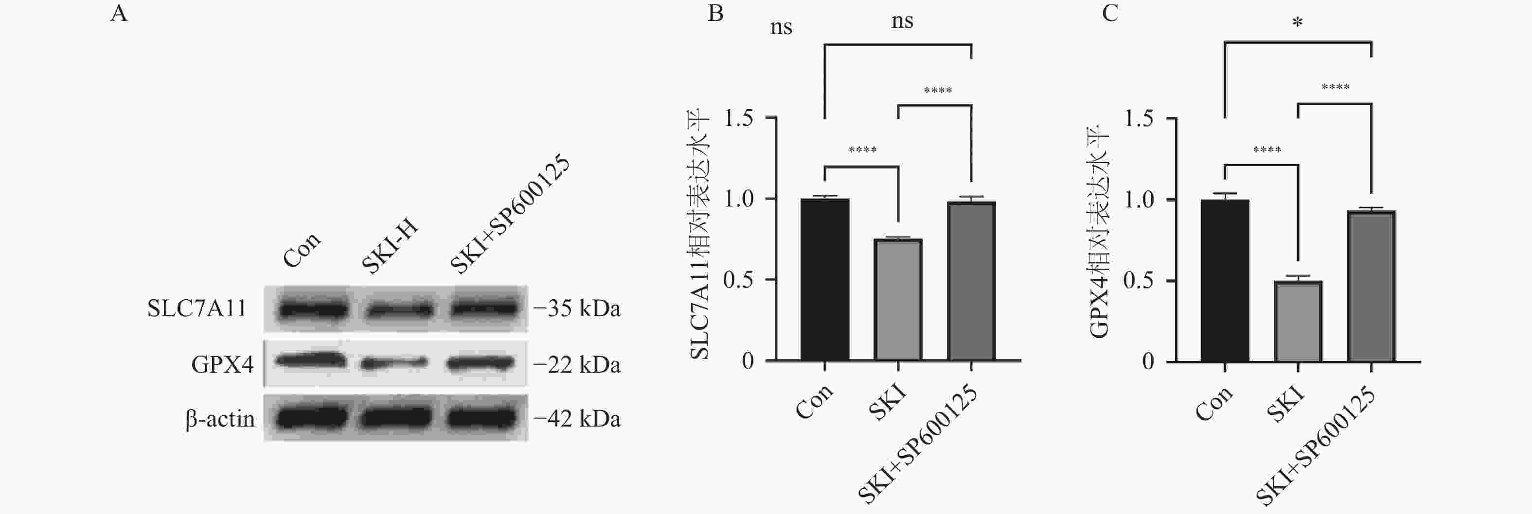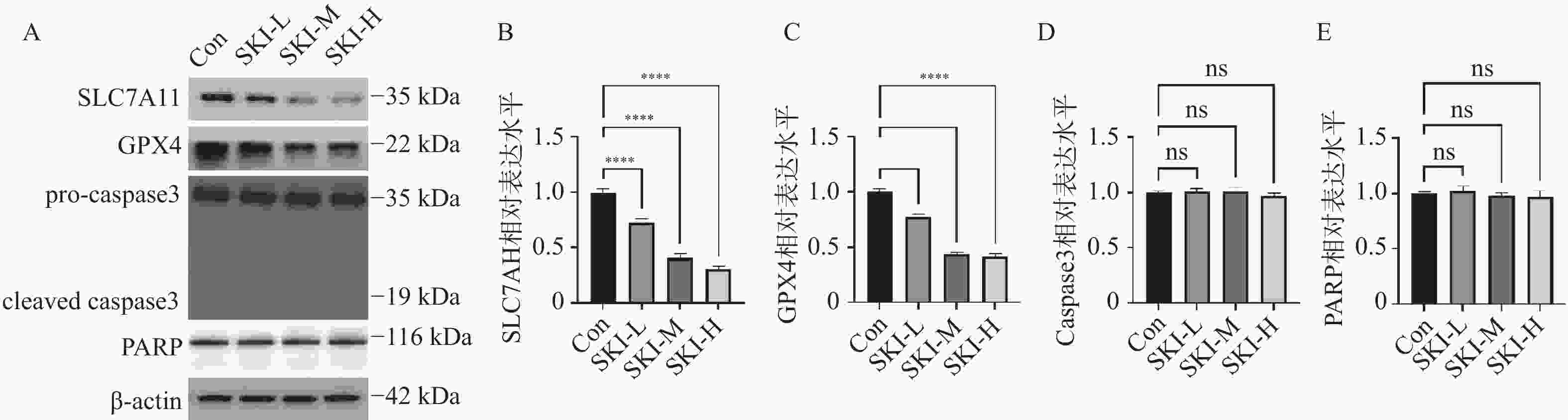 A:SKI给药干预PANC-1细胞后Western blot结果图;B:SKI给药干预PANC-1细胞后SLC7A11相对表达水平;C:SKI给药干预PANC-1细胞后GPX4相对表达水平;D:SKI给药干预PANC-1细胞后Caspase3相对表达水平;E:SKI给药干预PANC-1细胞后PARP相对表达水平;****P < 0.0001;ns:P > 0.05。