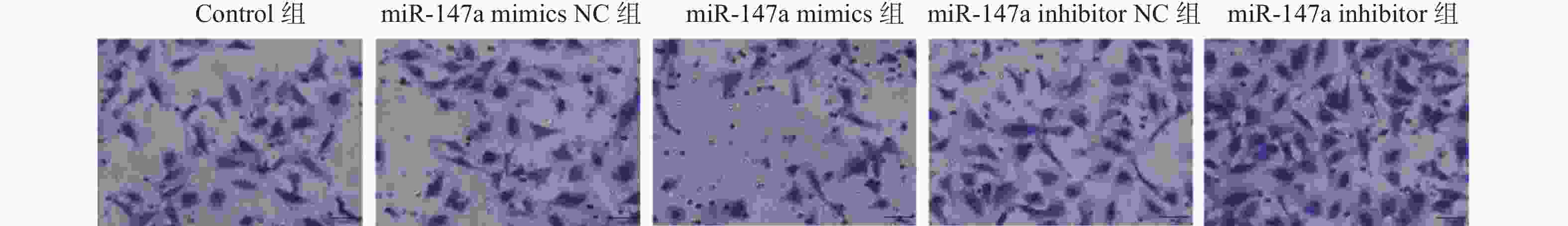 组别 细胞迁移距离(%) 细胞侵袭数 Control组 42.12±3.19 52.33±4.04 miR-147a mimics NC组 41.94±4.42 51.33±3.21 miR-147a mimics组 29.13±1.41### 32.67±3.05### miR-147a inhibitor NC组 43.46±7.35 52.00±5.57 miR-147a inhibitor组 55.32±1.27### 72.67±4.73### F 14.769 33.634 P <0.001*** <0.001*** ***P < 0.05;与Control组比较,###P < 0.001。 -