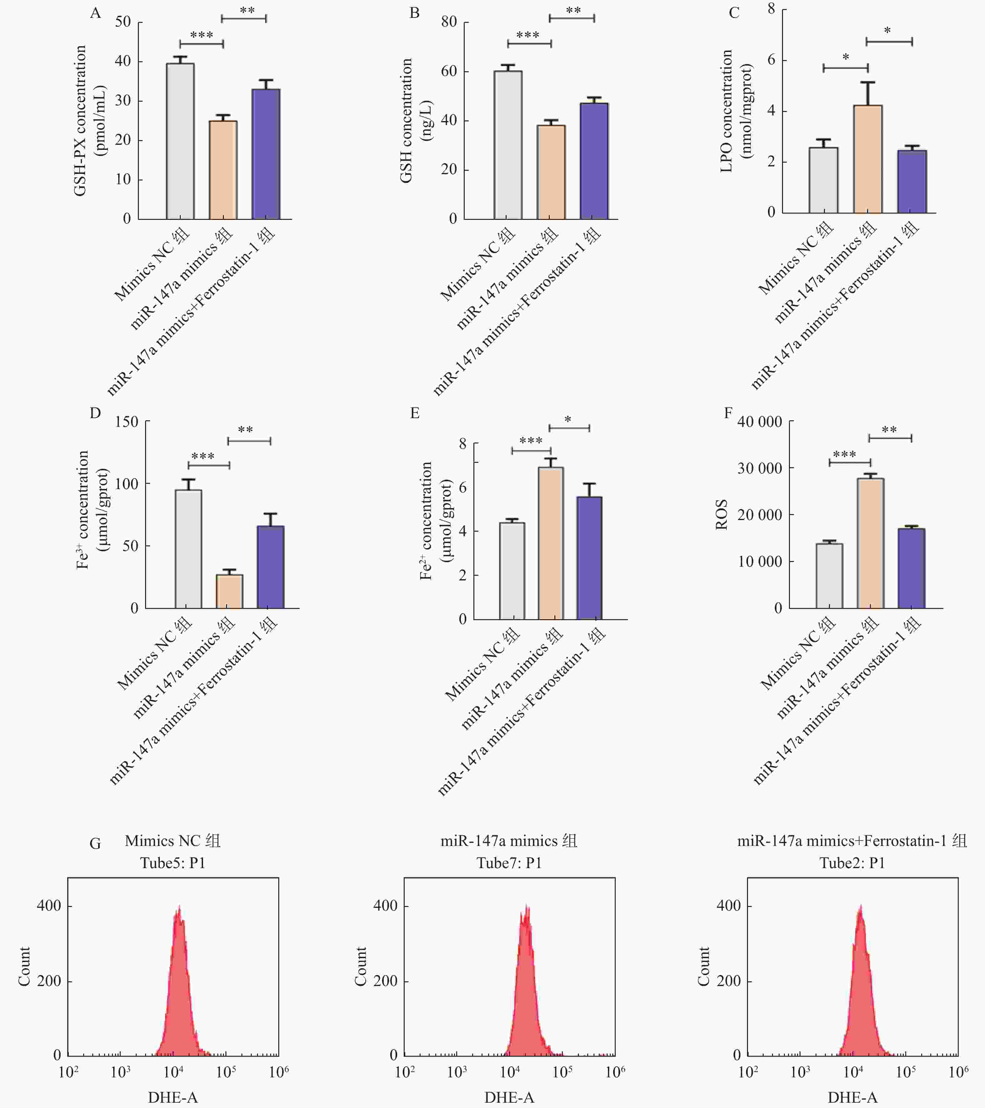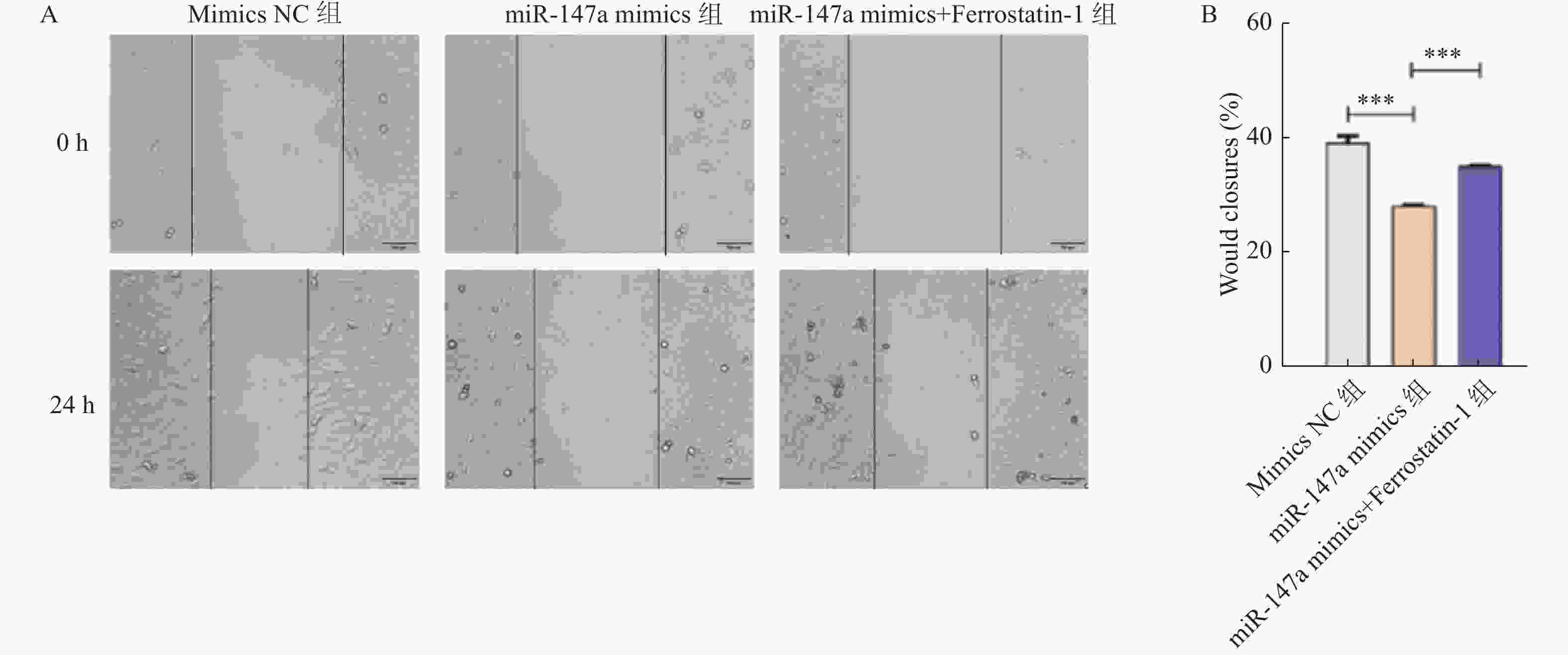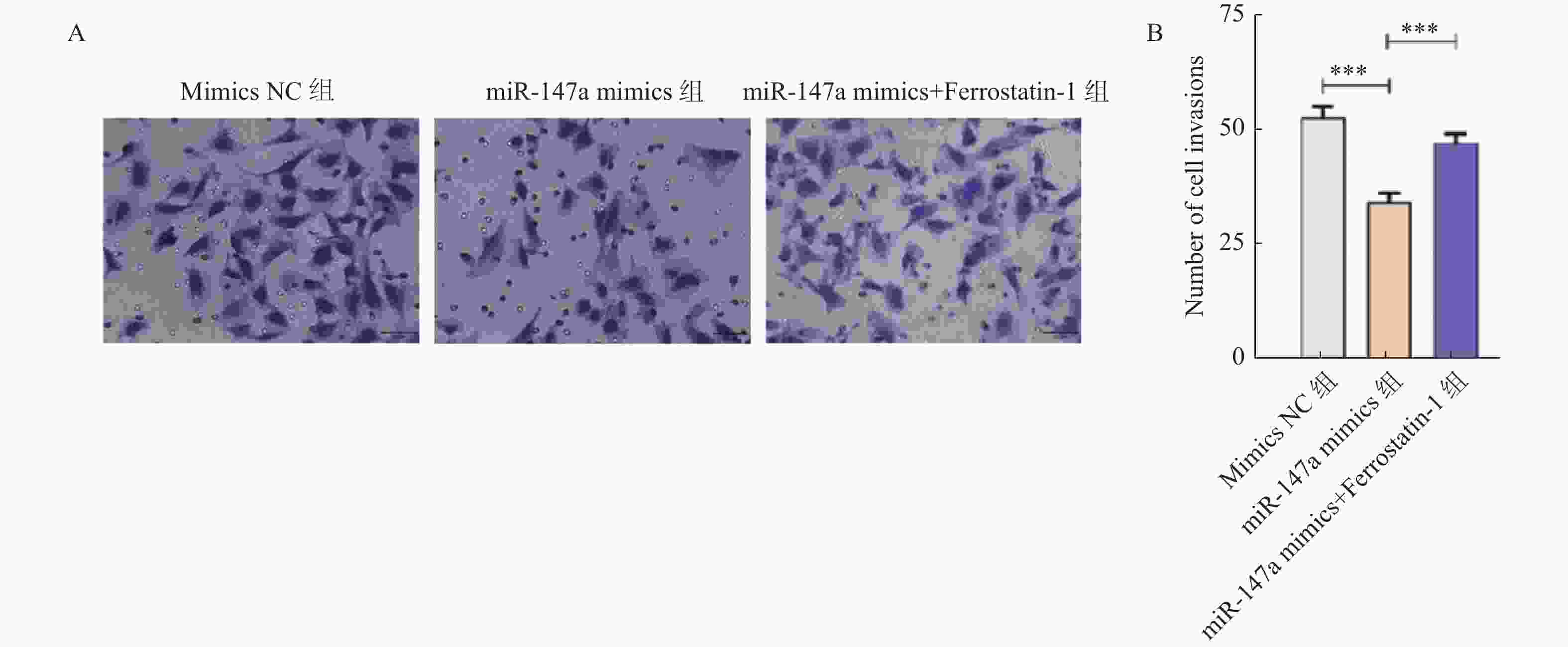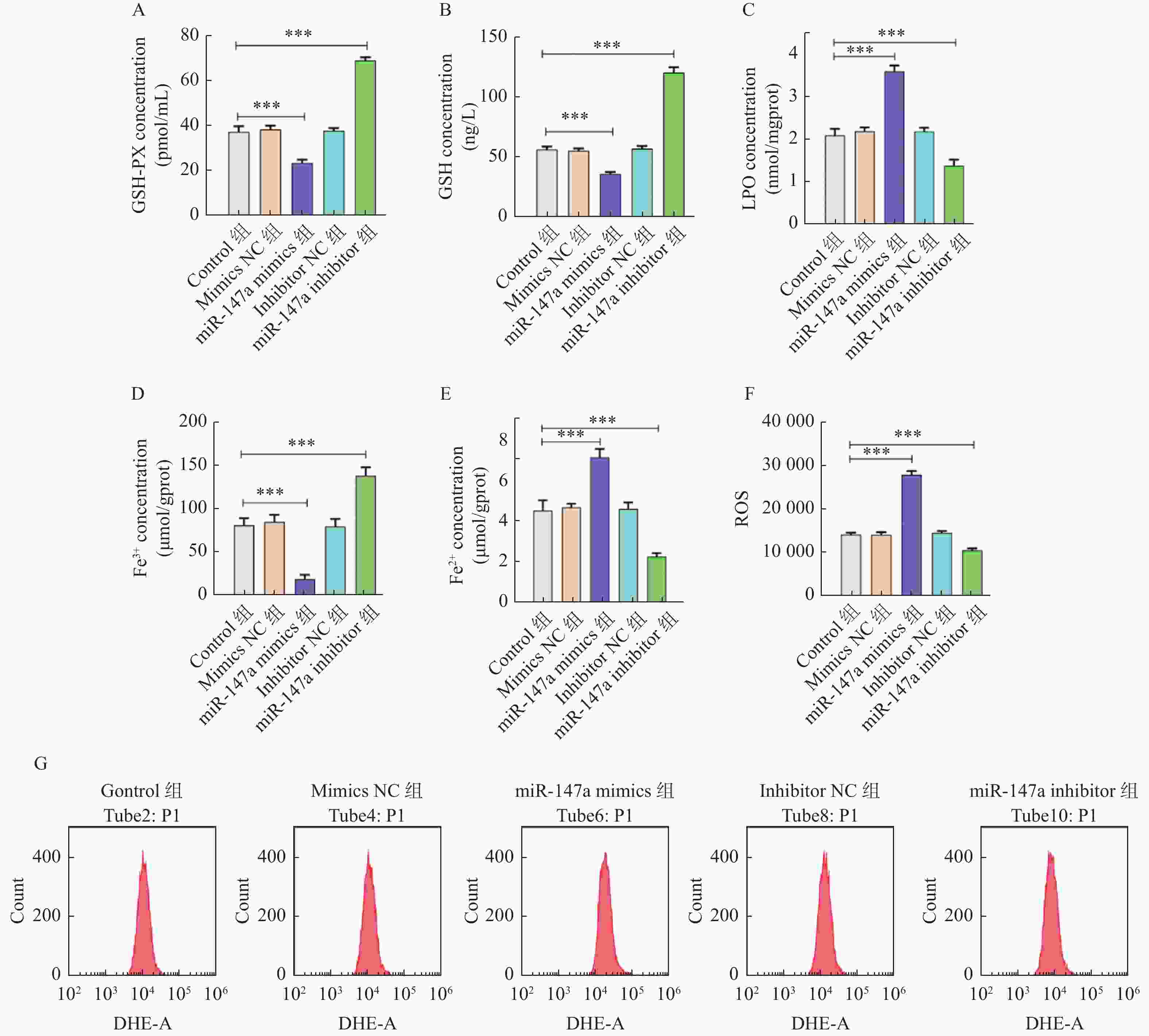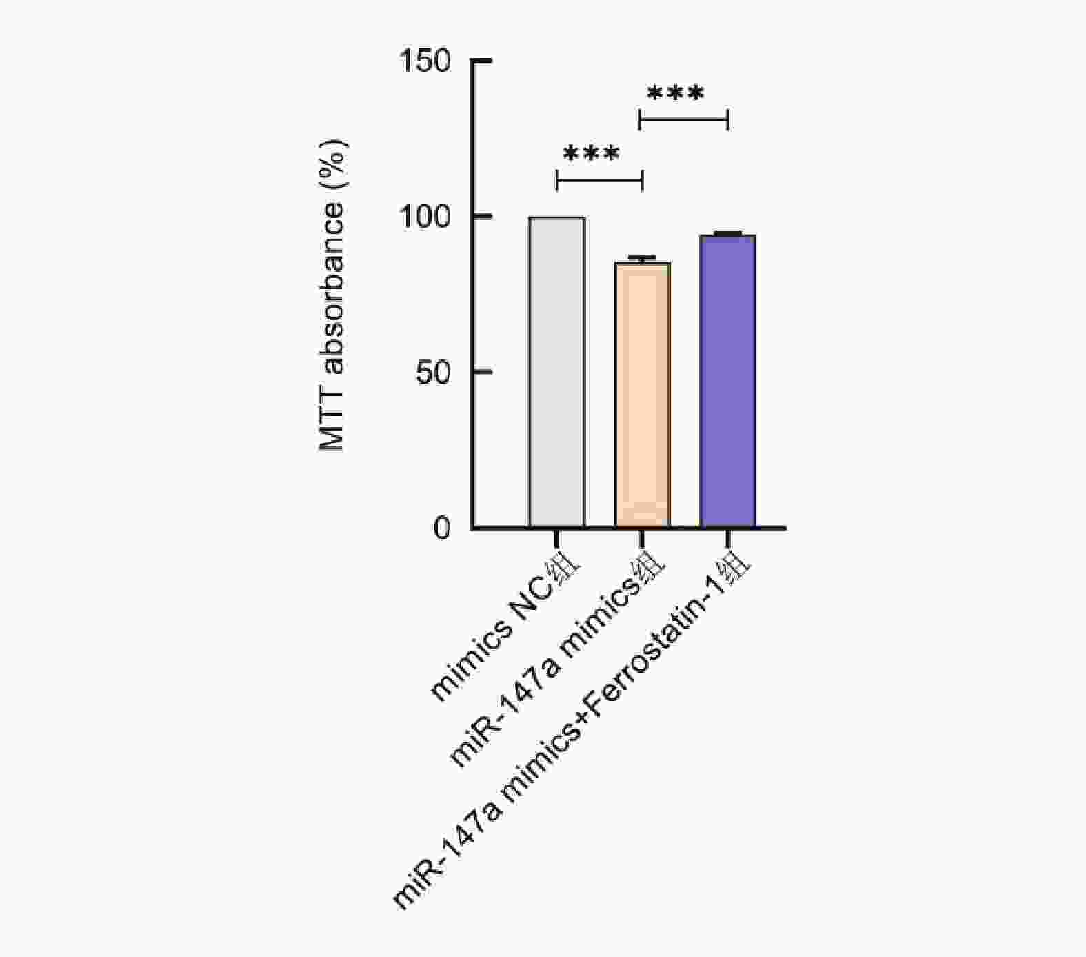 目的 探讨miR-147a通过影响铁死亡过程对宫颈癌Hela细胞增殖和转移的调控作用。 方法 将Hela细胞孵育及传代,制备Hela单细胞悬液进行转染,转染后分为Control组、miR-147a mimics NC组、miR-147a mimics组、miR-147a inhibitor NC组、miR-147a inhibitor组、miR-147a mimics+ Ferrostatin-1 (1 μM)组。采用MTT检测细胞增殖率、Transwell检测细胞侵袭能力,划痕实验检测细胞的愈合能力,流式细胞术检测活性氧(reactive oxygen species,ROS)的表达情况,试剂盒检测亚铁离子(Fe2+)、铁离子(Fe3+)、乳过氧化物酶(Lactoperoxidase,LPO)、谷胱甘肽过氧化物酶(glutathione peroxidase,GSH-PX)、谷胱甘肽(glutathione,GSH)的表达变化。 结果 miR-147a mimics组的细胞增殖率、细胞侵袭数量和细胞迁移距离较Control组降低(P < 0.05);miR-147a inhibitor组的细胞增殖率、细胞侵袭数量和细胞迁移距离较Control组升高(P < 0.05)。较Control组,miR-147a mimics组的Fe2+、LPO、ROS的表达升高,Fe3+、GSH-PX和GSH的表达降低(P < 0.05)。miR-147a inhibitor组的Fe2+、LPO、ROS的表达降低,Fe3+、GSH-PX和GSH的表达升高(P < 0.05)。miR-147a mimics+Ferrostatin-1组的细胞增殖率、细胞侵袭数量和细胞迁移距离较miR-147a mimics组升高(P < 0.05)。与miR-147a mimics组比较,miR-147a mimics+Ferrostatin-1组的Fe2+、LPO、ROS的表达水平降低,(P < 0.05);Fe3+、GSH-PX和GSH的表达水平升高(P < 0.05)。 结论 miR-147a可以促进铁死亡,抑制宫颈癌细胞的增殖和转移。 Abstract:Objective To investigate the regulatory role of miR-147a in affecting cell proliferation and metastasis of cervical cancer Hela cells through ferroptosis. Methods Hela cells were cultured and passaged, and then a Hela single-cell suspension was prepared and transfected. After transfection, the cells were divided into control group, miR-147a mimics NC group, miR-147a mimics group, miR-147a inhibitor NC group, miR-147a inhibitor group, and miR-147a mimics+Ferrostatin-1 (1 μM) group. MTT assay was used to detect cell proliferation, Transwell assay to assess cell invasion capacity, scratch test to evaluate cell healing ability, flow cytometry to detect reactive oxygen species (ROS) expression, and assay kits to measure expression changes of ferrous ions (Fe2+), ferric ions (Fe3+), lactoperoxidase (LPO), glutathione peroxidase (GSH-PX), and glutathione (GSH). Results Compared to the control group, the miR-147a mimics group showed reduced cell proliferation rate, cell invasion quantity, and cell migration distance (P < 0.05); the miR-147a inhibitor group exhibited increased cell proliferation rate, cell invasion quantity, and cell migration distance (P < 0.05). Compared to the control group, the miR-147a mimics group showed increased Fe2+, LPO, and ROS expression, with decreased Fe3+, GSH-PX, and GSH expression (P < 0.05). The miR-147a inhibitor group showed decreased Fe2+ , LPO, and ROS expression, with increased Fe3+, GSH-PX, and GSH expression(P < 0.05). The miR-147a mimics + Ferrostatin-1 group exhibited increased cell proliferation rate, cell invasion quantity, and cell migration distance compared to the miR-147a mimics group (P < 0.05). Compared to the miR-147a mimics group, the miR-147a mimics + Ferrostatin-1 group showed decreased Fe2+, LPO, and ROS expression levels (P < 0.05), with increased Fe3+, GSH-PX, and GSH expression levels (P < 0.05). Conclusion miR-147a can promote ferroptosis and inhibit the proliferation and metastasis of cervical cancer cells. -