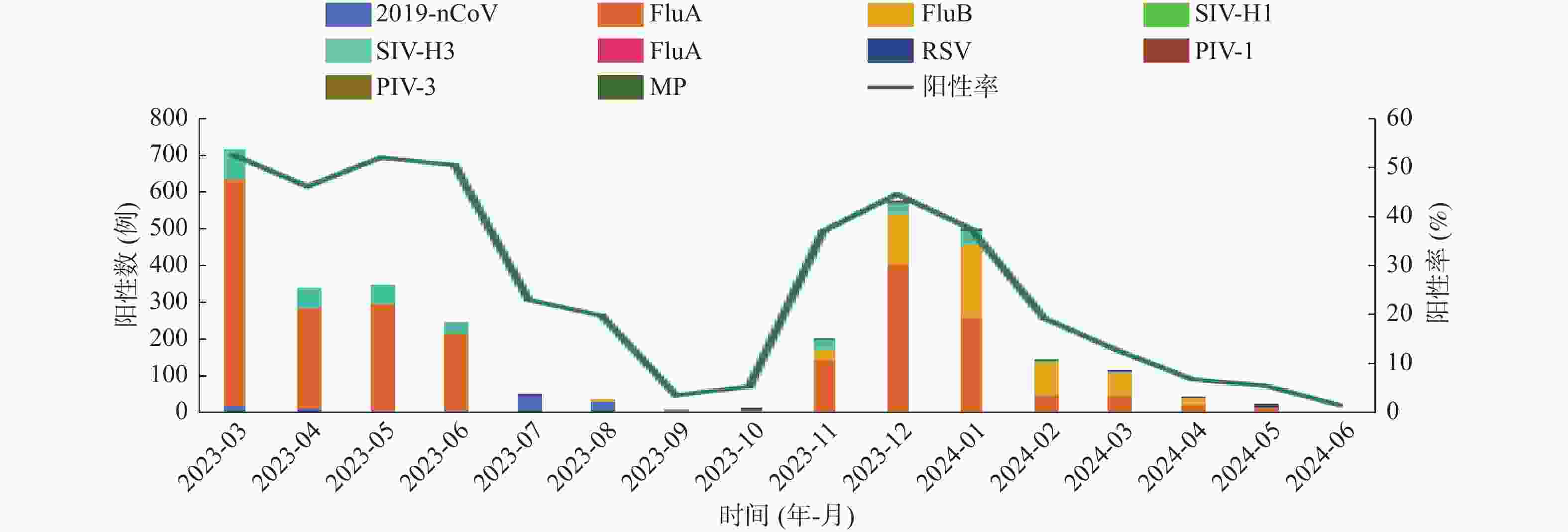 病原体 检出例数(n) 检出率(%) 2019-nCoV 131 1.27 FluA 2324 22.45 FluB 548 5.29 SIV-H1 17 0.16 SIV-H3 266 2.57 Adv 13 0.13 RSV 13 0.13 PIV-1 5 0.05 PIV-3 28 0.27 MP 23 0.22 合计 3368 32.53 表 2 病原体混合感染检出情况