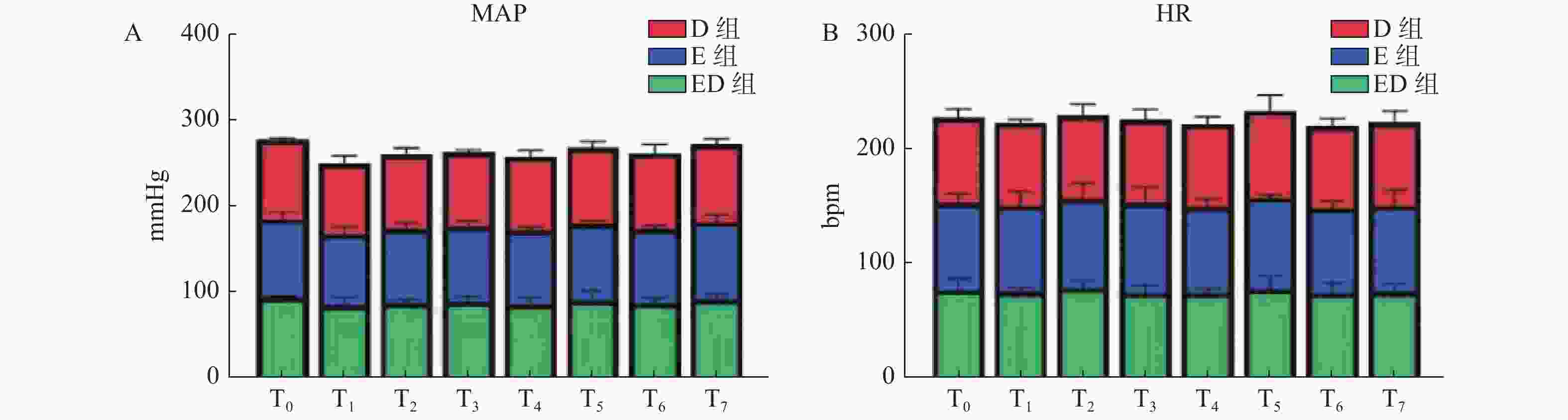 时间点 Pi 重复测量F检验 D组(n=40) E组(n=42) ED组(n=40) F P 偏η2 T5 6.68 ± 1.73 6.57 ± 1.88 6.05 ± 1.28 T6 7.77 ± 2.82 7.57 ± 2.58 7.28 ± 3.48 T7 8.60 ± 3.05 8.48 ± 3.98 7.62 ± 2.95 组别主效应 2.243 0.111 0.036 时间主效应 14.177 <0.001* 0.194 组别×时间 0.102 0.982 0.002 *P < 0.05。 表 4 三组研究对象VAS的比较($ \bar x \pm s $,分)