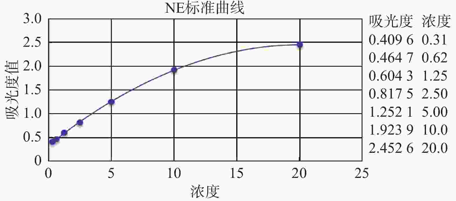 比较组别 检验统计 标准误差 标准检验统计 Sig Adj. Sig a 秩和检验 Sample 1-Sample 2 H P 实验组1-对照组 −81.969 9.692 −8.457 <0.001* <0.001* 71.353 <0.001* 实验组2-对照组 −69.048 9.692 −7.124 <0.001* <0.001* 实验组1-实验组2 12.921 9.490 1.362 0.173 0.520 a: 已针对多项检验通过 Bonferroni 校正法调整显著性值;*P < 0.05。 表 3 实验组和对照组NE水平