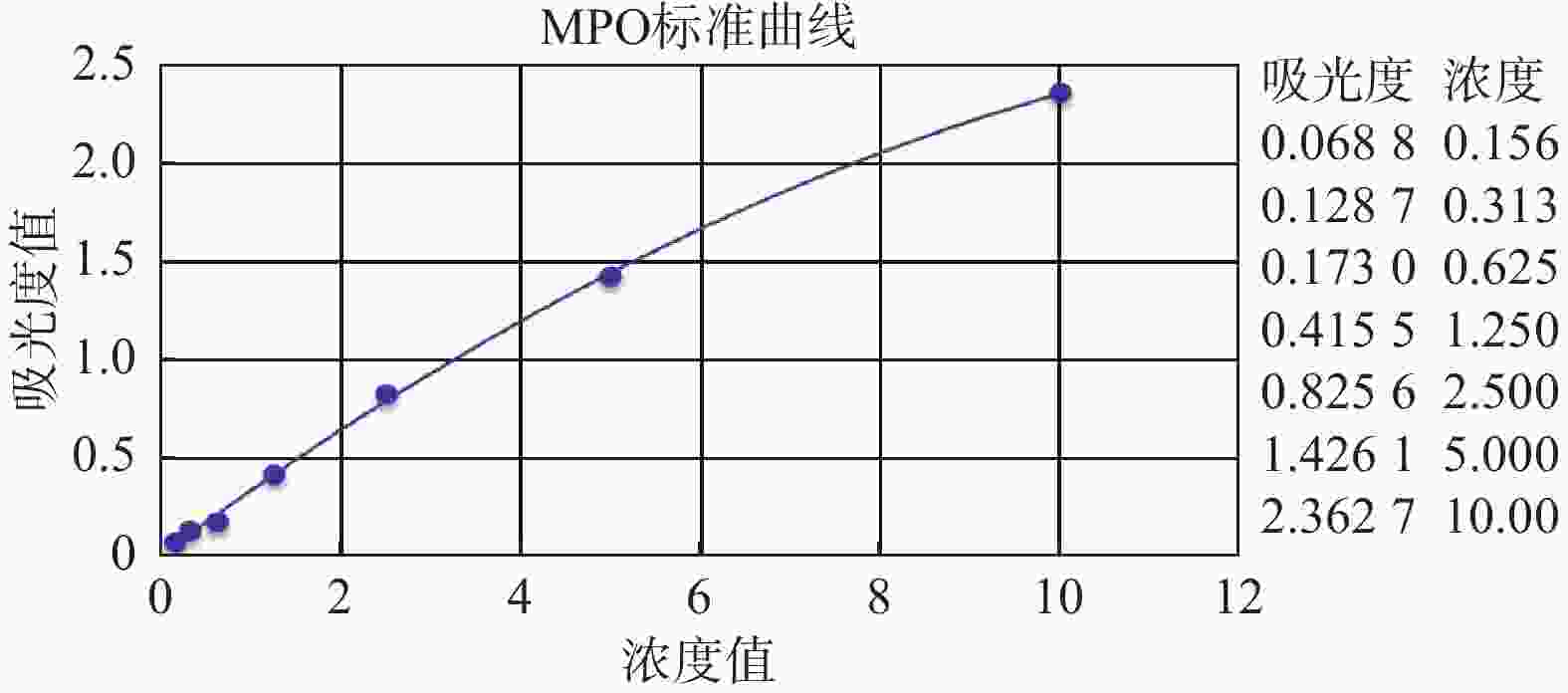 比较组别 检验统计 标准误差 标准检验统计 Sig Adj. Sig a 秩和检验 Sample 1-Sample 2 H P 实验组1-对照组 −79.309 9.692 −8.183 <0.001* <0.001* 79.162 <0.001* 实验组2-对照组 −70.198 9.692 −7.243 <0.001* <0.001* 实验组1-实验组2 9.111 9.490 0.960 0.337 0.996 a: 已针对多项检验通过 Bonferroni 校正法调整显著性值;*P < 0.05。 表 4 实验组和对照组MPO水平