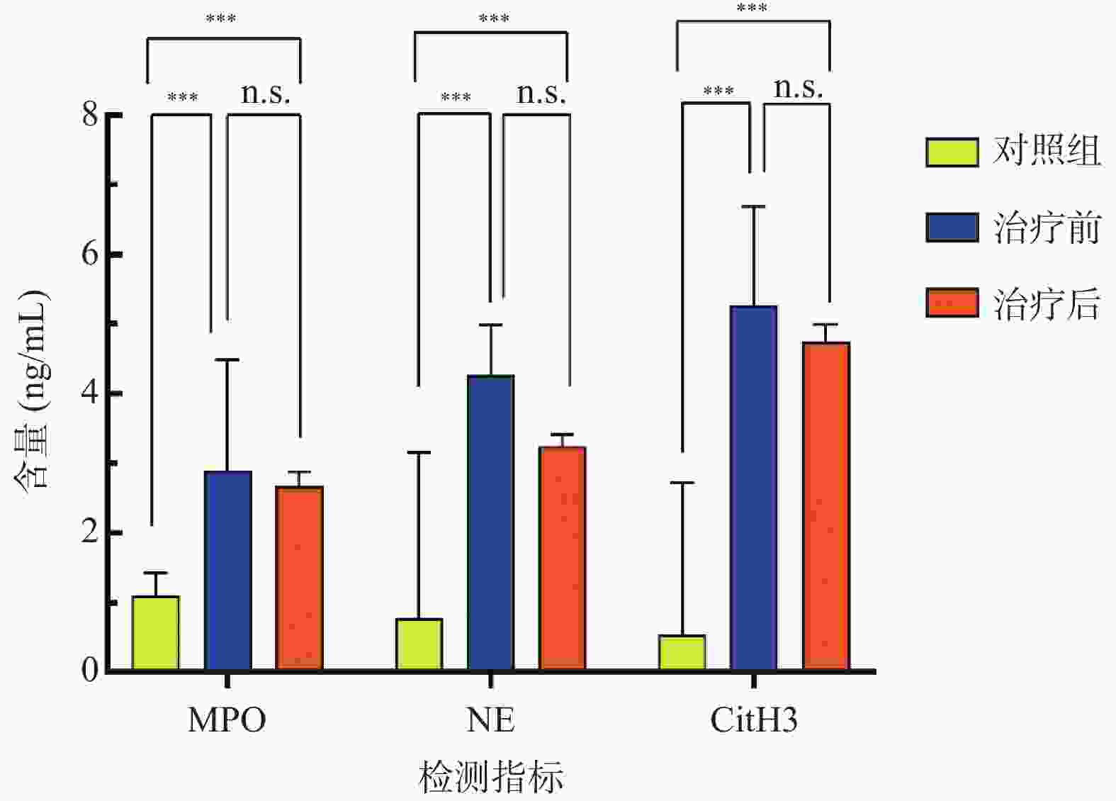 比较组别 检验统计 标准误差 标准检验统计 Sig Adj. Sig a 秩和检验 Sample 1-Sample 2 H P 实验组1-对照组 −78.597 9.692 −8.109 <0.001 <0.001 81.684 <0.001* 实验组2-对照组 −60.486 9.692 −6.241 <0.001 <0.001 实验组1-实验组2 18.111 9.490 1.909 0.056 0.169 a: 已针对多项检验通过 Bonferroni 校正法调整显著性值;*P < 0.05。 表 5 未经治疗前血清NETs与常规实验室指标的相关性分析