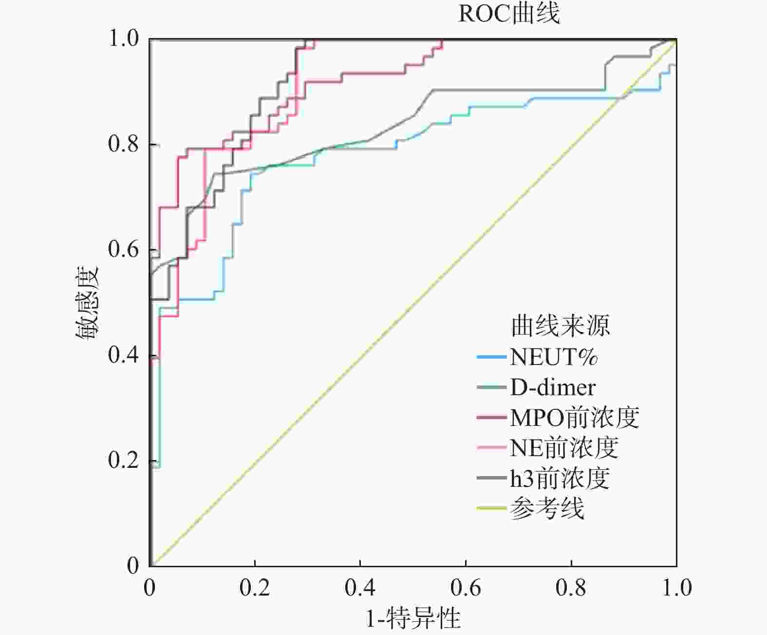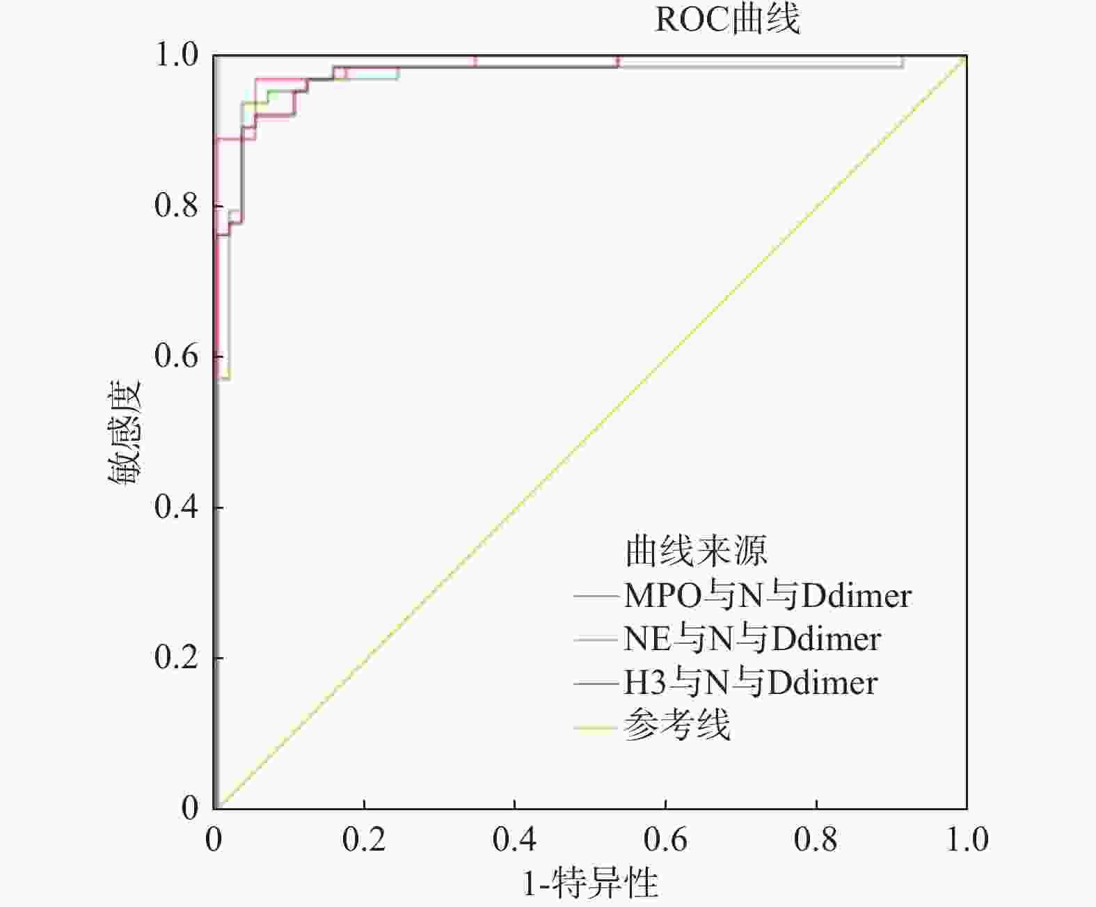 项目 AUC 灵敏度 特异度 约登指数 95%CI P NEUT、D-dimer与MPO三者联合 0.988 0.968 0.948 0.916 (0.974,1.000) <0.001* NEUT、D-dimer与NE三者联合 0.970 0.937 0.966 0.903 (0.937,1.000) <0.001* NEUT、D-dimer与CitH3三者联合 0.978 0.905 0.966 0.871 (0.957,1.000) <0.001* *P < 0.05。 -