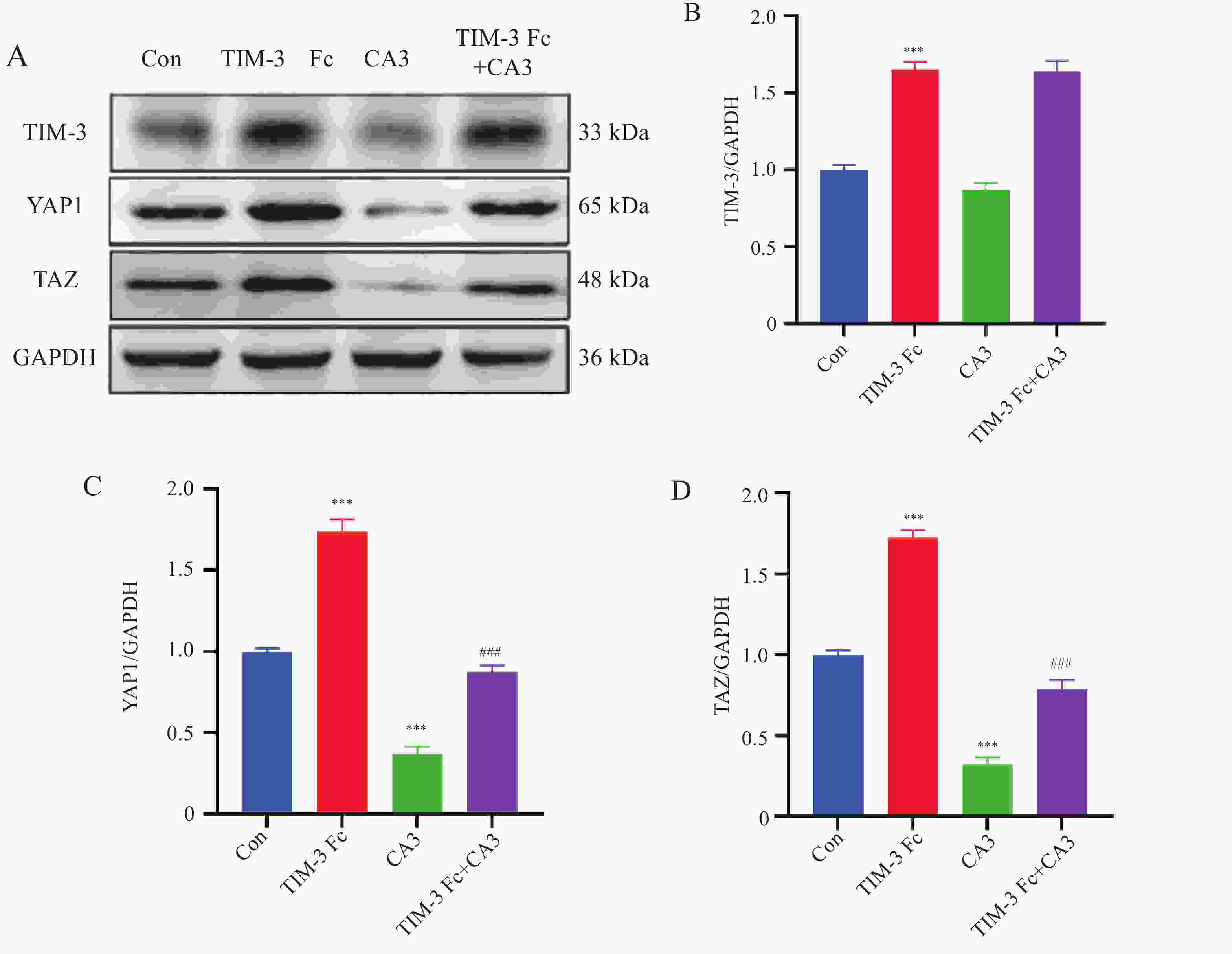 A:TIM-3、Hippo通路蛋白印迹图;B:TIM-3蛋白分子表达量分析;C:YAP1蛋白分子表达量分析;D:TAZ蛋白分子表达量分析;与Con组相比,***P < 0.001;与TIM-3 Fc组相比,###P < 0.001。