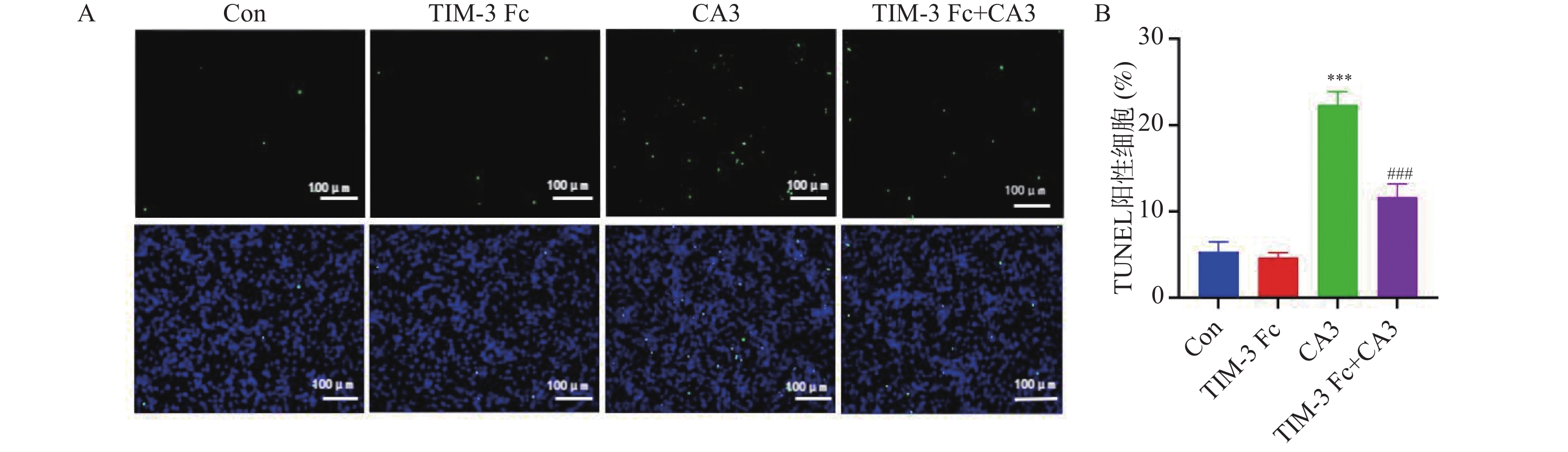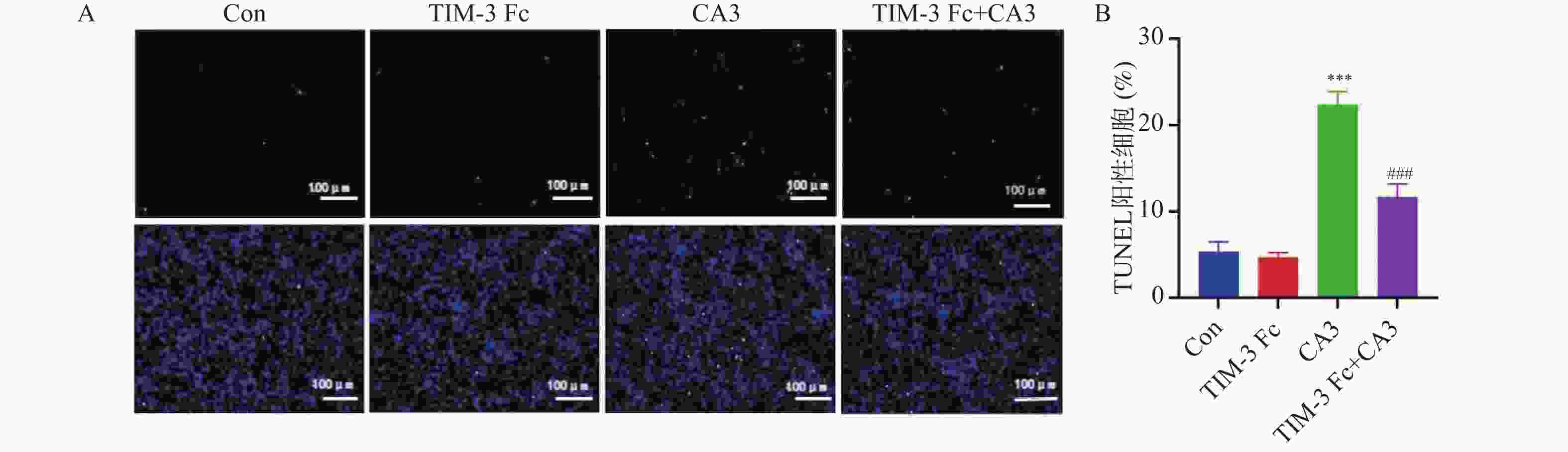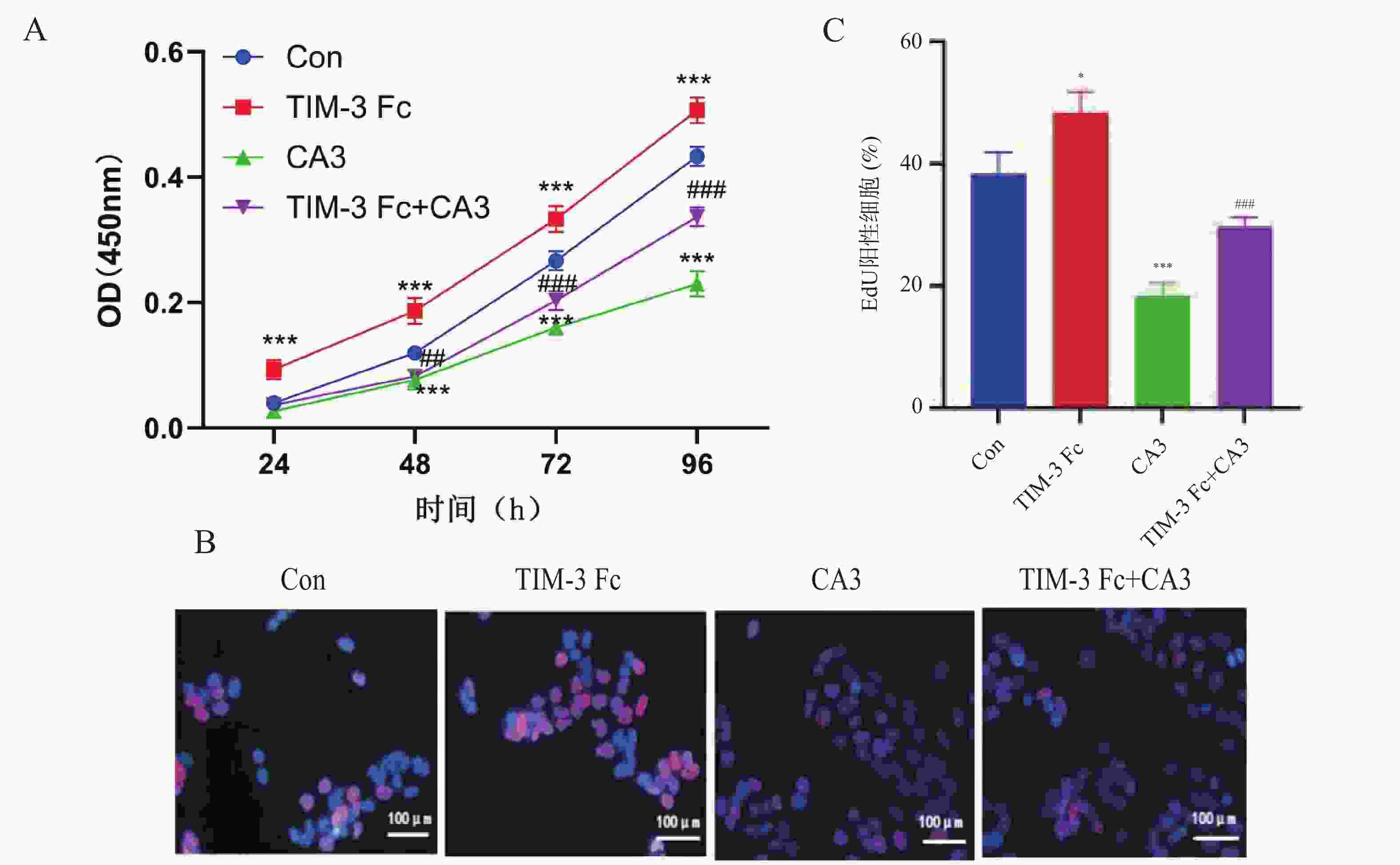 A:CCK-8分析不同时间点HTR-8/SVneo细胞的活力;B:EdU分析HTR-8/SVneo细胞的增殖能力;C:HTR-8/SVneo细胞的增殖能力定量分析;与Con组相比,*P < 0.05;***P < 0.001;与TIM-3 Fc组相比,###P < 0.001。