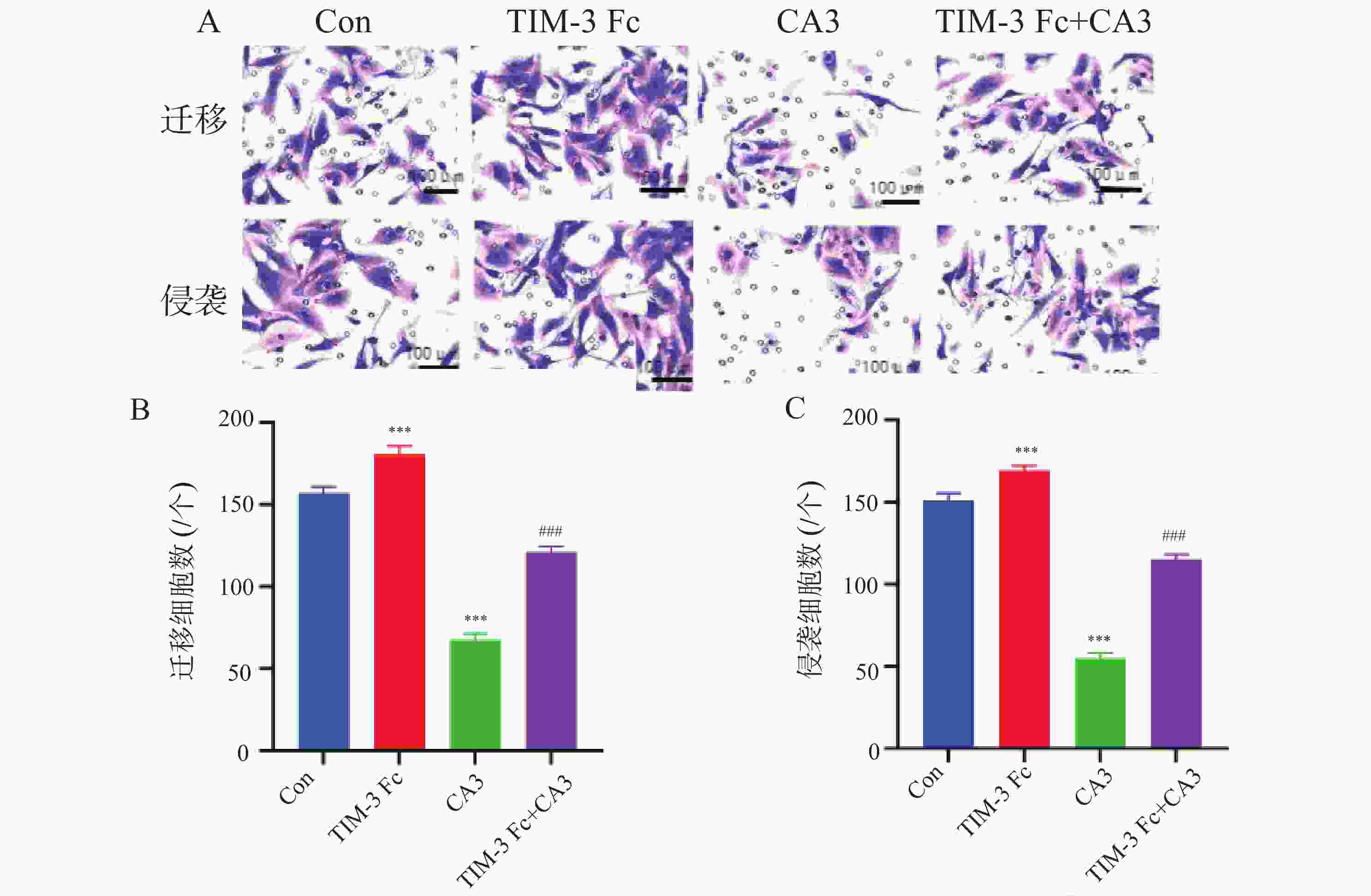 A:Transwell法分析TIM-3 Fc对HTR8/SVneo细胞迁移、侵袭图;B:Transwell法分析TIM-3 Fc对HTR8/SVneo细胞迁移定量分析;C:Transwell法分析TIM-3 Fc对HTR8/SVneo细胞侵袭定量分析;与Con组相比,***P < 0.001;与TIM-3 Fc组相比,###P < 0.001。