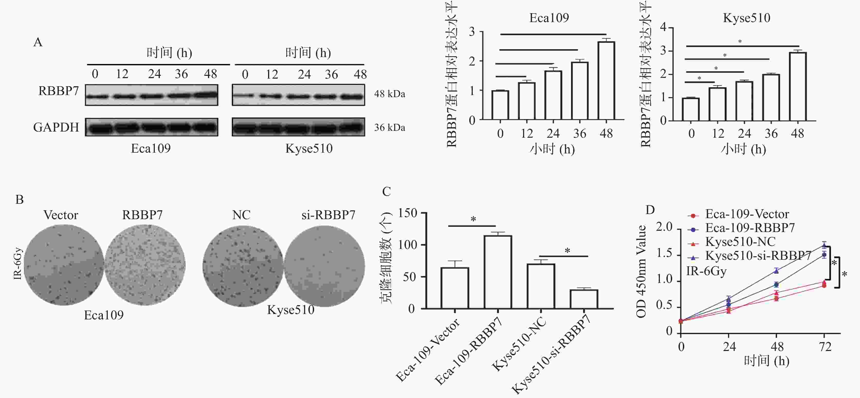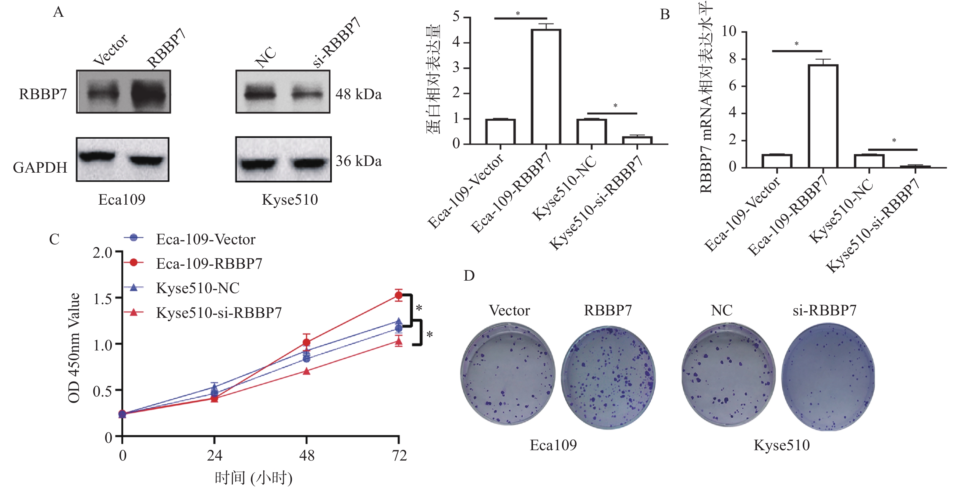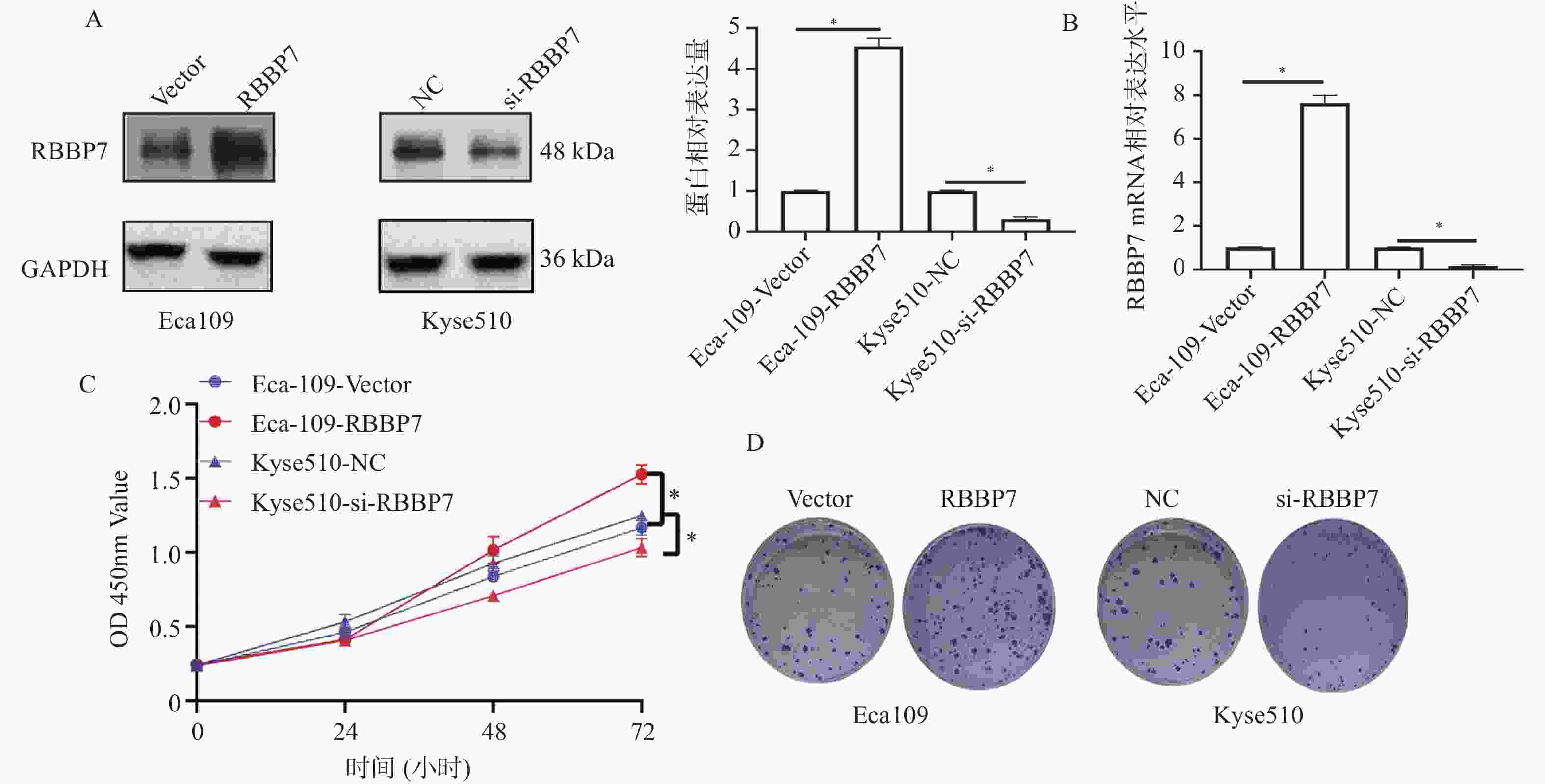 目的 探讨视网膜母细胞瘤结合蛋白7(retinoblastoma-binding protein 7, RBBP7)在食管癌中的表达及影响其进展的分子机制。 方法 收集2018年1月至2019年12月期间蚌埠医科大学附属皖北煤电集团总医院65例结食管癌根治术患者的肿瘤标本及相应的癌旁正常组织标本,通过免疫组化检测RBBP7在食管癌组织中的表达,并进行临床相关性分析。选取Eca109和Kyse510食管癌细胞株利用蛋白印迹实验检测RBBP7在食管癌细胞中的表达水平。通过转染技术将实验分为 Vector组、RBBP7组、NC组、si-RBBP7组。分别通过CCK-8实验,克隆形成实验,Transwell小室实验,划痕实验,蛋白印迹实验,检测RBBP7对食管癌细胞的增殖、侵袭、迁移和放射抵抗的影响及机制。 结果 临床样本免疫组化及食管癌细胞株蛋白印迹实验结果显示,相较于正常癌旁组织,RBBP7在食管癌中高表达(P < 0.05),并且RBBP7高表达食管癌患者预后较差(P < 0.05)。通过体外实验CCK-8及克隆形成实验发现过表达RBBP7促进食管癌细胞增殖(P < 0.05)。Transwell实验及划痕实验发现过表达RBBP7促进食管癌细胞侵袭、迁移及放射抵抗的发生(P < 0.05),反之则抑制食管癌细胞增殖、侵袭、迁移及放射抵抗(P < 0.05)。蛋白印迹实验结果显示,相较于Vector对照组,过表达RBBP7可能通过激活Hippo信号通路调节食管癌的恶性进展及放射抵抗发生(P < 0.05)。 结论 RBBP7通过Hippo信号通路促进食管癌的发展和放射抵抗性。 Abstract:Objective To investigate the expression of retinoblastoma-binding protein 7 (RBBP7) in esophageal cancer and its molecular mechanism affecting its progression. Methods The tumor specimens and corresponding adjacent normal tissue specimens of 65 patients with esophageal cancer undergoing radical resection in the General Hospital of Wanbei Coal and Electricity Group Affiliated to Bengbu Medical University from January 2018 to December 2019 were collected. The expression of RBBP7 in esophageal cancer tissues was detected by immunohistochemistry, and the clinical correlation was analyzed. Eca109 and Kyse510 esophageal cancer cell lines were selected to detect the expression of RBBP7 in esophageal cancer cells by Western blot. The experiments were divided into Vector group, RBBP7 group, NC group and si-RBBP7 group by transfection technology. CCK-8 assay, colony formation assay, Transwell assay, wound healing assay and Western blot were used to detect the effect of RBBP7 on the proliferation, invasion, migration and radioresistance of esophageal cancer cells and its mechanism. Results The results of immunohistochemistry in clinical samples and Western blot in esophageal cancer cell lines showed that RBBP7 was highly expressed in esophageal cancer tissues compared with normal adjacent tissues (P < 0.05), and esophageal cancer patients with high expression of RBBP7 had a poor prognosis (P < 0.05). In the mechanism study, we found that overexpression of RBBP7 promoted the proliferation of esophageal cancer cells by CCK-8 and colony formation assay in vitro (P < 0.05). Overexpression of RBBP7 promoted the invasion, migration, and radioresistance of esophageal cancer cells (P < 0.05), and vice versa inhibited the proliferation, invasion, migration, and radioresistance of esophageal cancer cells (P < 0.05). The results of Western blot showed that compared with the Vector control group, overexpression of RBBP7 may regulate the malignant progression and radioresistance of esophageal cancer by activating Hippo signaling pathway (P < 0.05). Conclusion RBBP7 promotes the development and radioresistance of esophageal cancer through Hippo signaling pathway -