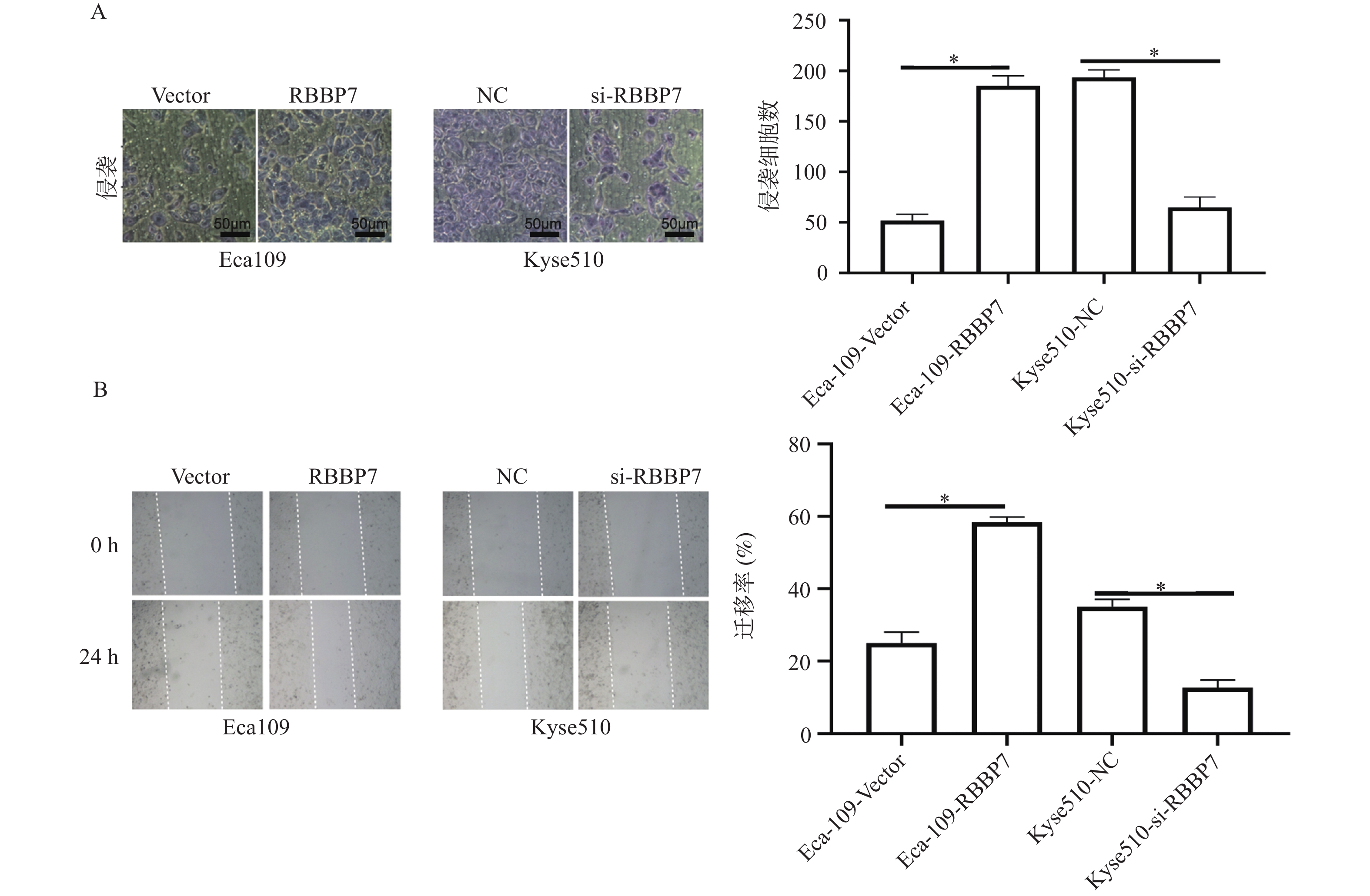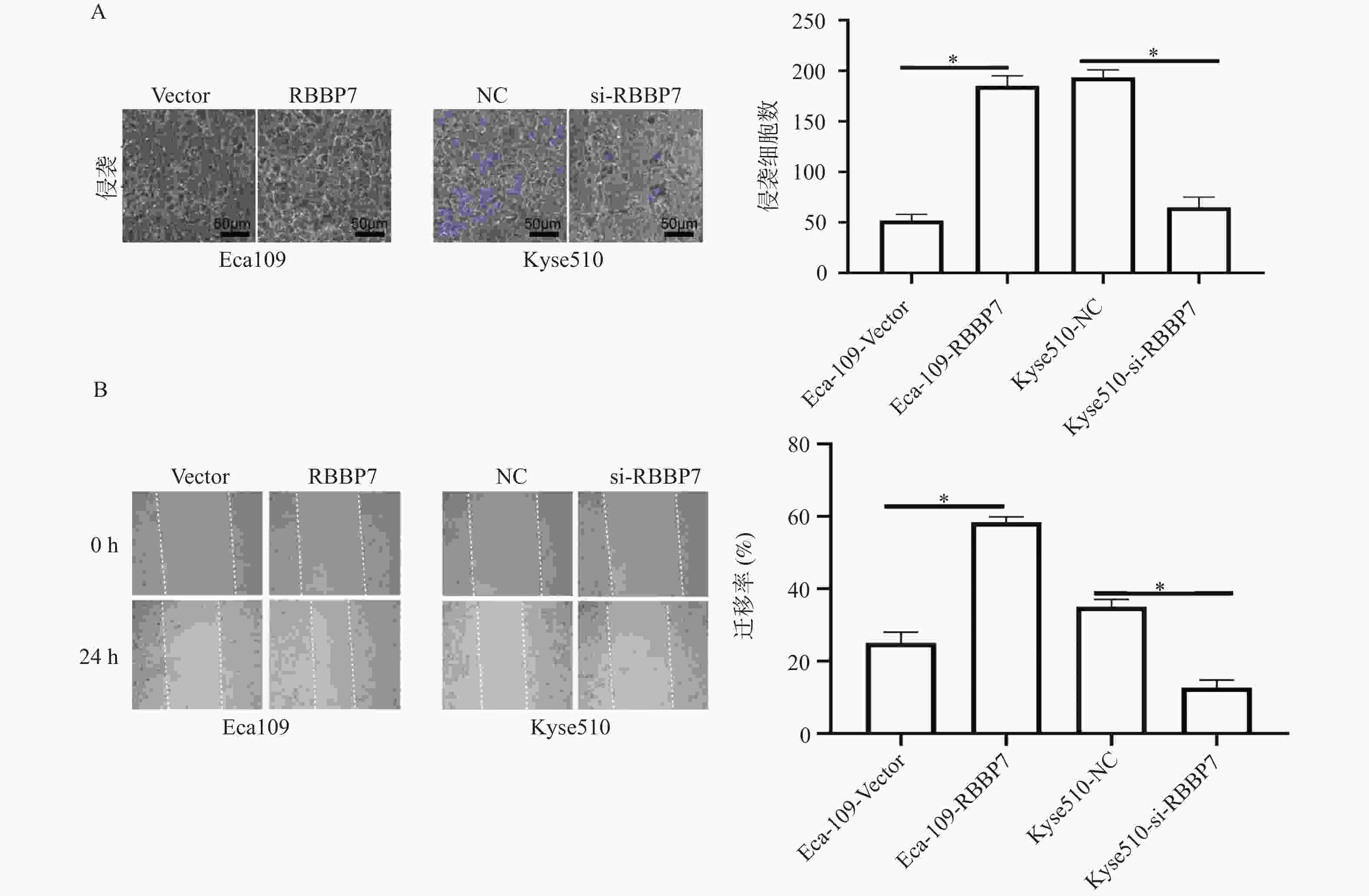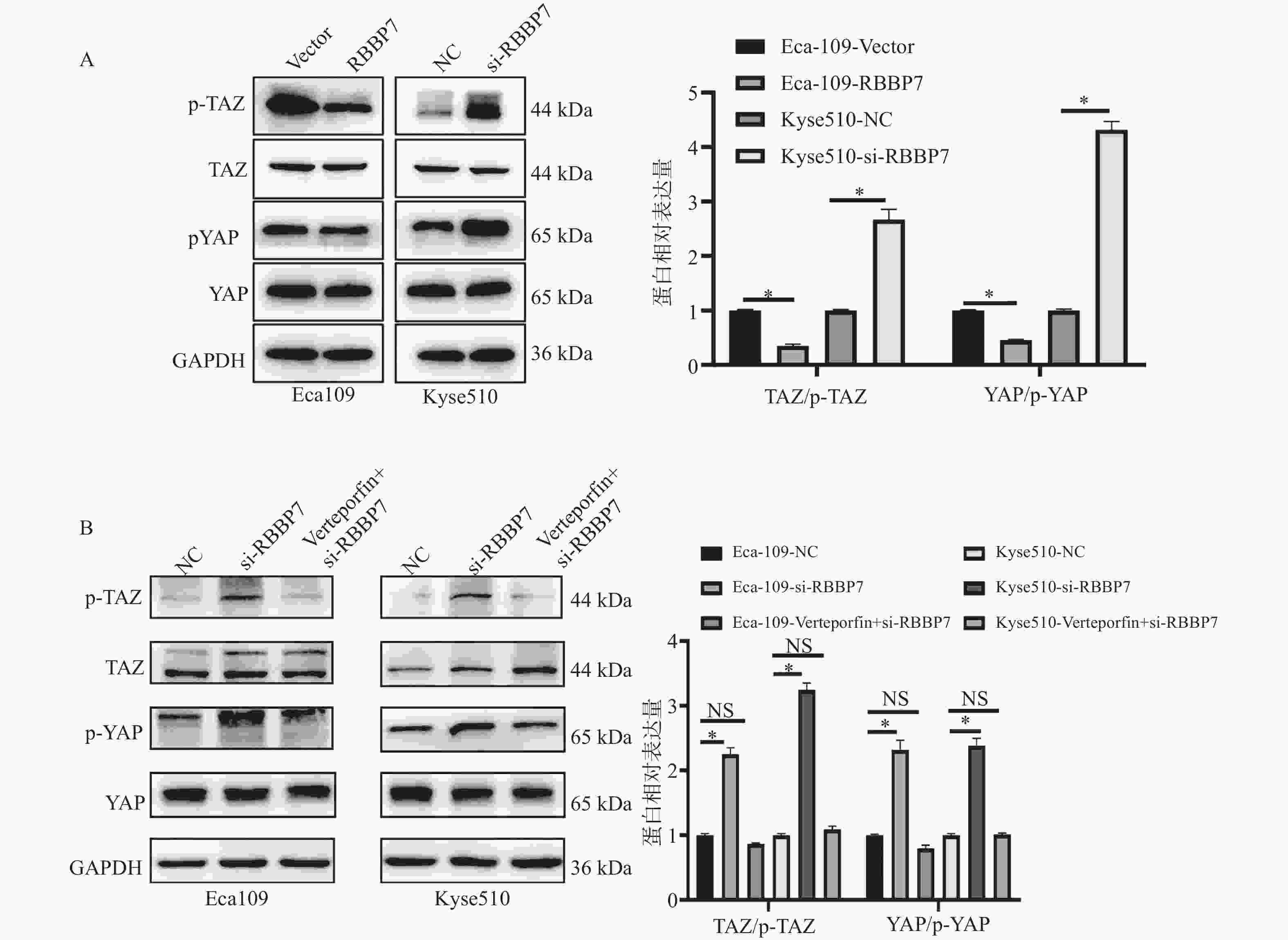 目的 探讨视网膜母细胞瘤结合蛋白7(retinoblastoma-binding protein 7, RBBP7)在食管癌中的表达及影响其进展的分子机制。 方法 收集2018年1月至2019年12月期间蚌埠医科大学附属皖北煤电集团总医院65例结食管癌根治术患者的肿瘤标本及相应的癌旁正常组织标本,通过免疫组化检测RBBP7在食管癌组织中的表达,并进行临床相关性分析。选取Eca109和Kyse510食管癌细胞株利用蛋白印迹实验检测RBBP7在食管癌细胞中的表达水平。通过转染技术将实验分为 Vector组、RBBP7组、NC组、si-RBBP7组。分别通过CCK-8实验,克隆形成实验,Transwell小室实验,划痕实验,蛋白印迹实验,检测RBBP7对食管癌细胞的增殖、侵袭、迁移和放射抵抗的影响及机制。 结果 临床样本免疫组化及食管癌细胞株蛋白印迹实验结果显示,相较于正常癌旁组织,RBBP7在食管癌中高表达(P < 0.05),并且RBBP7高表达食管癌患者预后较差(P < 0.05)。通过体外实验CCK-8及克隆形成实验发现过表达RBBP7促进食管癌细胞增殖(P < 0.05)。Transwell实验及划痕实验发现过表达RBBP7促进食管癌细胞侵袭、迁移及放射抵抗的发生(P < 0.05),反之则抑制食管癌细胞增殖、侵袭、迁移及放射抵抗(P < 0.05)。蛋白印迹实验结果显示,相较于Vector对照组,过表达RBBP7可能通过激活Hippo信号通路调节食管癌的恶性进展及放射抵抗发生(P < 0.05)。 结论 RBBP7通过Hippo信号通路促进食管癌的发展和放射抵抗性。 Abstract:Objective To investigate the expression of retinoblastoma-binding protein 7 (RBBP7) in esophageal cancer and its molecular mechanism affecting its progression. Methods The tumor specimens and corresponding adjacent normal tissue specimens of 65 patients with esophageal cancer undergoing radical resection in the General Hospital of Wanbei Coal and Electricity Group Affiliated to Bengbu Medical University from January 2018 to December 2019 were collected. The expression of RBBP7 in esophageal cancer tissues was detected by immunohistochemistry, and the clinical correlation was analyzed. Eca109 and Kyse510 esophageal cancer cell lines were selected to detect the expression of RBBP7 in esophageal cancer cells by Western blot. The experiments were divided into Vector group, RBBP7 group, NC group and si-RBBP7 group by transfection technology. CCK-8 assay, colony formation assay, Transwell assay, wound healing assay and Western blot were used to detect the effect of RBBP7 on the proliferation, invasion, migration and radioresistance of esophageal cancer cells and its mechanism. Results The results of immunohistochemistry in clinical samples and Western blot in esophageal cancer cell lines showed that RBBP7 was highly expressed in esophageal cancer tissues compared with normal adjacent tissues (P < 0.05), and esophageal cancer patients with high expression of RBBP7 had a poor prognosis (P < 0.05). In the mechanism study, we found that overexpression of RBBP7 promoted the proliferation of esophageal cancer cells by CCK-8 and colony formation assay in vitro (P < 0.05). Overexpression of RBBP7 promoted the invasion, migration, and radioresistance of esophageal cancer cells (P < 0.05), and vice versa inhibited the proliferation, invasion, migration, and radioresistance of esophageal cancer cells (P < 0.05). The results of Western blot showed that compared with the Vector control group, overexpression of RBBP7 may regulate the malignant progression and radioresistance of esophageal cancer by activating Hippo signaling pathway (P < 0.05). Conclusion RBBP7 promotes the development and radioresistance of esophageal cancer through Hippo signaling pathway -