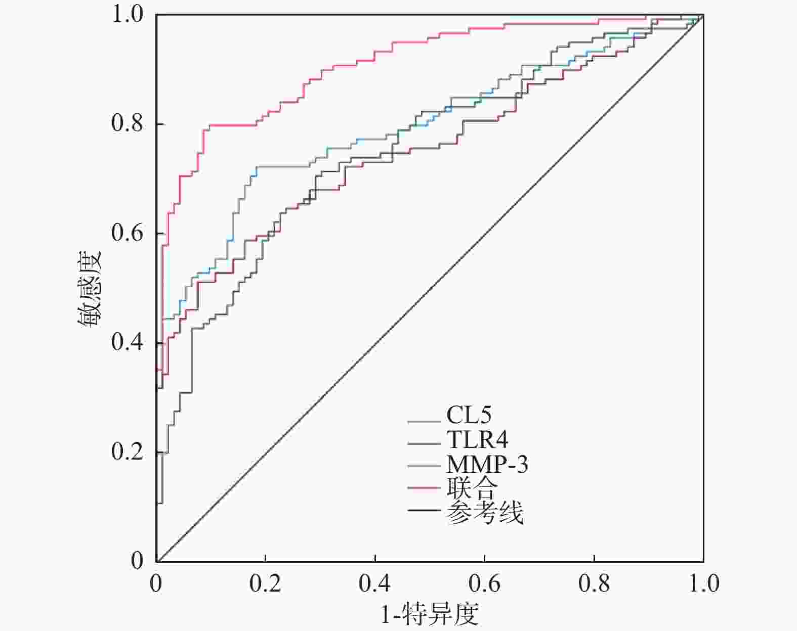 指标 重度GA组(n=119) 轻中度GA组(n=93) t P CXCL5(pg/mL) 756.34 ± 214.73 426.85 ± 113.65 13.399 <0.001* TLR4(ng/mL) 14.63 ± 3.25 7.15 ± 1.69 20.160 <0.001* MMP-3(ng/mL) 15.09 ± 3.62 10.16 ± 2.17 11.602 <0.001* β-CTX(ng/mL) 1.45 ± 0.23 1.10 ± 0.18 12.067 <0.001* RANKL(pg/mL) 123.46 ± 48.71 178.52 ± 56.19 7.633 <0.001* TRACP5b(ng/mL) 3.85 ± 1.06 2.76 ± 0.64 8.746 <0.001* sICAM-1(pg/mL) 175.63 ± 30.45 114.28 ± 13.86 18.019 <0.001* sVCAM-1(pg/mL) 214.96 ± 35.62 134.18 ± 15.21 20.453 <0.001* *P < 0.05;均符合正态分布,方差齐(P > 0.05)。 表 4 CXCL5、TLR4、MMP-3预测价值