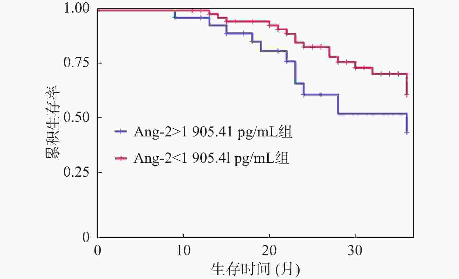 变量 单变量分析 多变量分析 HR 95%CI P HR 95%CI P 年龄(<60岁或≥60岁) 1.255 0.507~1.726 0.382 吸烟(否或是) 1.156 0.618~1.543 0.421 进行体育锻炼(是或否) 1.034 0.645~1.634 0.808 合并COPD(否或是) 1.892 1.150~3.074 0.012* 2.064 1.451~2.833 0.001* 肺结核史(否或是) 1.631 1.053~2.394 0.031* 1.232 0.861~1.672 0.387 Ang-2(< 1905.41 pg/mL或≥1905.41 pg/mL)1.761 1.245~2.482 0.017* 1.915 1.144~2.965 0.009* *P < 0.05。 -