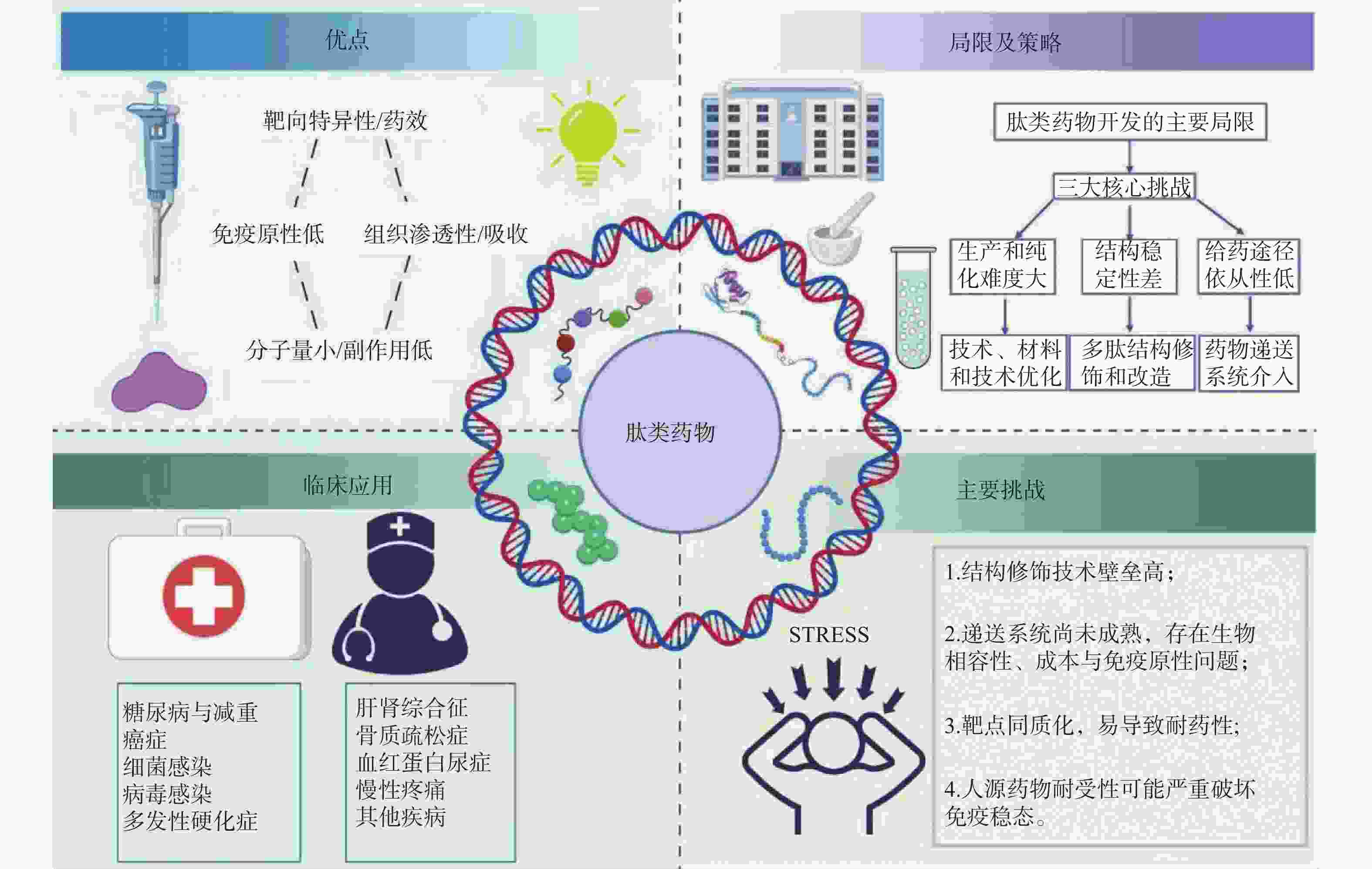 摘要: 随着传统化学药物研发难度的不断增加,肽类药物因具有高特异性、显著疗效、易代谢及低毒性等优势,逐渐成为药物研究与开发的热点。系统阐述了肽类药物的理化特性、主要优势及局限性,并总结了目前常用的结构修饰与递送策略。重点介绍了已获批上市肽类药物在糖尿病、癌症、细菌和病毒感染、多发性硬化症、骨质疏松症等多种疾病中的应用及其作用靶点。同时,对肽类药物在体内稳定性差、生物利用度低、给药途径受限等研发难题进行了分析,并探讨了基于分子修饰、纳米递送及计算机辅助设计等新技术的前景。综上,肽类药物在多领域治疗中展现出独特优势,但仍需突破制备、递送及耐药性等瓶颈,为未来精准治疗提供新的思路与方向。Abstract: With the increasing difficulty of traditional chemical drug research and development, peptide drugs have gradually become a hot spot in drug research and development due to their advantages of high specificity, significant efficacy, easy metabolism and low toxicity. This review systematically expounds the physicochemical properties, main advantages and limitations of peptide drugs, and summarizes the currently common strategies for structural modification and delivery. It focuses on the application and target of approved peptide drugs in various diseases such as diabetes, cancer, bacterial and viral infections, multiple sclerosis, and osteoporosis. Furthermore, the research analyzes the challenges in the research and development of peptide drugs, including poor in vivo stability, low bioavailability, and limited routes of administration. It also discusses the prospects of new technologies based on molecular modification, nanodelivery systems, and computer-aided design. In summary, peptide drugs have shown unique advantages in multi-field therapy, but they still need to break through bottlenecks in preparation, delivery and drug resistance to provide new ideas and directions for future precision therapy.