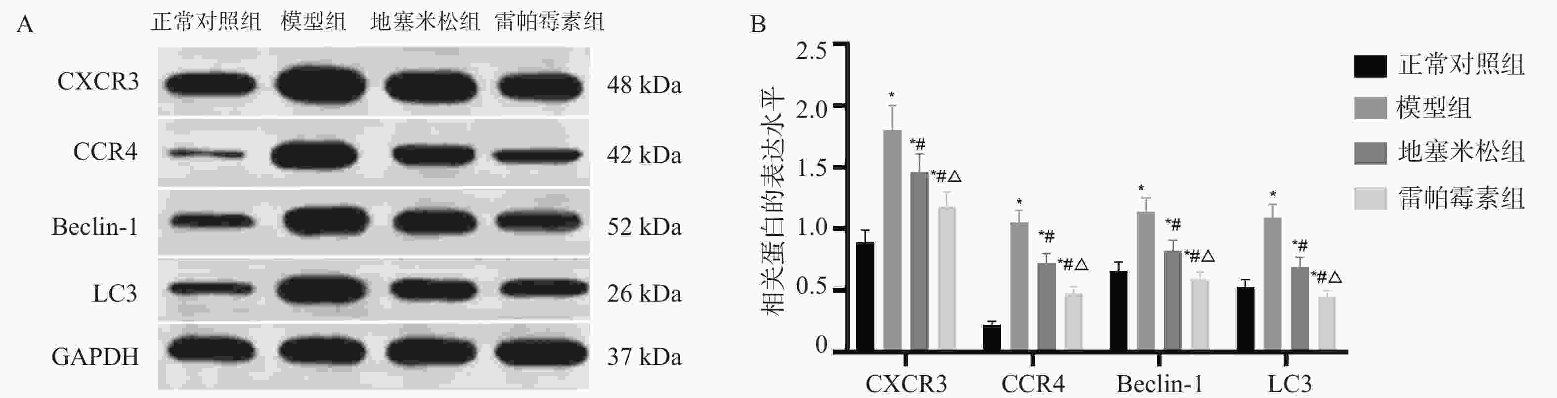 目的 探讨雷帕霉素诱导氧化应激对甲状腺炎大鼠的影响。 方法 构建甲状腺炎大鼠模型,雷帕霉素干预。比色法检测大鼠甲状腺组织中活性氧(reactive oxygen species,ROS)、谷胱甘肽(glutathione,GSH)水平;HE染色观察病理形态;PCR检测大鼠甲状腺组织中CXC趋化因子受体3(C-X-C motif chemokine receptor 3,CXCR3)、C-C趋化因子受体4(C-C chemokine receptor 4,CCR4)表达;免疫组化检测大鼠甲状腺组织中,雷帕霉素靶蛋白(mTOR)磷酸化水平、自噬蛋白微管相关蛋白1轻链3α-Ⅱ(microtubule-associated protein 1 light chain 3α-Ⅱ,LC3-Ⅱ)蛋白水平;蛋白免疫印迹检测大鼠甲状腺组织中CXCR3、CCR4、Beclin-1、LC3蛋白表达。 结果 与正常对照组相比,模型组大鼠甲状腺组织中ROS、CXCR3、CXCR3表达及p-mTOR阳性细胞数升高(P < 0.05),GSH、CCR4、Beclin-1、LC3、CCR4表达及LC3-Ⅱ阳性细胞数降低(P < 0.05),与模型组相比,地塞米松组和雷帕霉素组ROS、CXCR3、CXCR3表达及p-mTOR阳性细胞数降低(P < 0.05),且雷帕霉素组低于地塞米松组(P < 0.05),GSH、CCR4、Beclin-1、LC3水平、CCR4 mRNA表达及LC3-Ⅱ阳性细胞数升高(P < 0.05),雷帕霉素组高于地塞米松组(P < 0.05)。 结论 雷帕霉素可改善氧化应激水平,抑制p-mTOR表达,提高LC3-Ⅱ水平及甲状腺炎大鼠的细胞自噬,调节CXCR3/CCR4蛋白表达。 Abstract:Objective To investigate the effect of rapamycin-induced oxidative stress on thyroiditis rats. Methods A rat model of thyroiditis was constructed and rapamycin was intervened. The levels of reactive oxygen species (ROS) and glutathione (GSH) in thyroid tissue of rats were detected by colorimetry. HE staining was used to observe the pathological morphology; the expression of chemokine receptor 3 (CXCR3) and C-C chemokine receptor (CCR4) in thyroid tissue of rats was detected by PCR. The phosphorylation level of rapamycin target protein (mTOR) and the level of autophagy protein LC3-II protein in thyroid tissue of rats were detected by immunohistochemistry. Western blot was used to detect the expression of CXCR3, CCR4, Beclin-1 and LC3 protein in thyroid tissue of rats. Results Compared with the normal control group, the levels of ROS, CXCR3, CXCR3 mRNA expression and the number of p-mTOR positive cells in the thyroid tissue of the model group were increased (P < 0.05), while the levels of GSH, CCR4, Beclin-1, LC3, CCR4 mRNA expression and the number of LC3-II positive cells were decreased (P < 0.05). Compared with the model group, the levels of ROS, CXCR3, CXCR3 mRNA expression and the number of p-mTOR positive cells in the dexamethasone group and the rapamycin group were decreased (P < 0.05), and the rapamycin group was lower(P < 0.05). The levels of GSH, CCR4, Beclin-1 and LC3, the expression of CCR4 mRNA and the number of LC3-II positive cells increased (P < 0.05), and the rapamycin group was higher (P < 0.05). Conclusion Rapamycin can improve the level of oxidative stress, inhibit the expression of p-mTOR, increase the level of LC3-II and autophagy in rats with thyroiditis, and regulate the expression of CXCR3/CCR4 protein. -