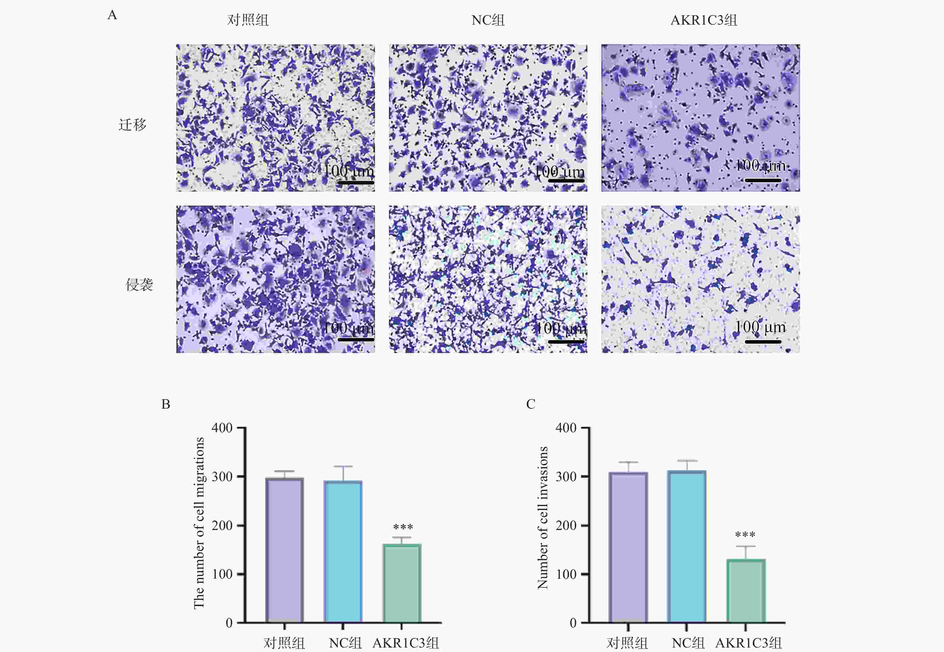 图  3  过表达AKR1C3对MCF-7细胞迁移和侵袭的影响($\bar x \pm s $,n = 3)