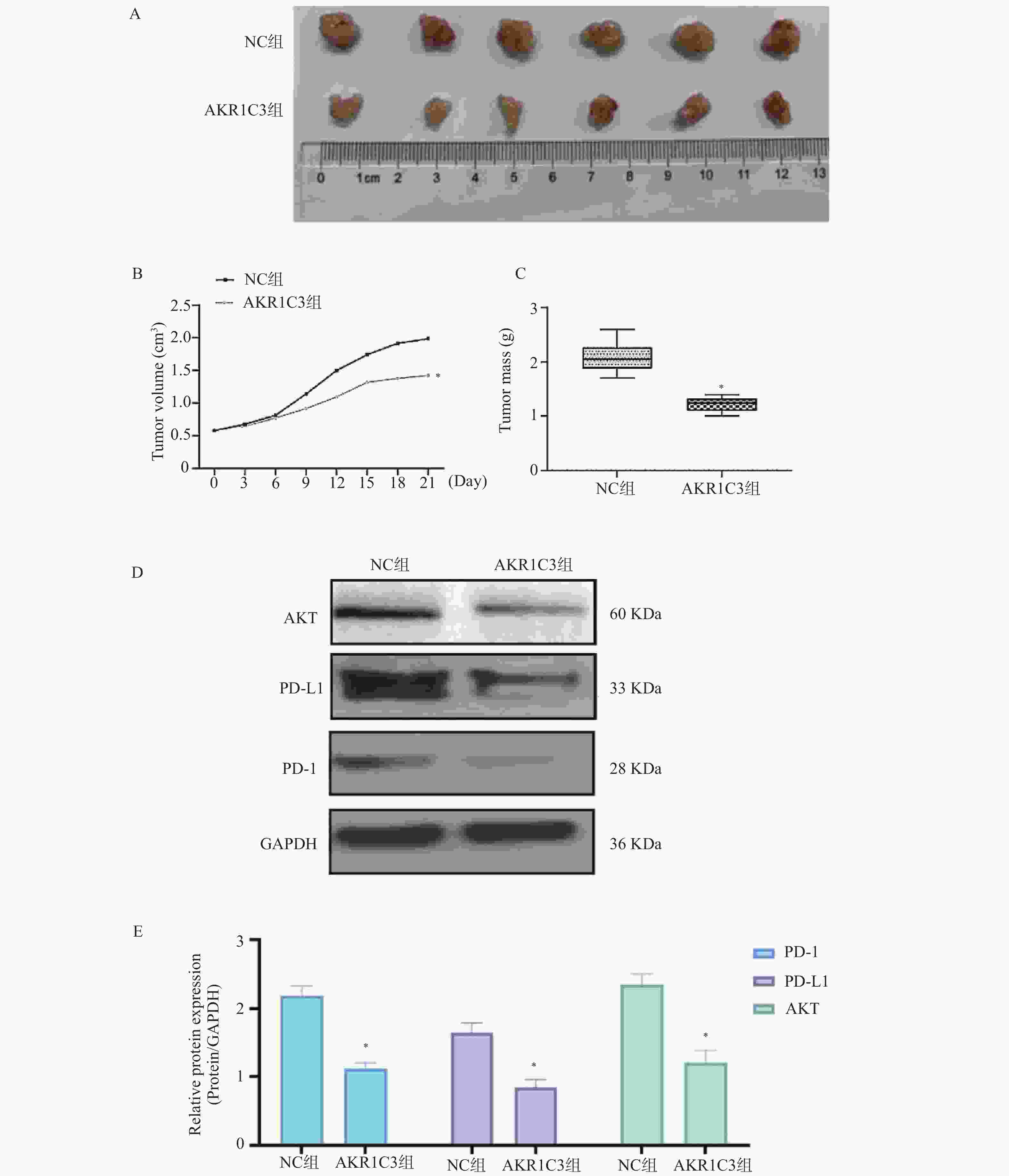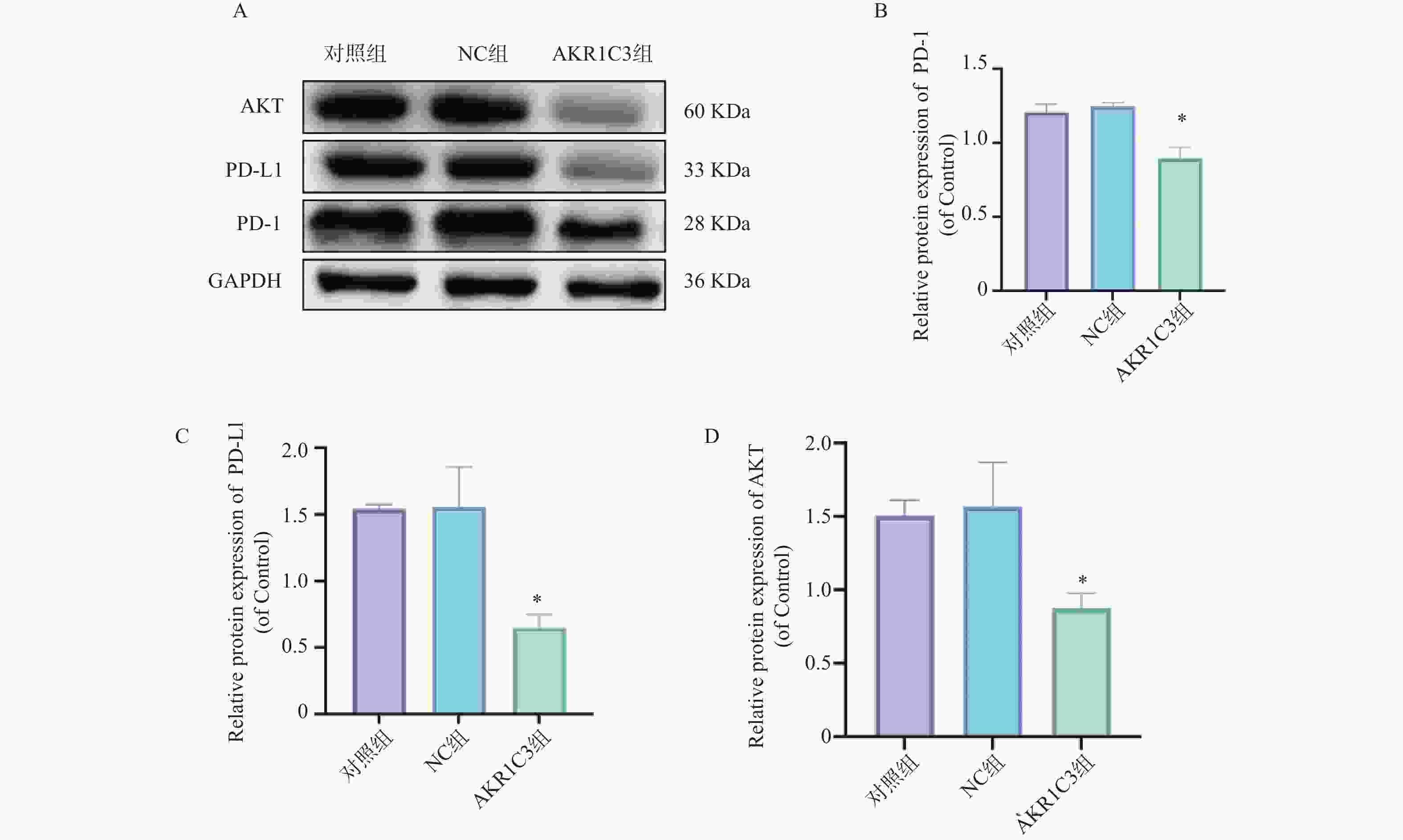 • 摘要:   目的  探索酮还原酶家族1成员C3 (aldo-keto reductase family 1 member C3,AKR1C3)对乳腺癌恶性细胞生物学行为的干预作用及对程序性细胞死亡蛋白/程序性死亡-配体1(programmed cell death protein1/programmed death-ligand1,PD-1/PD-L)通路的影响。  方法  把MCF-7人乳腺癌细胞中NC组和AKR1C3组分别转染空质粒和AKR1C3质粒,采用MTT法检测转染后24 h、48 h、72 h细胞活力;采用流式细胞技术测定各组细胞的存活率以及早期、晚期凋亡比例;通过Transwell实验对各组细胞的迁移和侵袭能力进行检测;通过Western blot检测各组细胞PD-1、PD-L1、蛋白激酶B(protein kinase b,AKT)蛋白表达水平。使用C57BL/6小鼠构建荷瘤模型,将采用人乳腺癌MCF-7细胞转染NC质粒和AKR1C3质粒进行细胞荷瘤,每3 d测量瘤体积,持续21 d,绘制两组小鼠肿瘤生长曲线,并于实验终点测量肿瘤质量。  结果  相较于NC组,AKR1C3组细胞活力降低(P < 0.05),并且具有时间依赖效应(P < 0.05),迁移和侵袭能力降低(P < 0.05),早期凋亡和晚期凋亡比例升高(P < 0.05),PD-1、PD-L1、AKT蛋白表达水平降低(P < 0.05)。动物实验表明,AKR1C3组小鼠肿瘤体积降低,肿瘤质量下降(P < 0.05)。  结论  AKR1C3可以抑制人乳腺癌细胞恶性生物学行为,抑制PD-1/PD-L1信号通路蛋白表达。